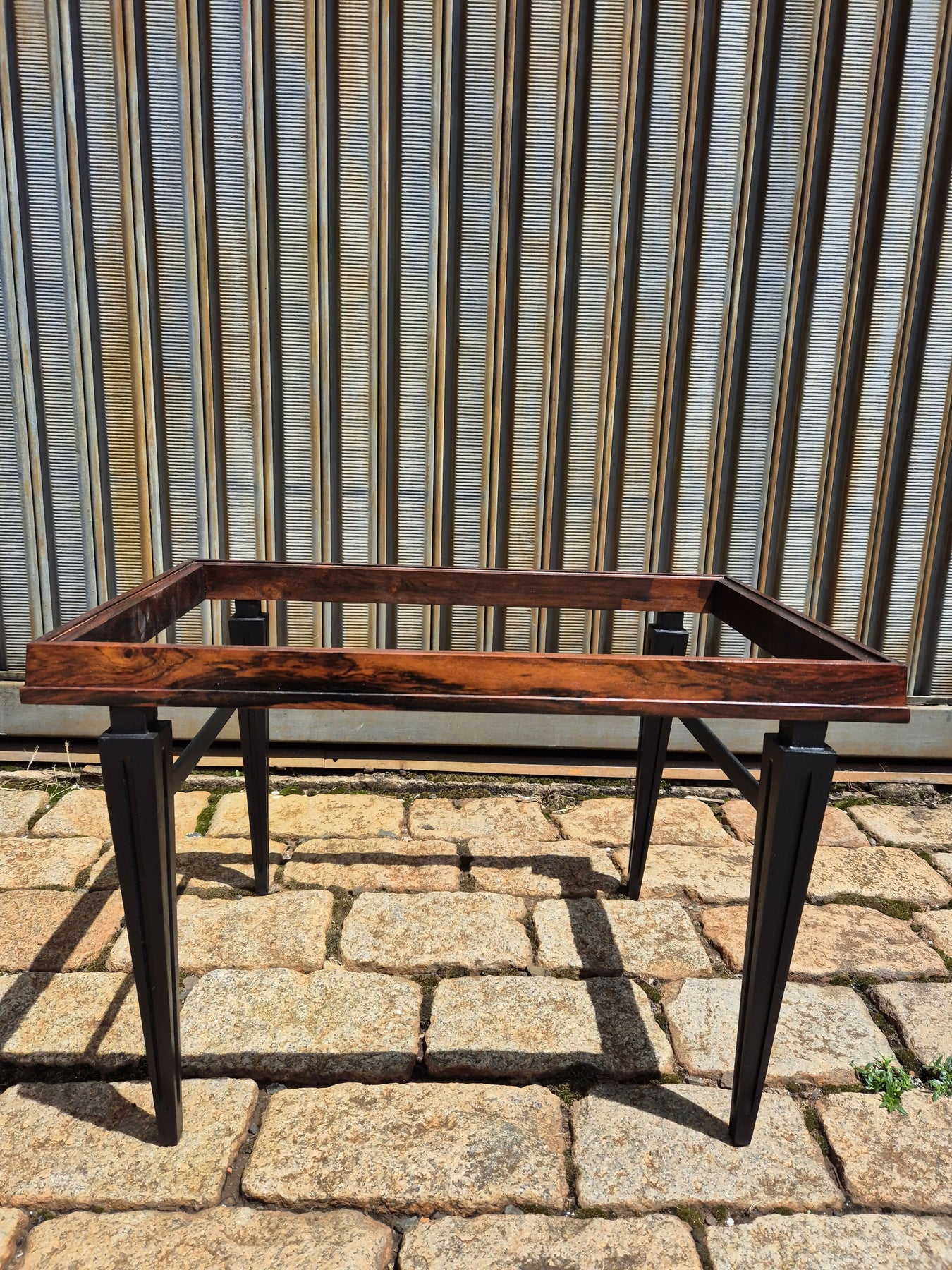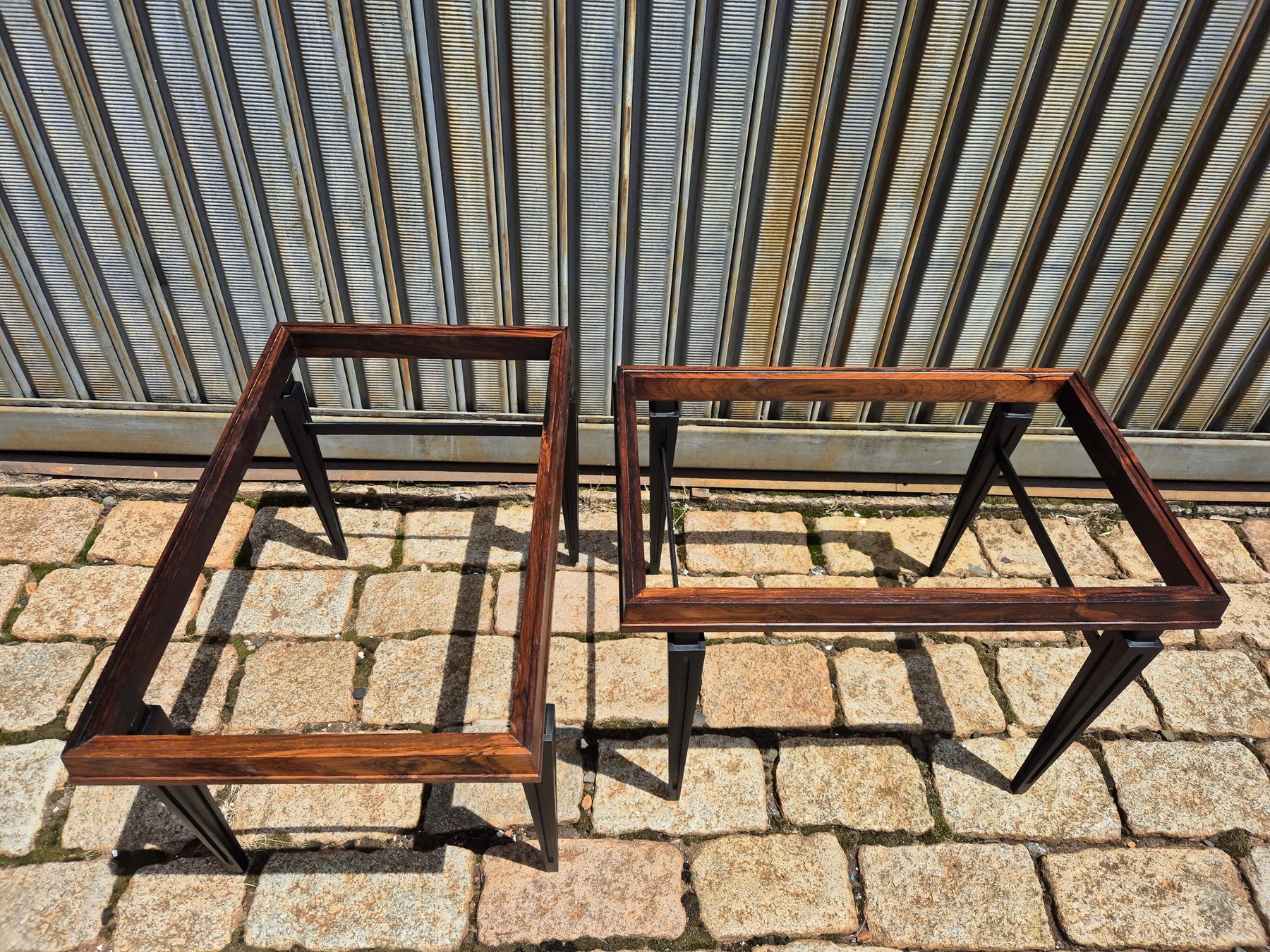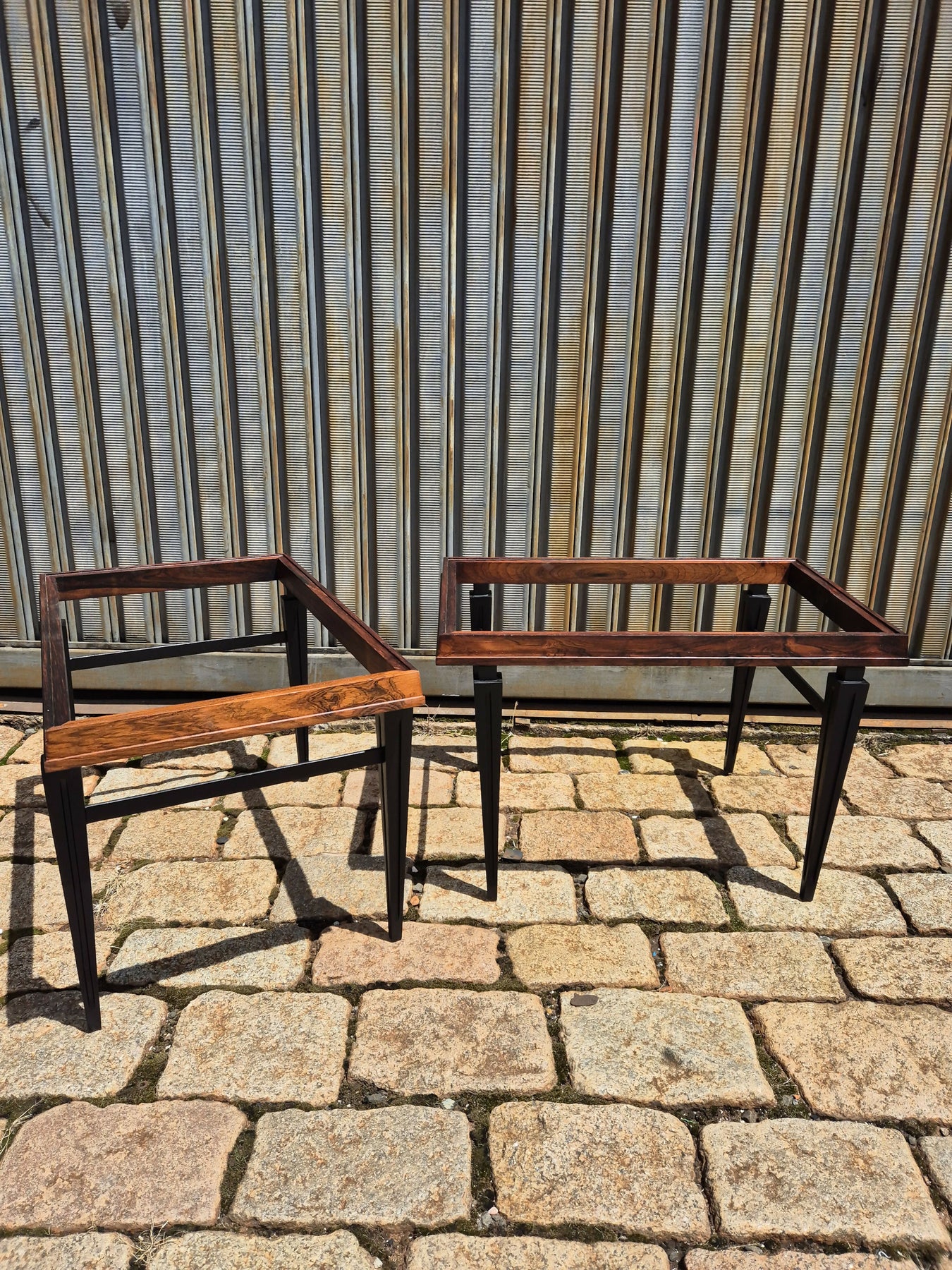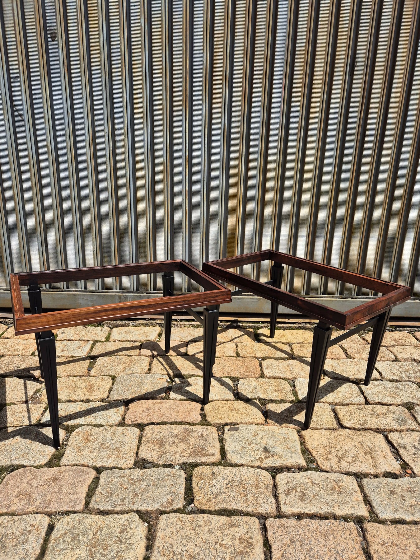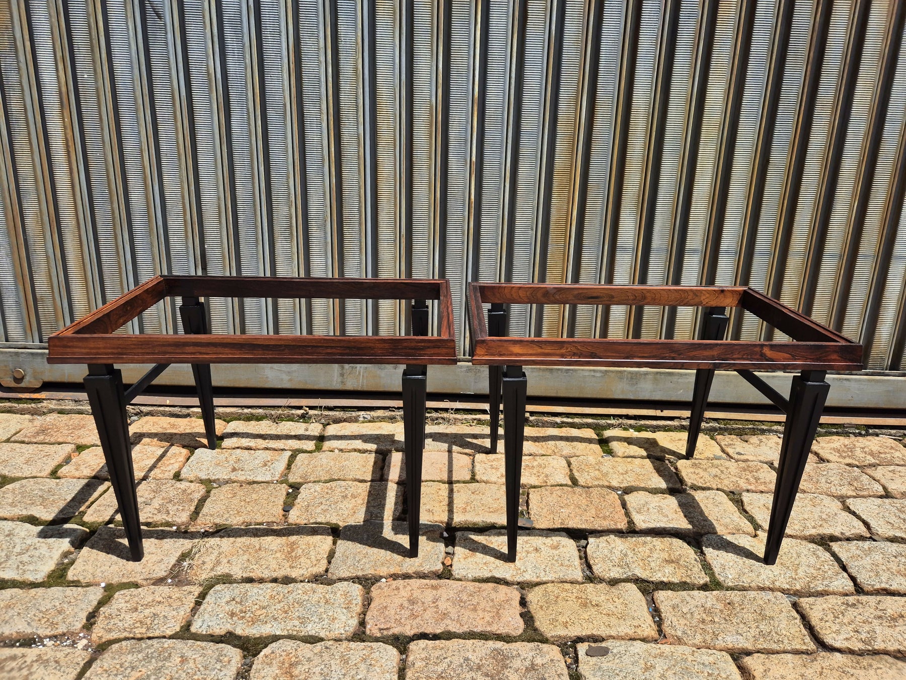 Belo e raro par de mesas de centro/lateral em madeira jacarandá da Bahia, pés ebanizados. O tampo pode ser em vidro ou em mármore, conforme preferir. Possui selo do fabricante, em perfeito estado.