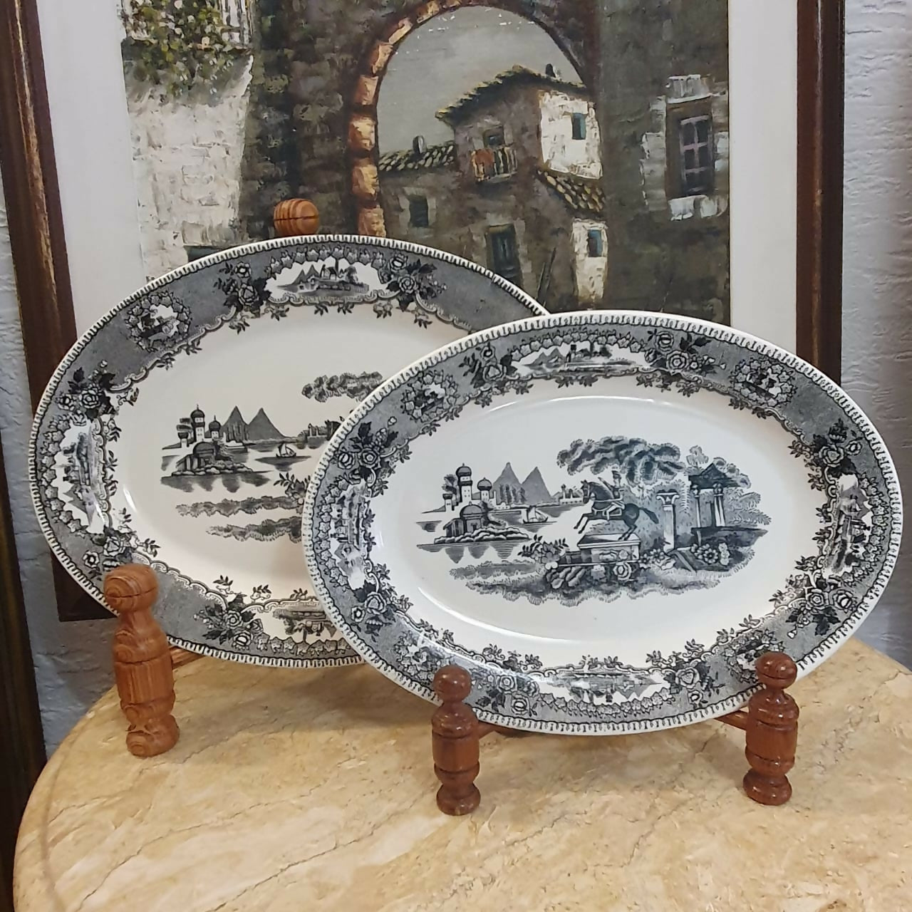 Par de travessas em faiança portuguesa antiga Sacavém, decoração "Estátua " em excelente estado!