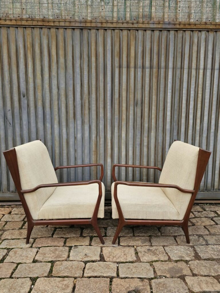 Par de poltronas anos 60, atribuídas ao arquiteto Rino Levi, madeira cabreúva e estofado em veludo de algodão. Restauradas, prontas para uso.