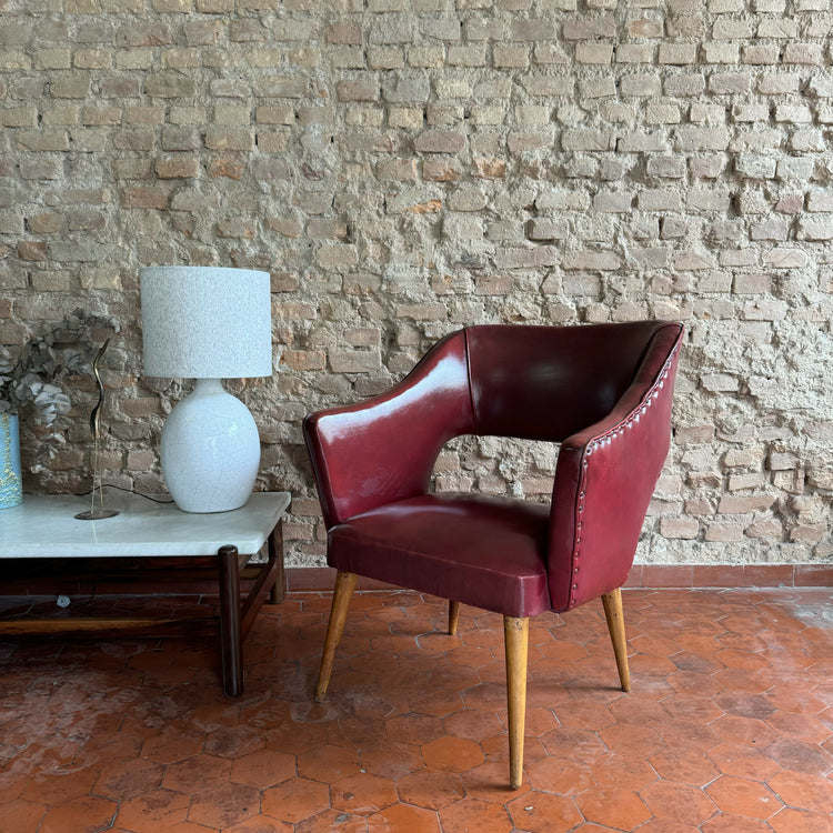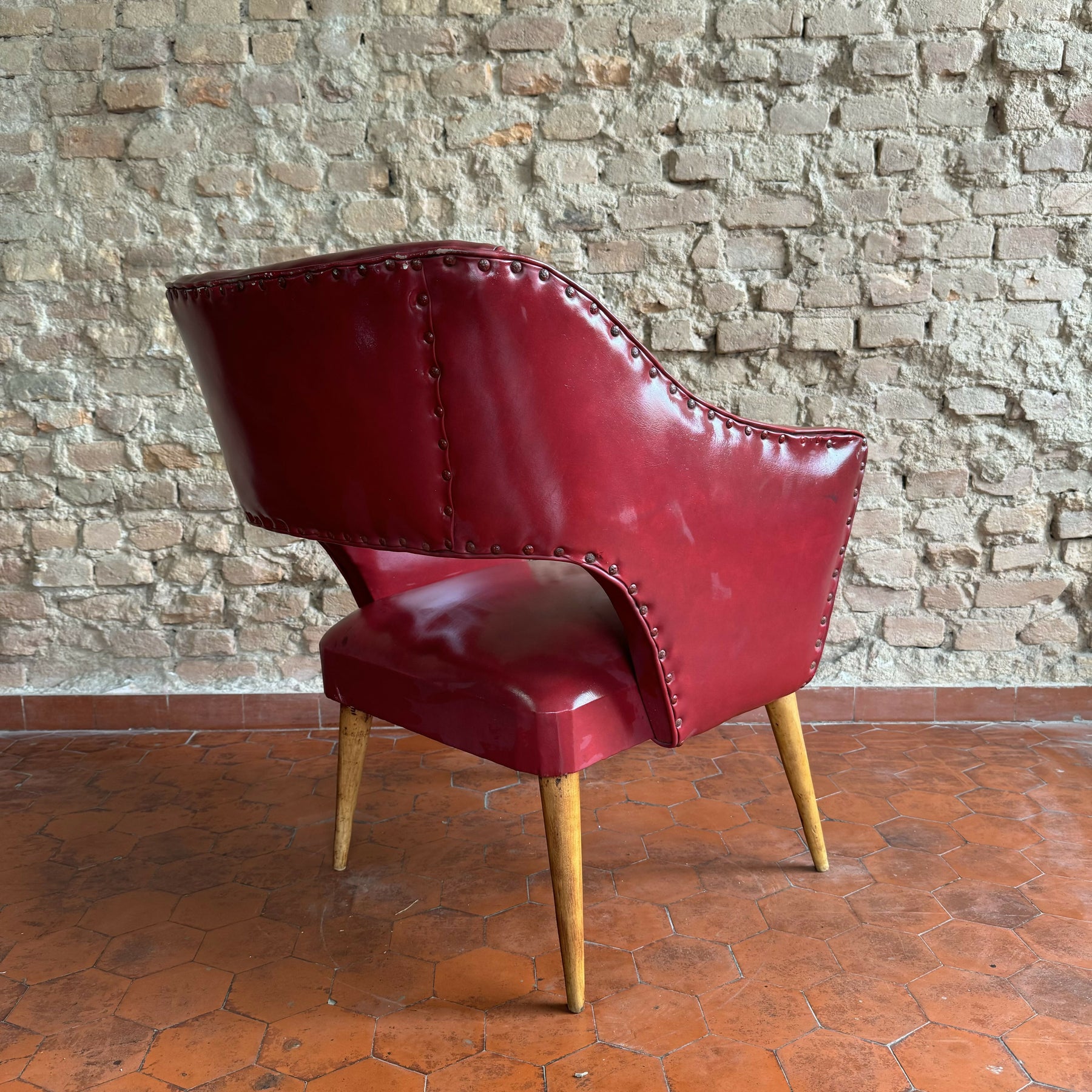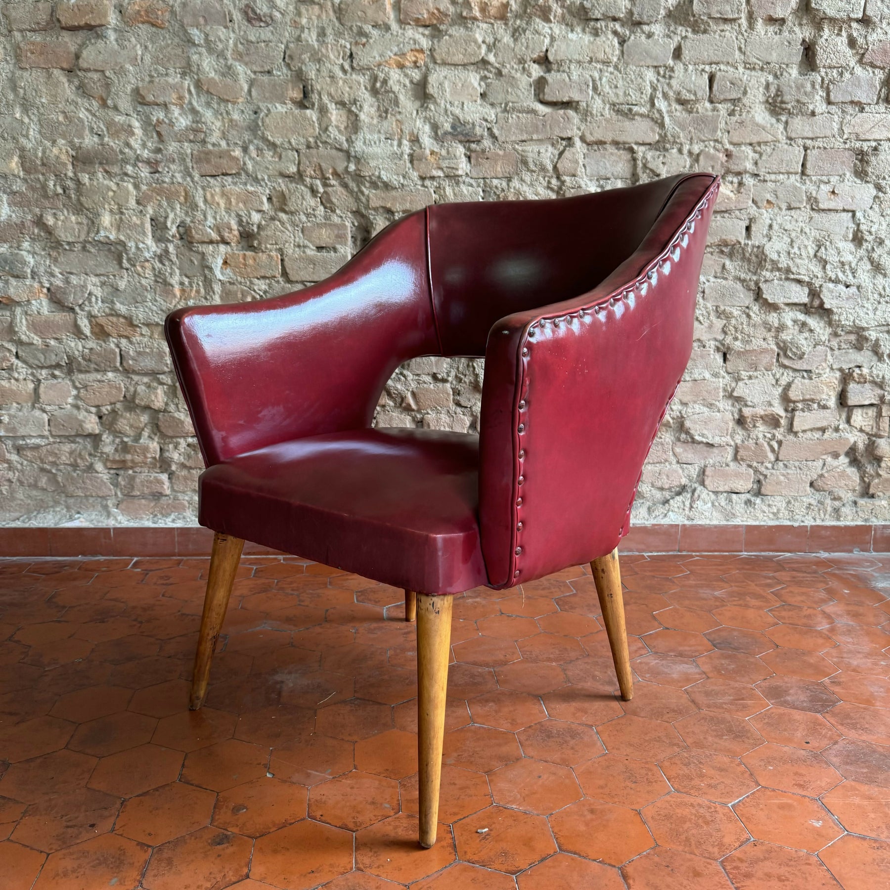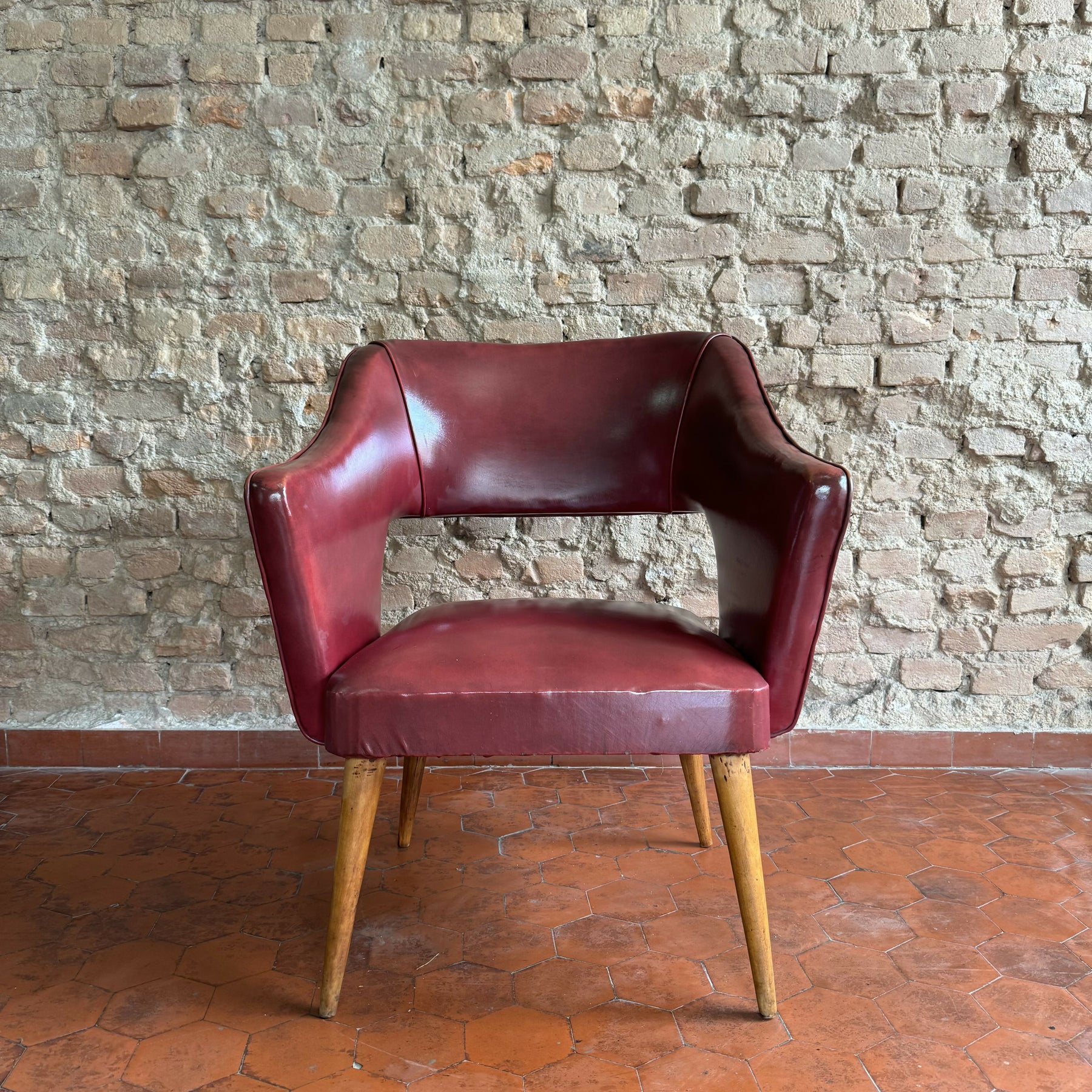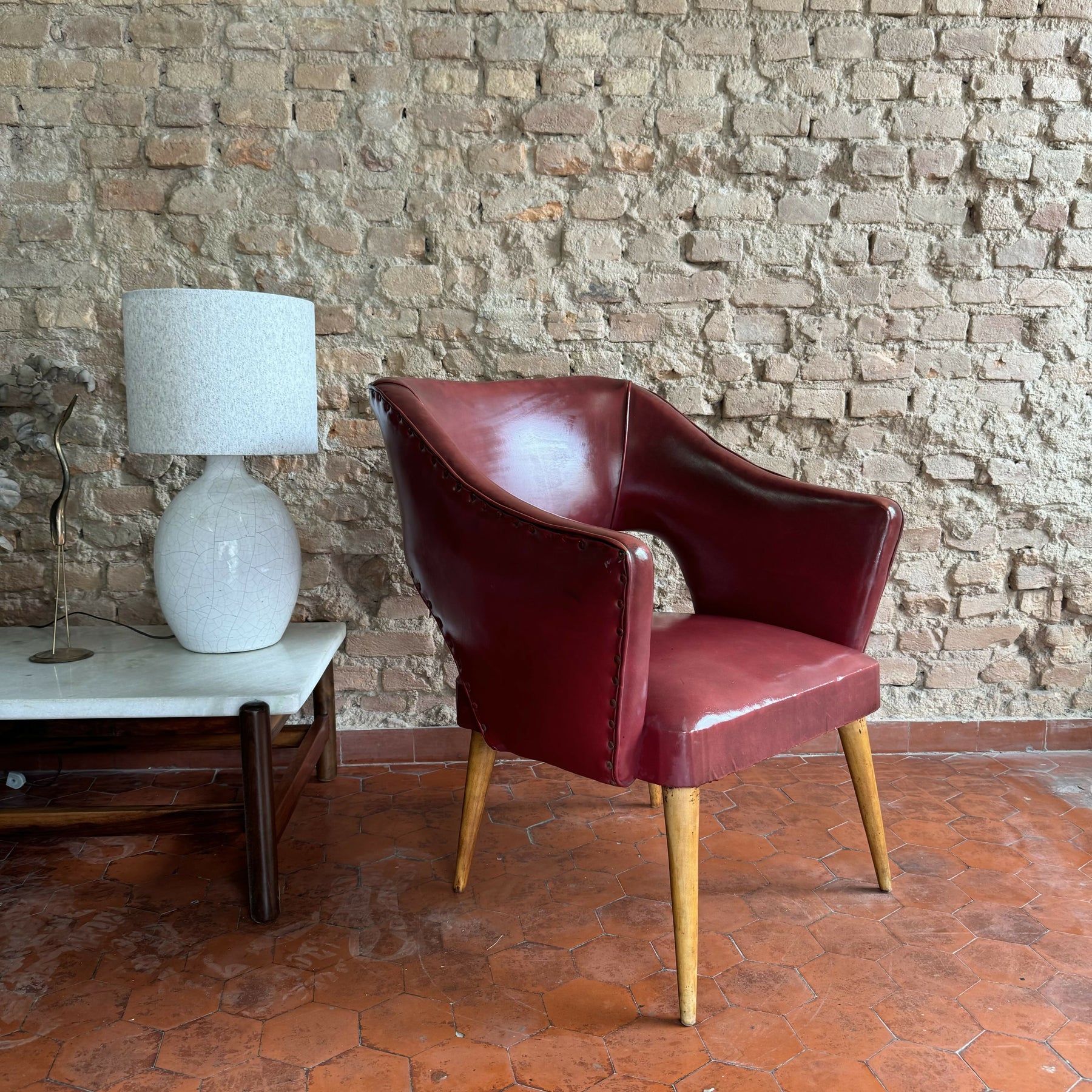 Poltrona solitária anos 50, peça com pés palitos em pau marfim maciço e estofada em courvin original de época avermelhado. Peça em ótimo estado de conservação, apenas com leves sinais do tempo e de uso. Medidas: 66x56x78cm