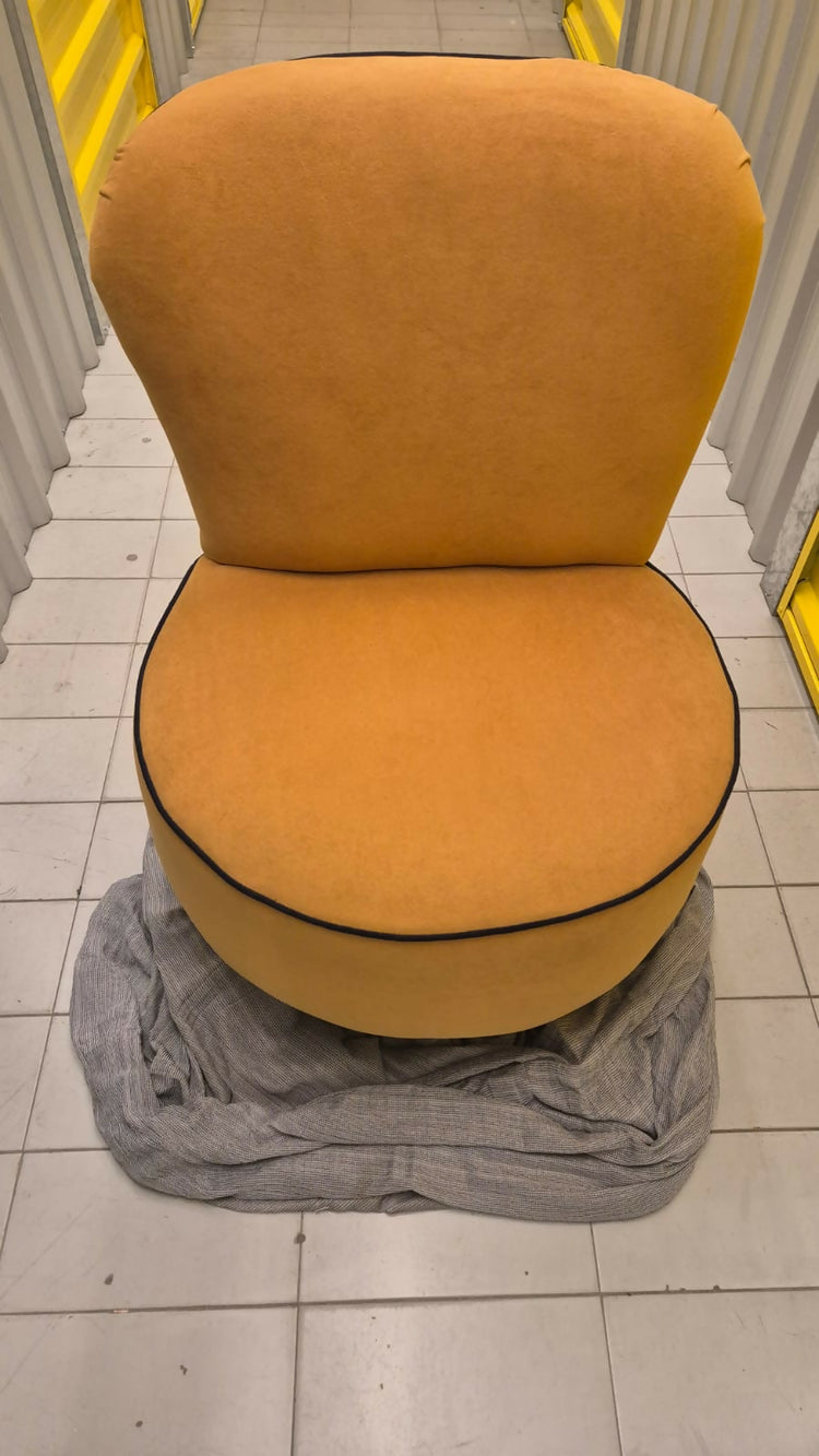 Tecido e estofado novo, na cor mostarda (amarelo) com frisos em azul marinho. Assento confortável, baixo, ideal para compor sala de estar, quartos ou espaços de leitura com personalidade.