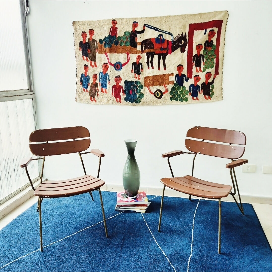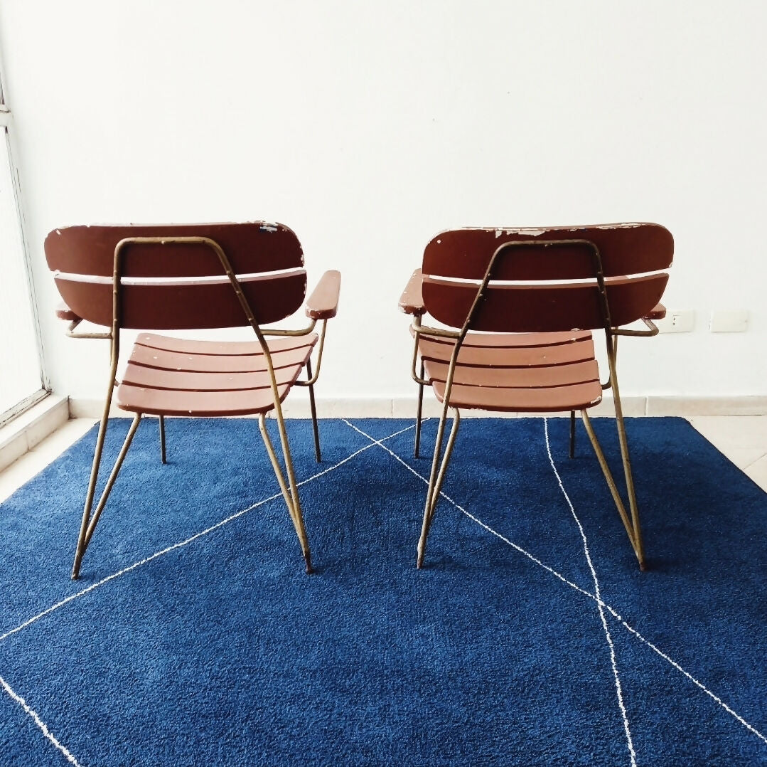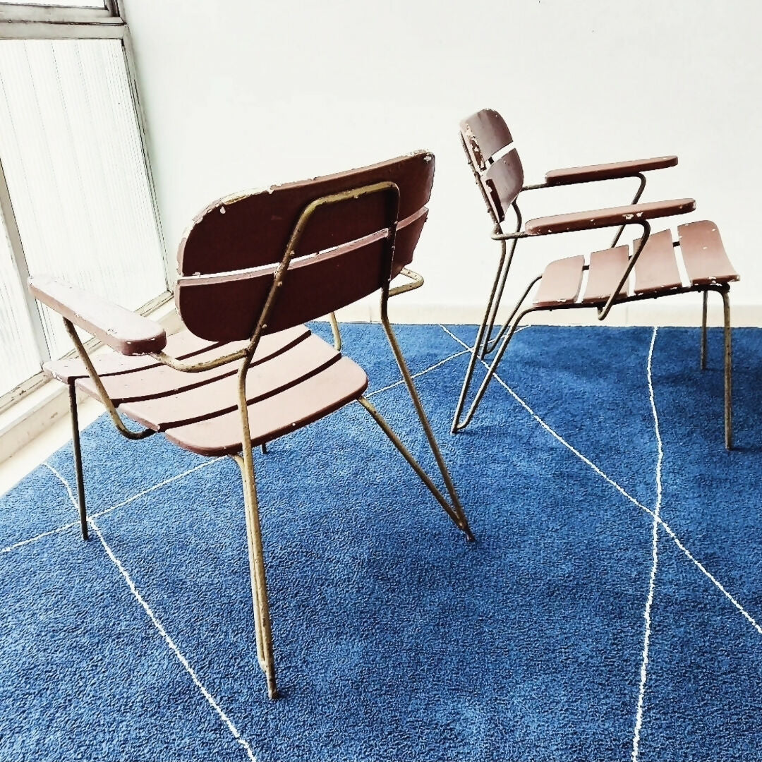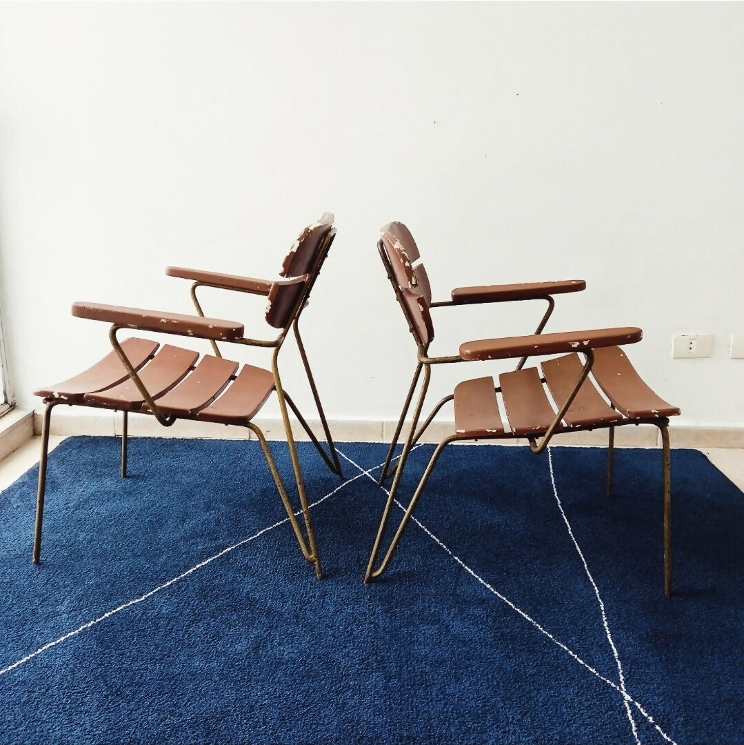 Poltronas de ferro e ripas de madeira, criadas na década de 1950 para Móveis Artesanal - Forma S/A, pelo designer Carlo Hauner.