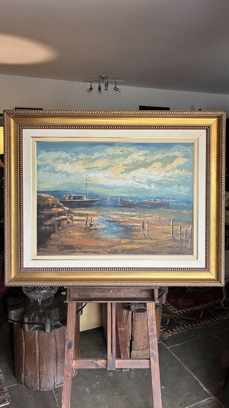 Belíssima pintura retratando paisagem marinha com barcos ancorados e figuras humanas à beira-mar, em composição equilibrada e atmosfera serena. A obra destaca pinceladas expressivas, jogo de luz e cores suaves, criando profundidade e movimento na cena costeira.