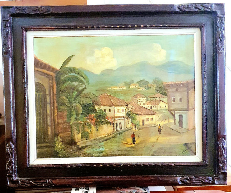 Quadro, óleo sobre tela, que representa uma cena casario em paisagem do interior. Pintura linda, com moldura de madeira nobre trabalhada. Incríveis!