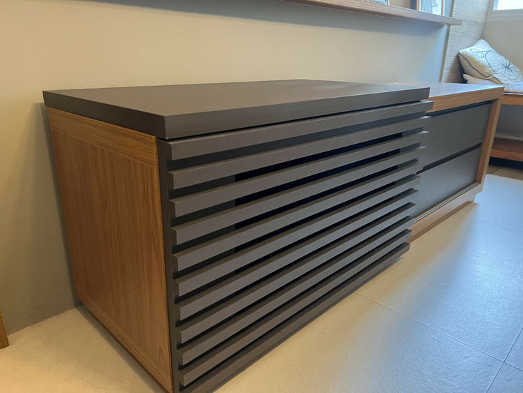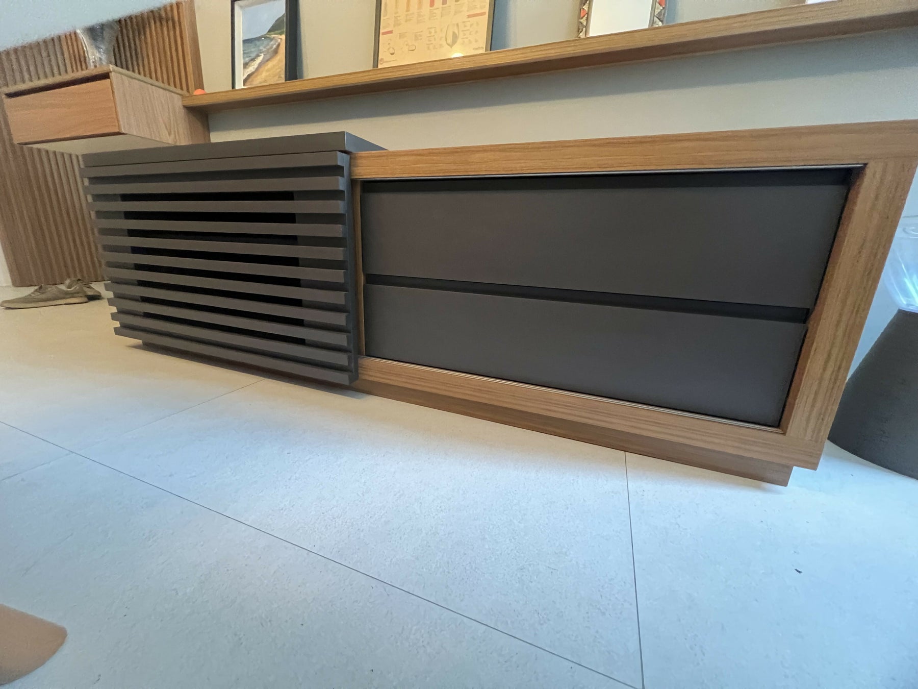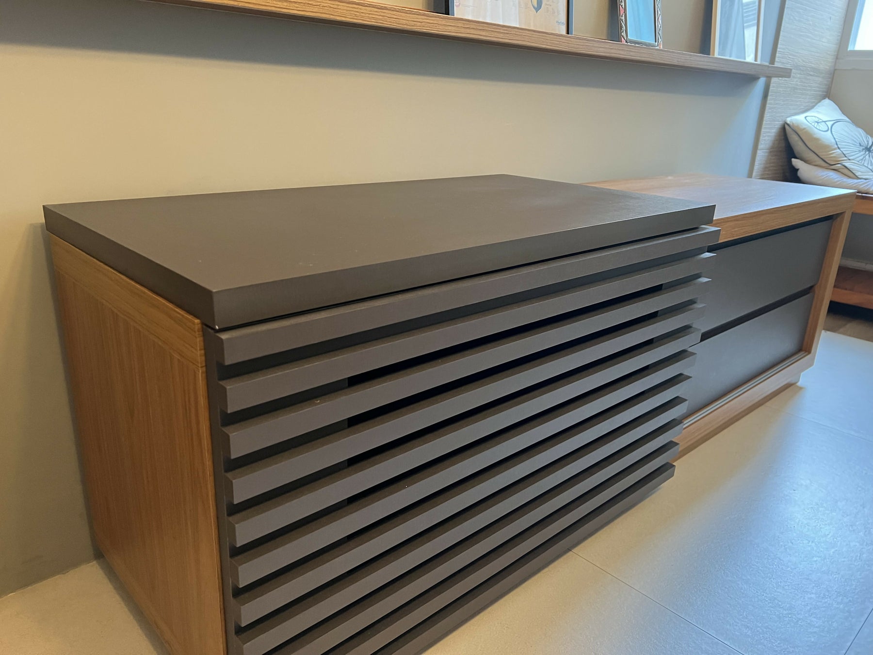 Rack moderno e elegante, ideal para salas e ambientes sofisticados.