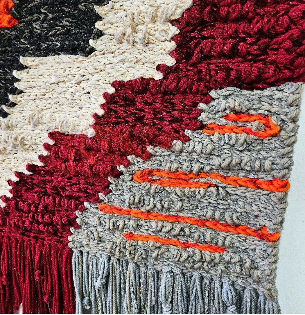 A obra foi confeccionada em lã, juta tingida, seda e ráfia, com suporte em madeira.