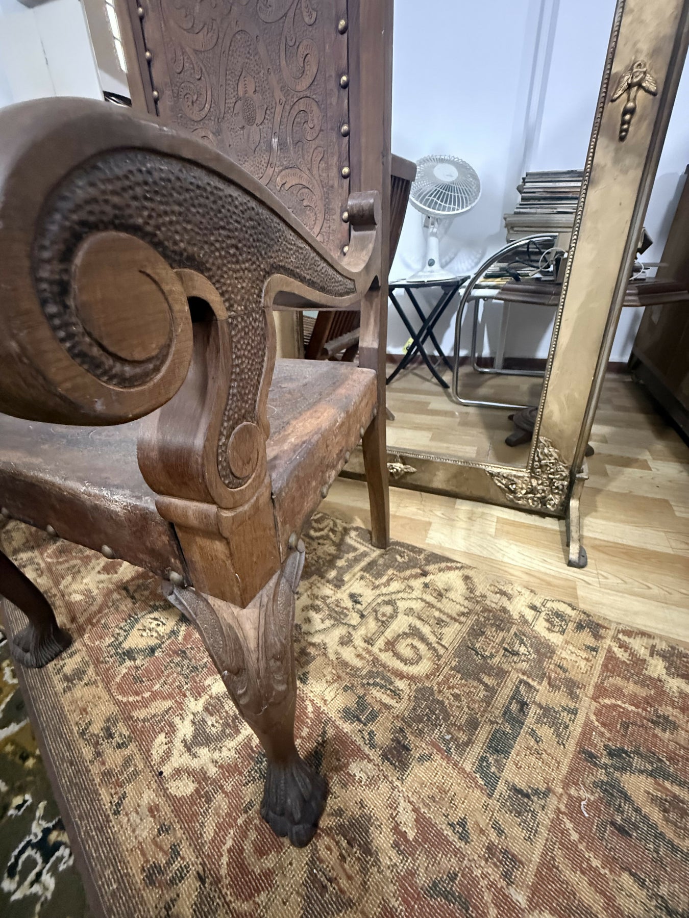 O assento e encosto mantêm o couro repuxado original, com belíssimos arabescos em baixo-relevo e tachões de época.