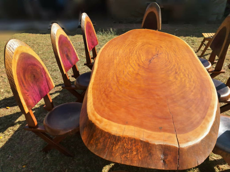 Lindo Conjunto de Mesa e Cadeiras rústicas em Madeira de lei. A mesa é de prancha de madeira Natural, com corte feito na diagonal, mantendo-se todas as características naturais da árvore (Cerne, alburno e casca), tornando-a uma peça única e rara na região. Altura: 81cm Comprimento: 272cm Largura: 112cm Além da mesa, o Conjunto também possui 8 cadeiras de Madeira Natural Roxinho, com encostos cortados na diagonal e assentos cortados na horizontal. As cadeiras possuem assento e encosto com cavidades arredondadas, tornando-as confortáveis. O Conjunto possui cerca de 30 anos e foi adquirido no estado do Tocantins. *O Conjunto está em Bebedouro SP e entregamos em demais regiões.