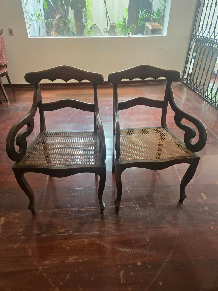 Par de cadeiras clássicas, em madeira maciça, com assento em palhinha natural e desenho elegante de inspiração tradicional. As peças apresentam braços curvos, pernas delicadamente arqueadas e encosto recortado, conferindo leveza visual e proporções equilibradas.
