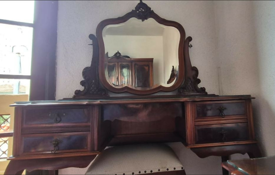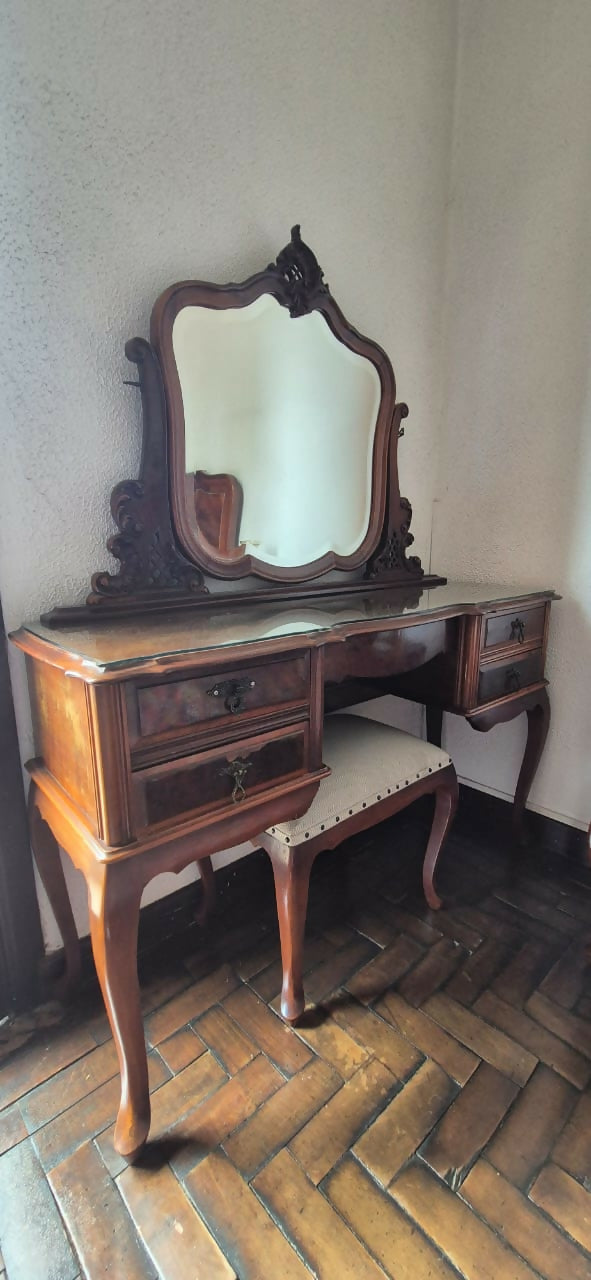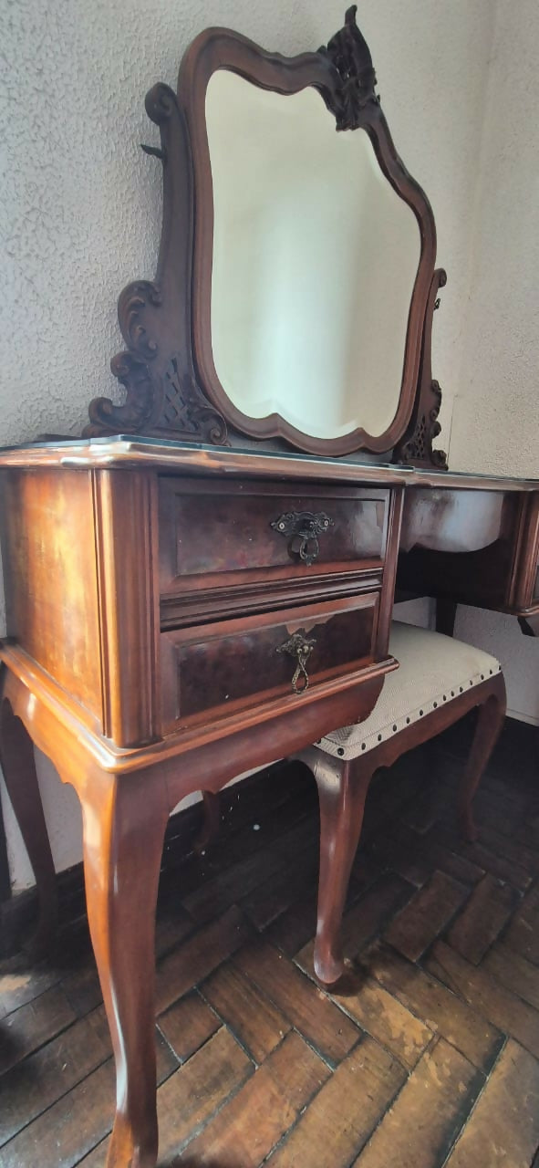 Penteadeira em estilo provençal Luís XV, combinando elegância e funcionalidade. Produzida em madeira maciça, é uma peça que remete ao charme clássico. Peça original, sem reparos e preservadíssima. Tampo protetor de vidro recortado.