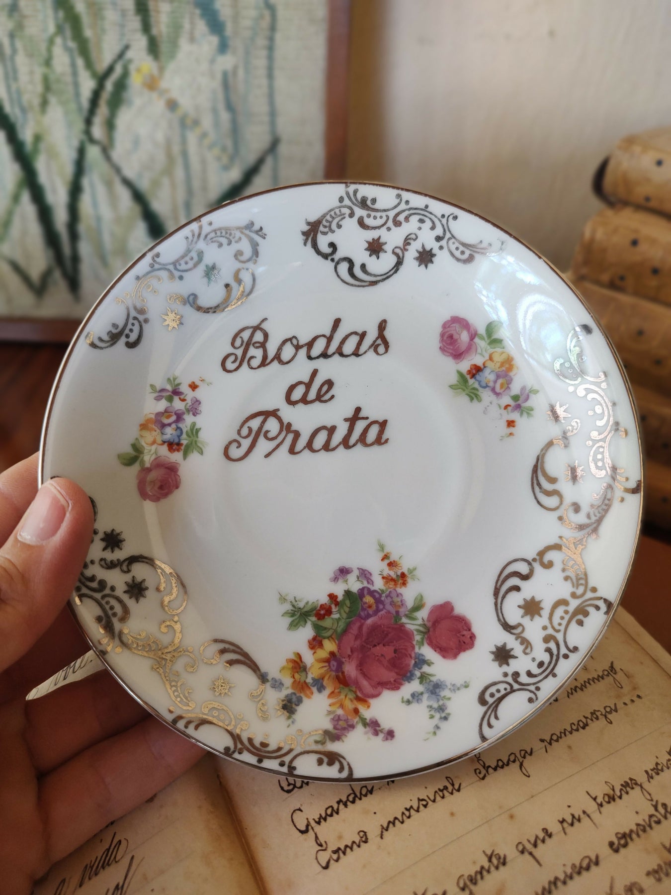 garimpo perfeito pra celebrar e presentear aquele casal de respeito que tá completando 25 anos juntinhos ✨🤎 são 3 pratinhos, dois iguais da Porcelana Real e um florido da Porcelana Steatita. Valor por unidade