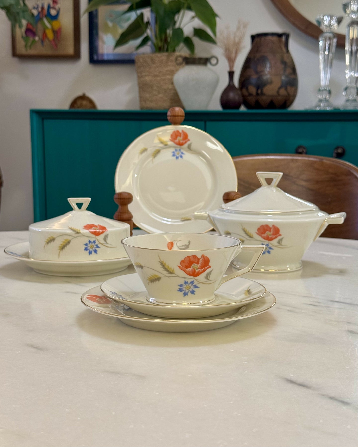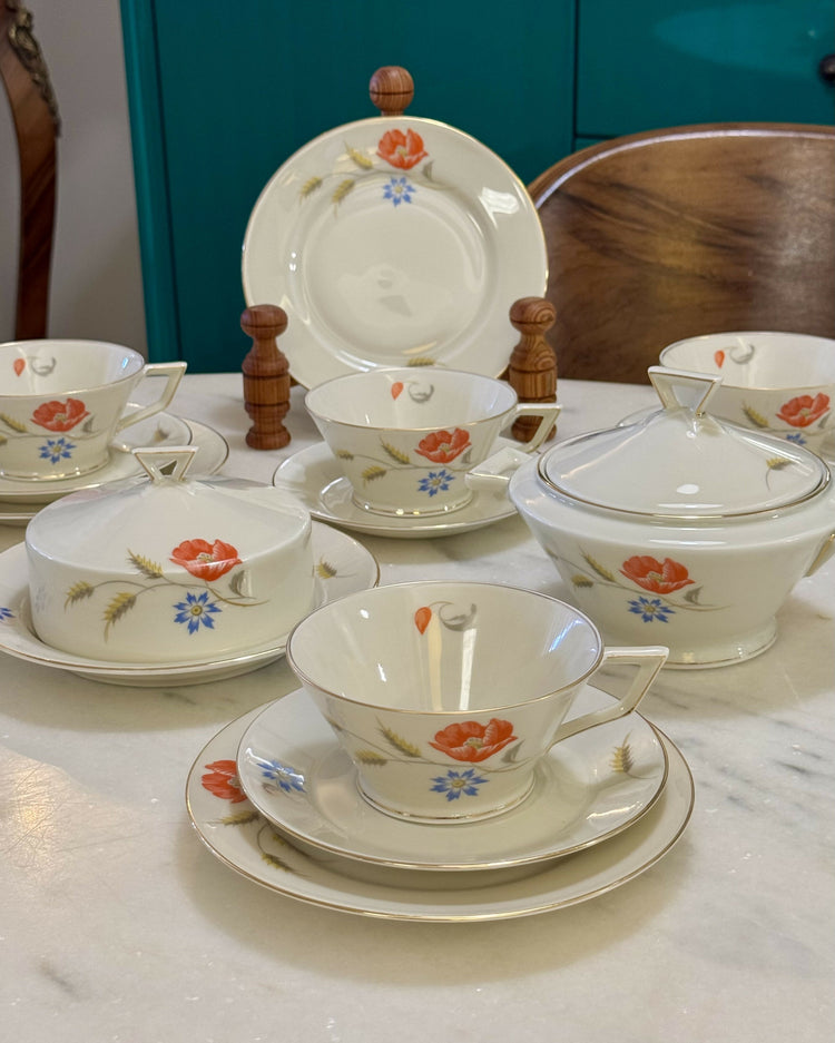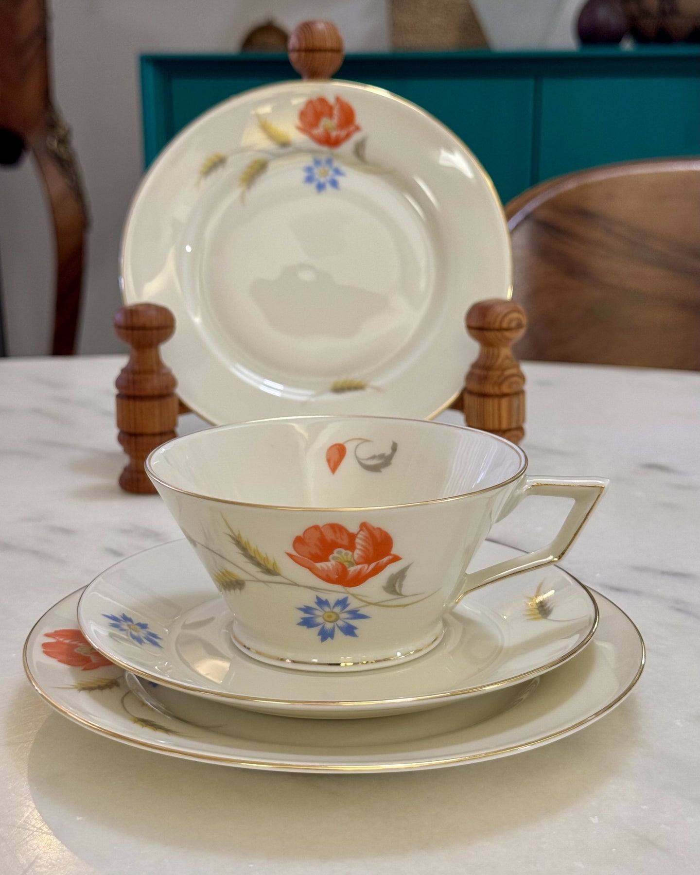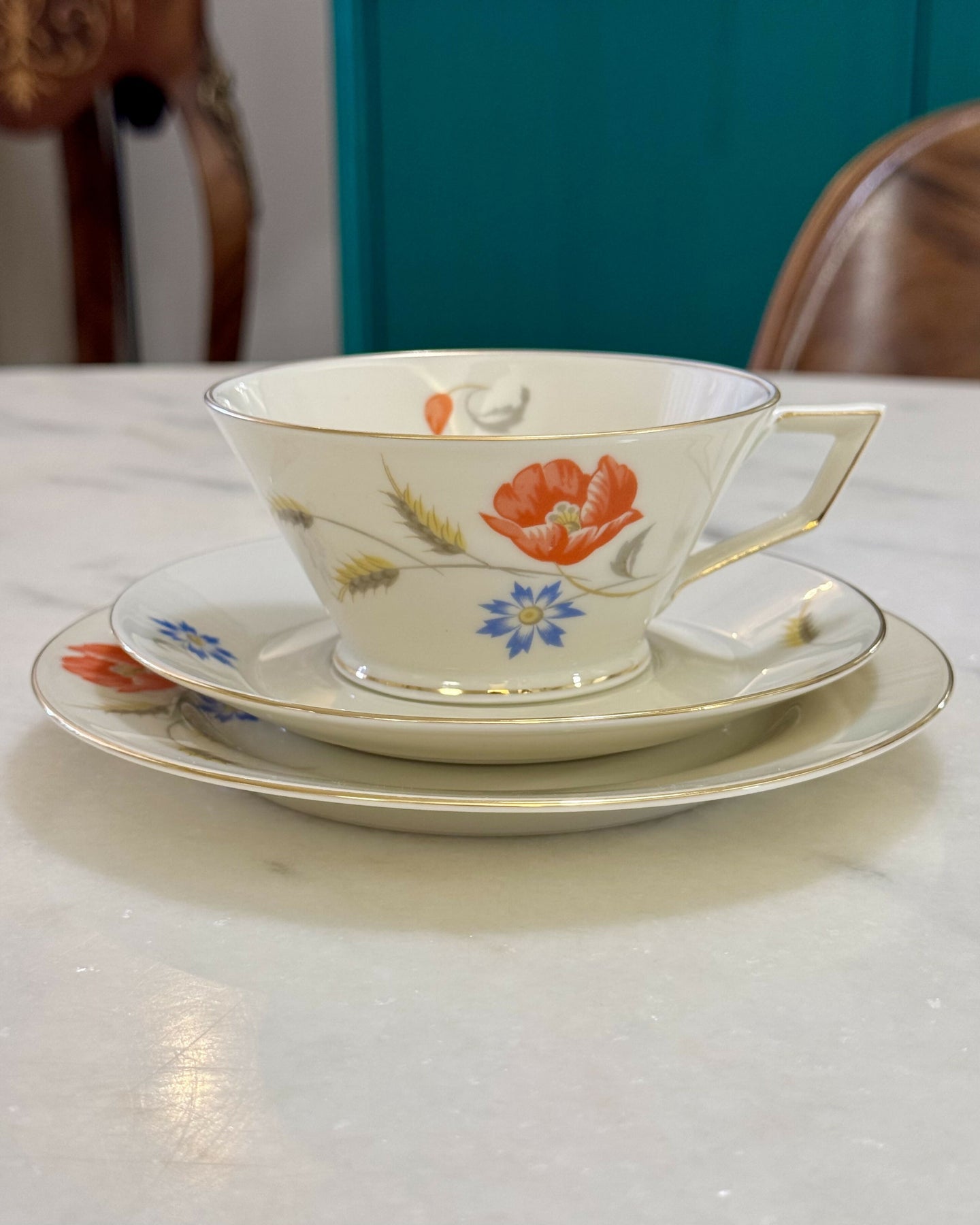 Fantástico jogo para chá em porcelana de origem Tchecoslováquia, Bohemia Royal Ivory em tom creme, produzido na década de 60, possui elegante decoração floral em tons laranja e azul com filetações douradas nas bordas. O açucareiro e xícaras possuem base mais aberta conferindo um charme único ao conjunto que está em excelente estado de conservação, peças sem bicados ou fios de cabelo e douramento impecável. Peças únicas em tão perfeito estado de conservação pois contam com praticamente 65 anos.