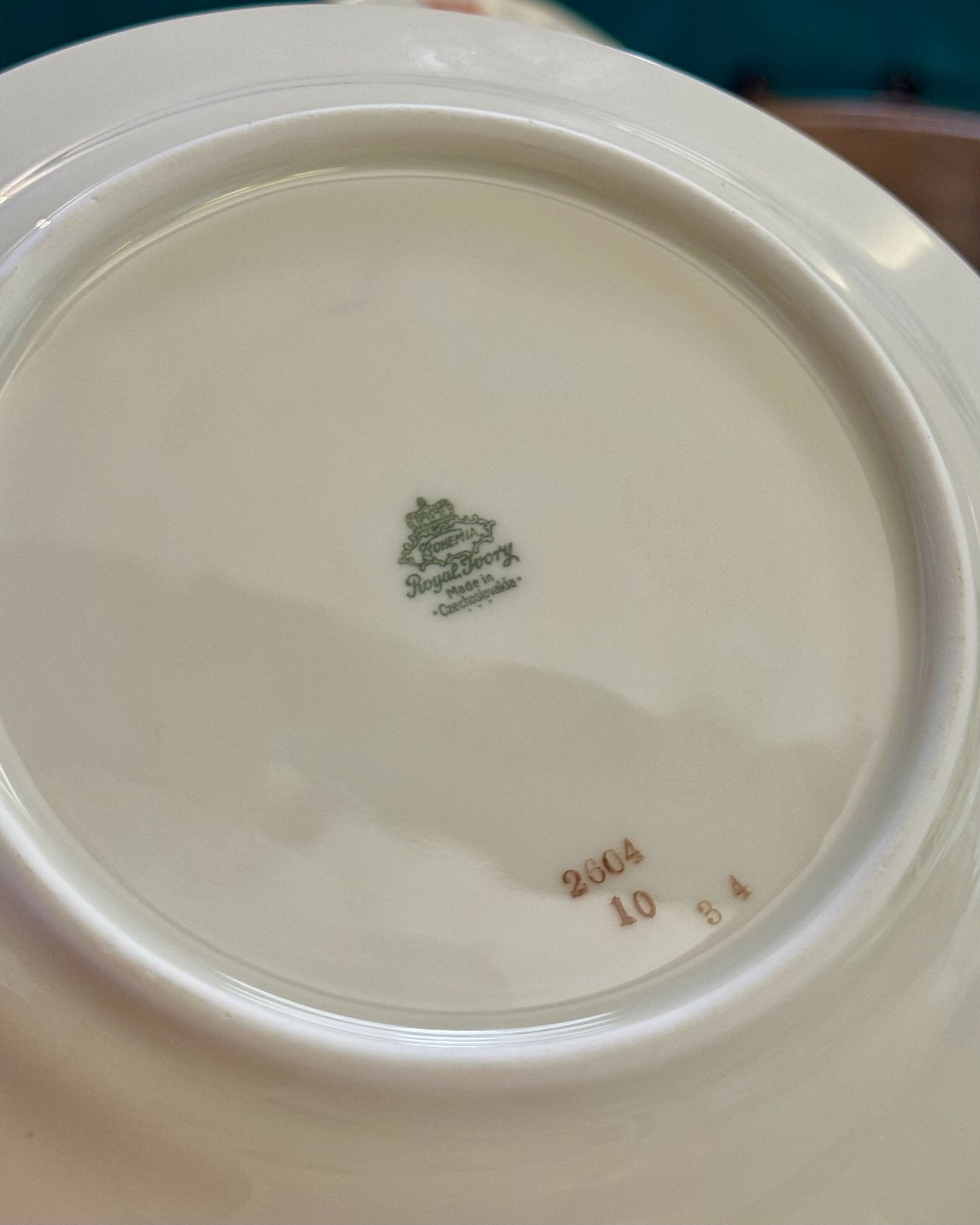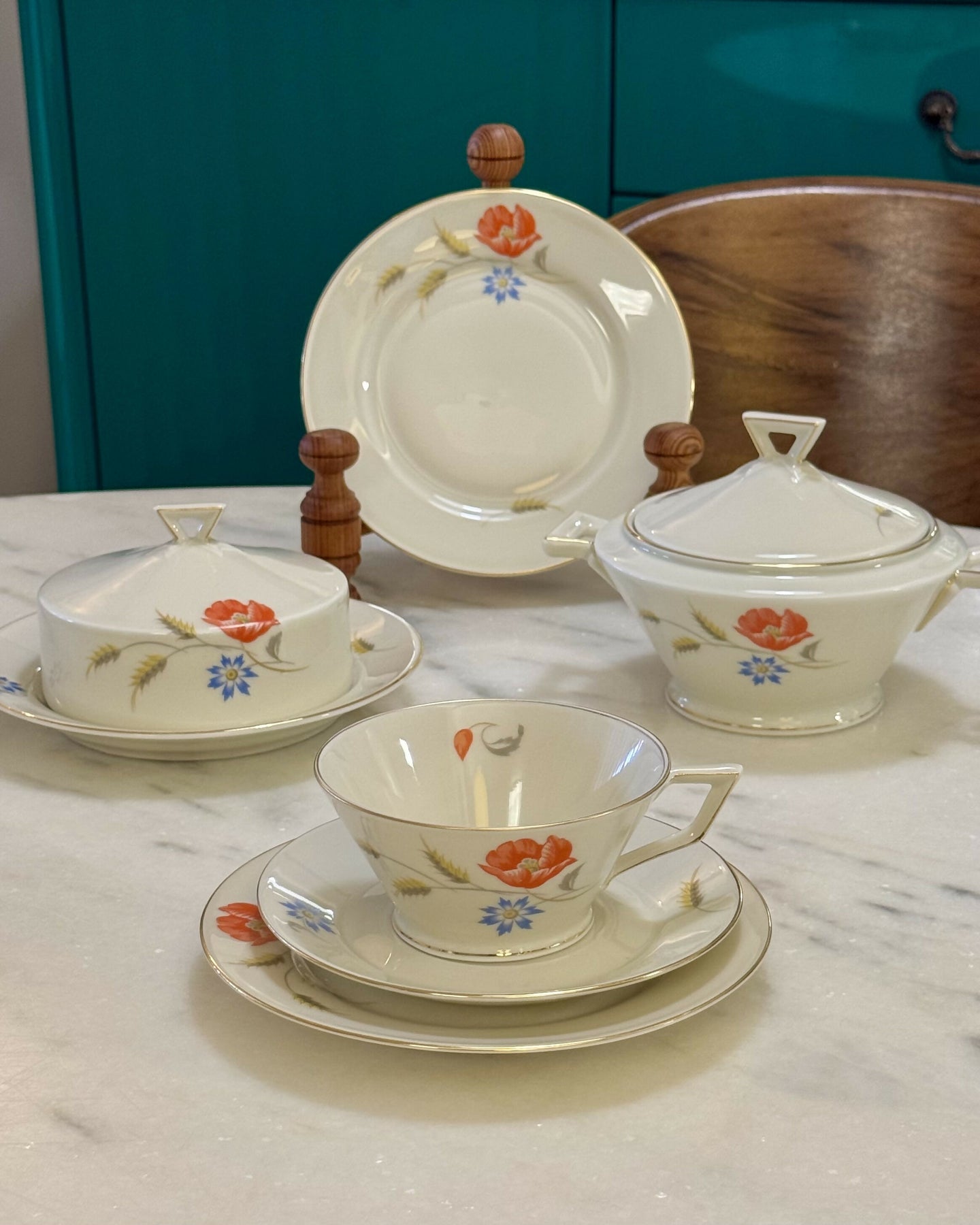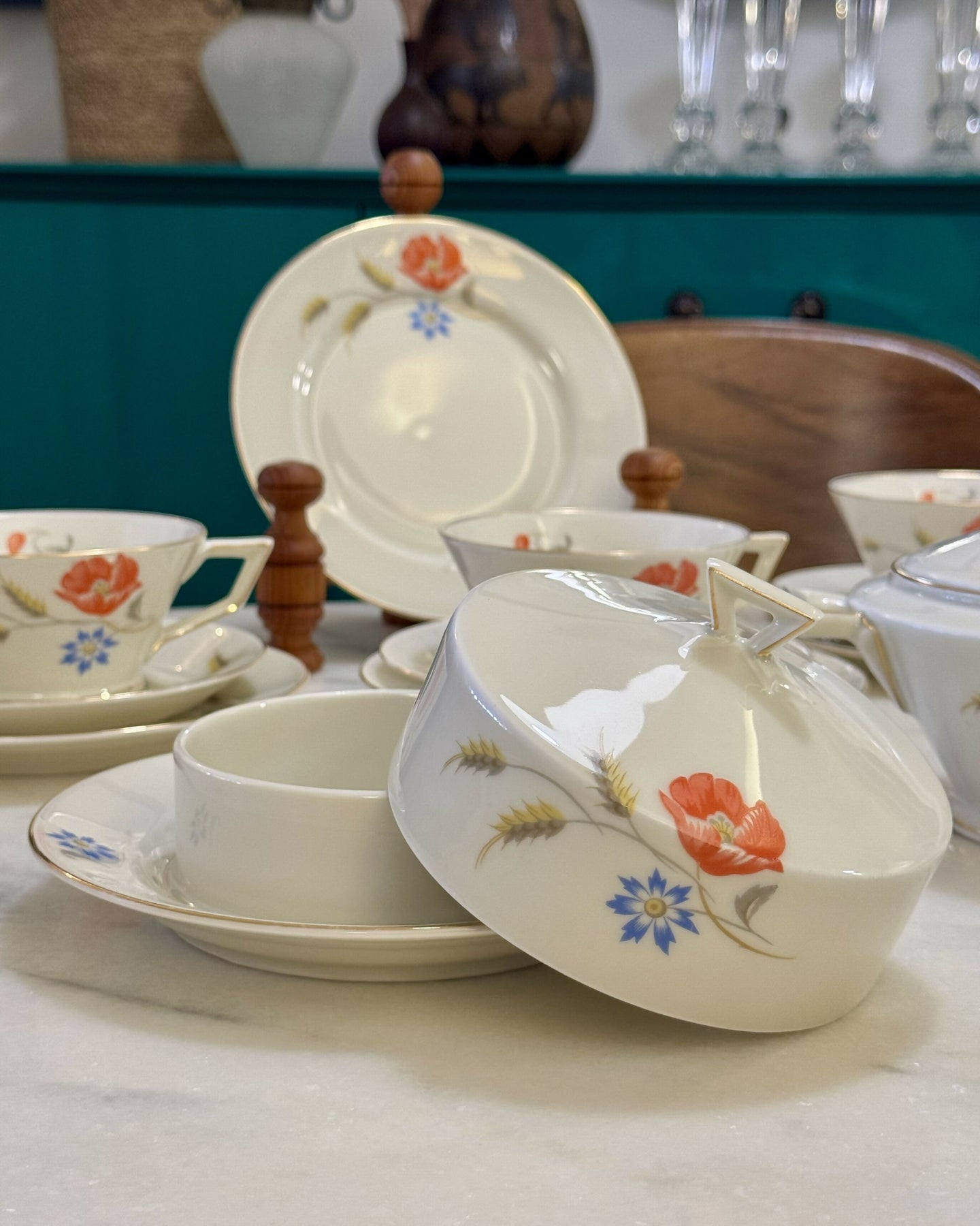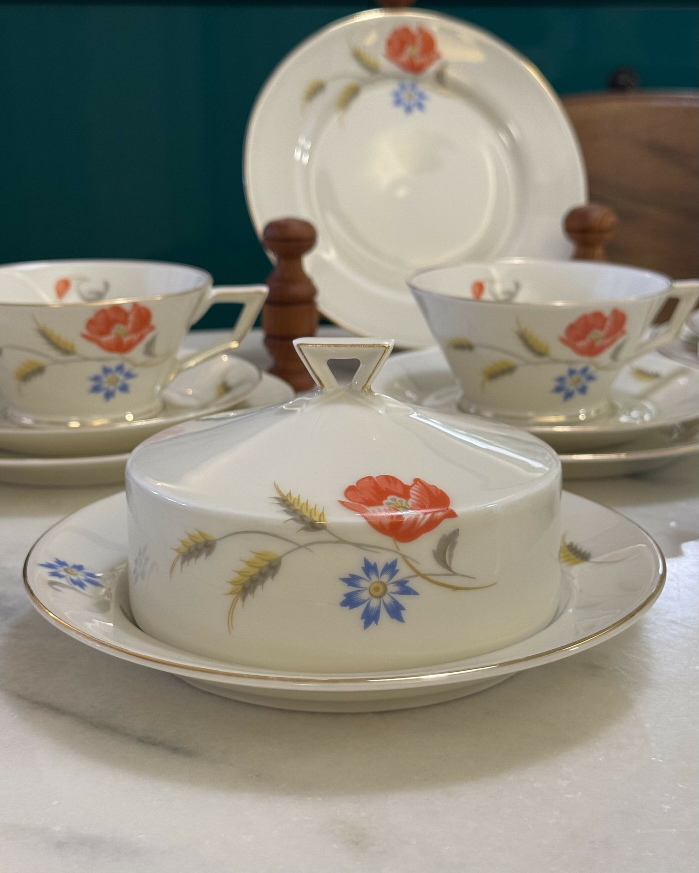 Este lote é composto por: 06 xícaras com os respectivos pires, 06 pratos de bolo, uma manteigueira e um açucareiro, total de 20 peças todas devidamente numeradas.