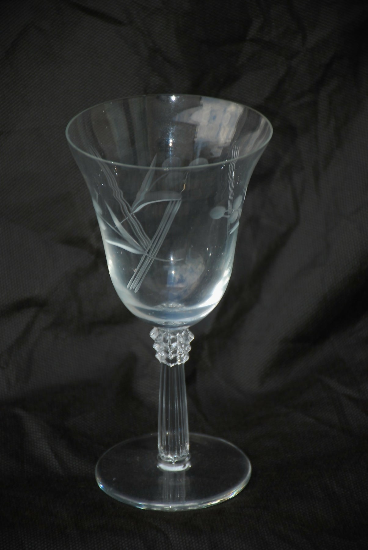 Taças de vinho de cristal Fostoria "Cynthia" (1938-1965) com gravuras de folhas e frutos e haste canelada, 12 PÇS