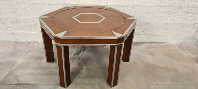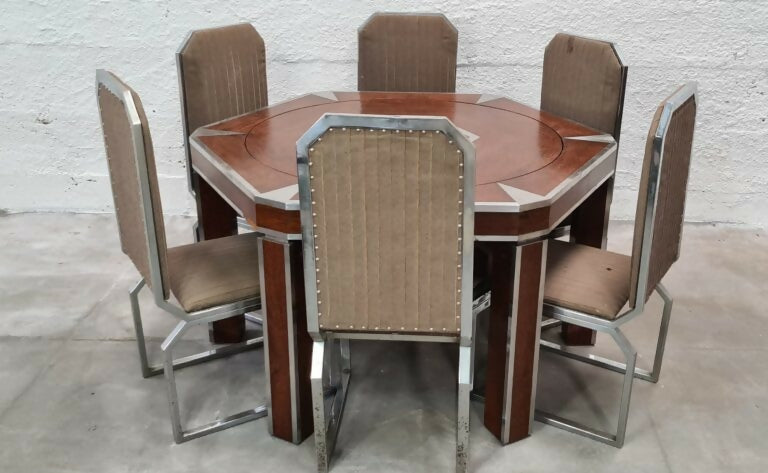 Bela mesa sextavada em lâmina de madeira sucupira, detalhes em lâminas de aço escovado, conjunto coringa podendo ser mesa de jantar ou de jogos, todas as laterais tem gavetas de armazenamento, 6 cadeiras inclusas no estado original de conservação, conjunto provavelmente de origem importada.