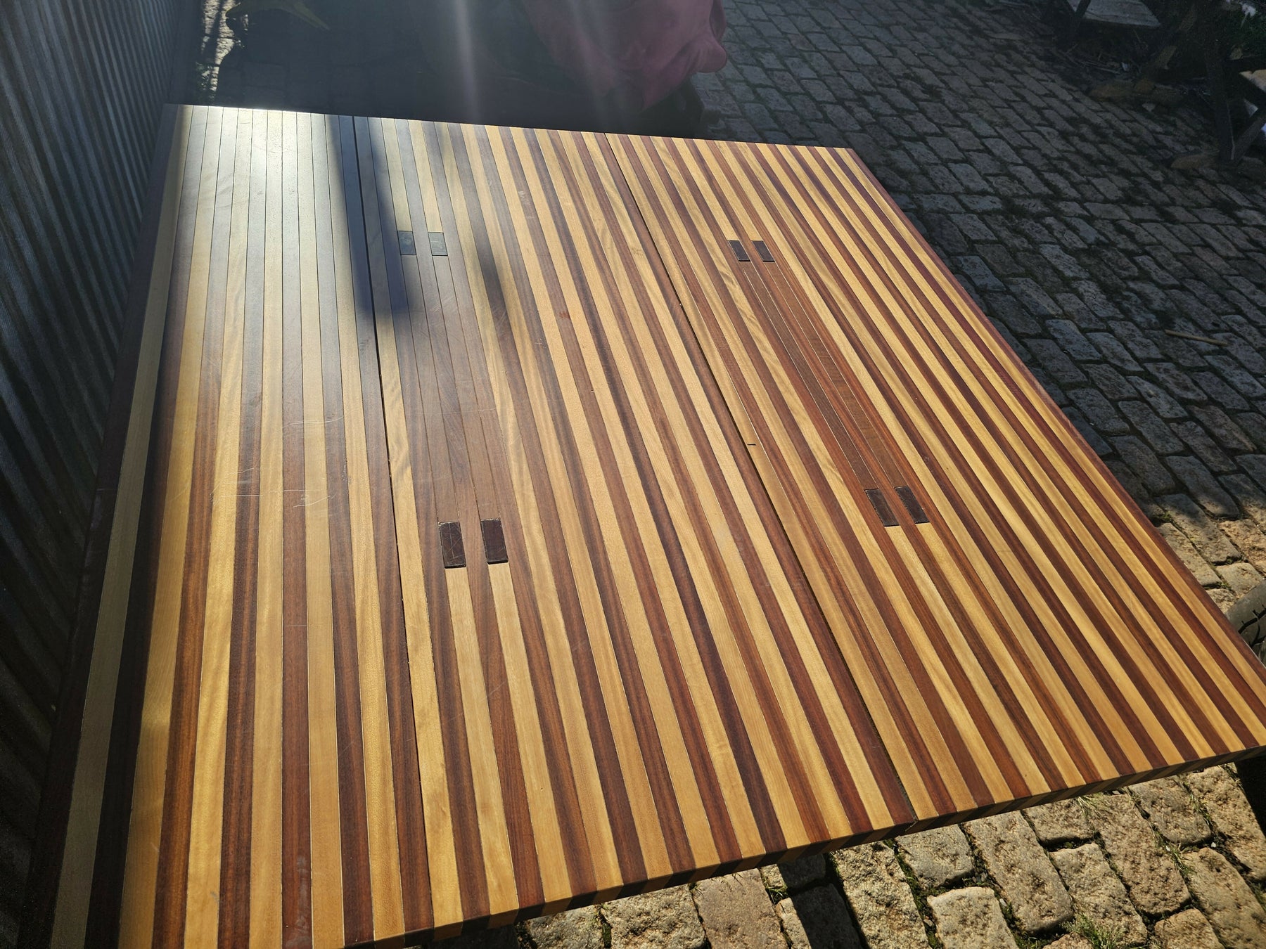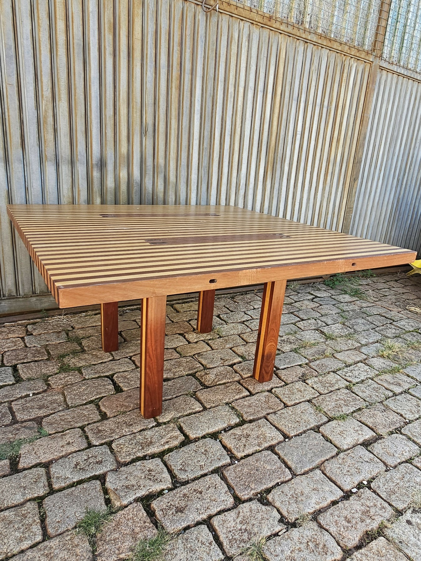 Mesa com 3 madeiras diferentes, uma obra de arte de Azeredo, que produz sob encomenda séries limitadas e assinadas de móveis que primam pela qualidade do desenho e da elaboração. As peças não usam pregos ou parafusos, apenas encaixes feitos numa precisão absoluta, num sistema que lhe rendeu uma patente de invenção. Em pleno apogeu e maturidade, seu trabalho se caracteriza pelo desejo de incorporar ao móvel, um objeto predominantemente funcional, uma dimensão plástica, artística, emocional que havia desaparecido com a dominância dos conceitos do racionalismo internacional. Contrário à globalização pasteurizada da cultura, sua criação vai fundo na nossa identidade cultural, buscando nas nossas origens a sua forma de expressão