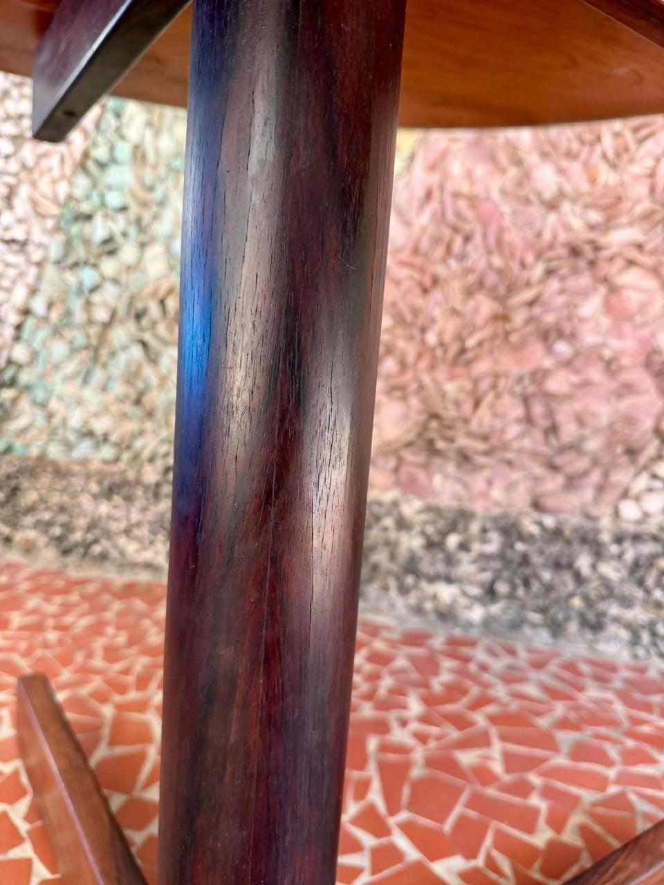 Mesa de jantar redonda com base em X executada em jacarandá maciço, coluna central em ferro tubular laminado em jacarandá e tampo em madeira compensada também laminada em jacarandá. Brasil, déc. 1960.