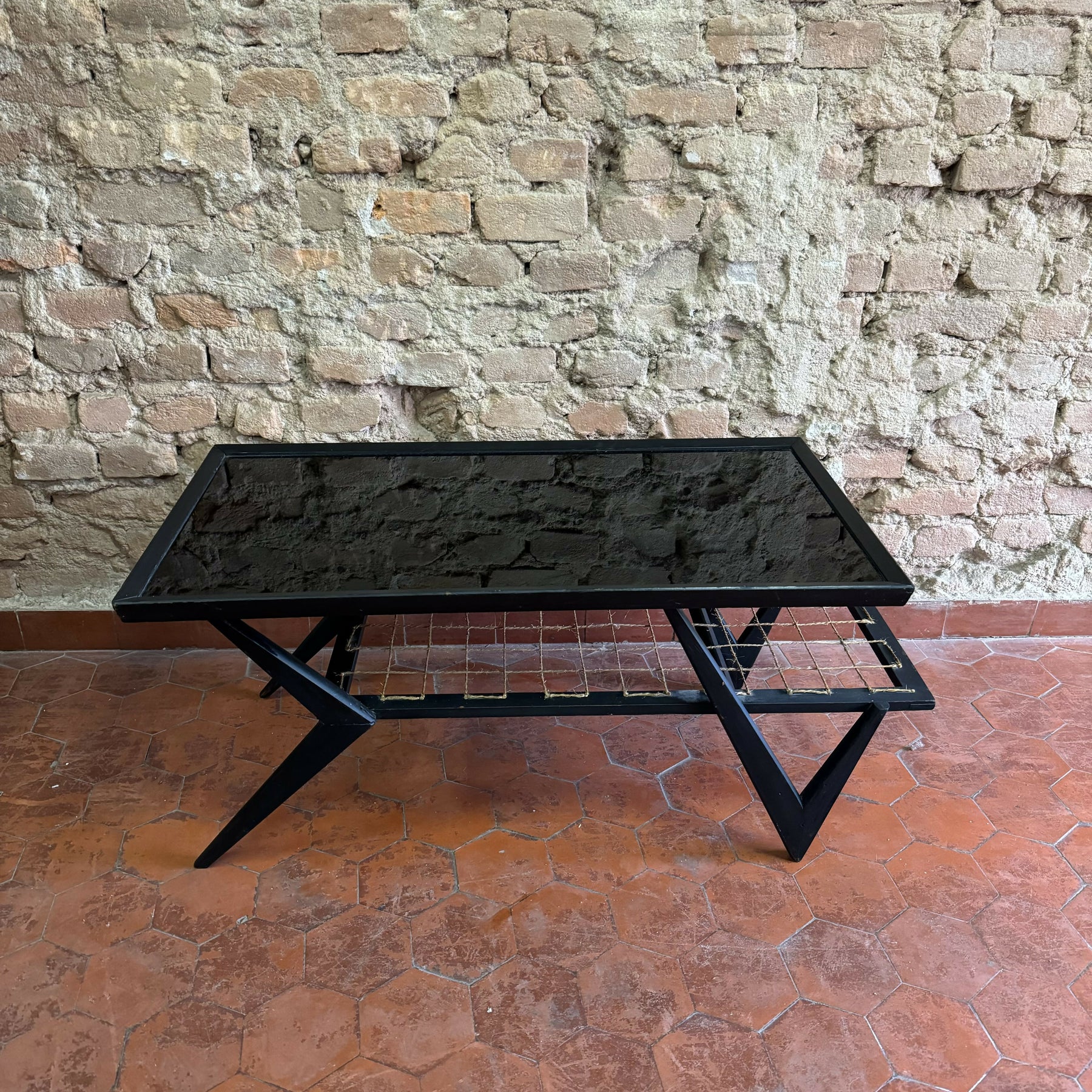 Mesa de centro ou auxiliar anos 50, peça inteira em madeira maciça ebanizada, com dois estágios, sendo o inferior com trançado de junco para apoiar revistas e superior com tampo de vidro. Peça com design arrojado e em ótimo estado de conservação! Medidas: 40x89x43cm