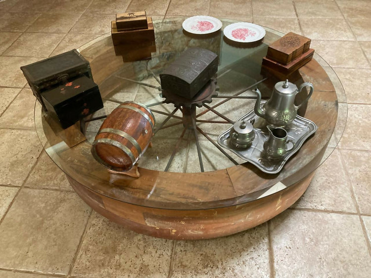 Mesa montada por tradicional marceneiro com antiga roda de carroça - 108 cm de diametro