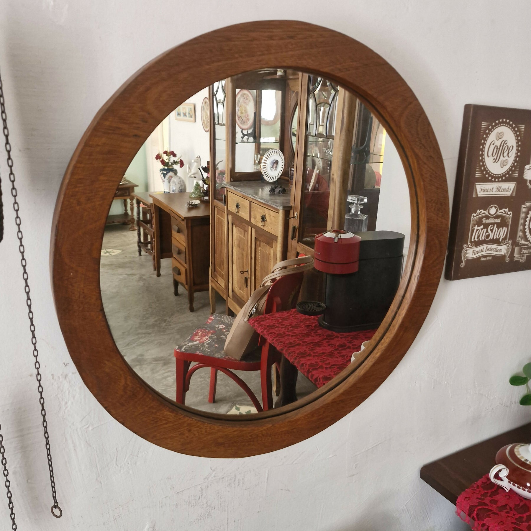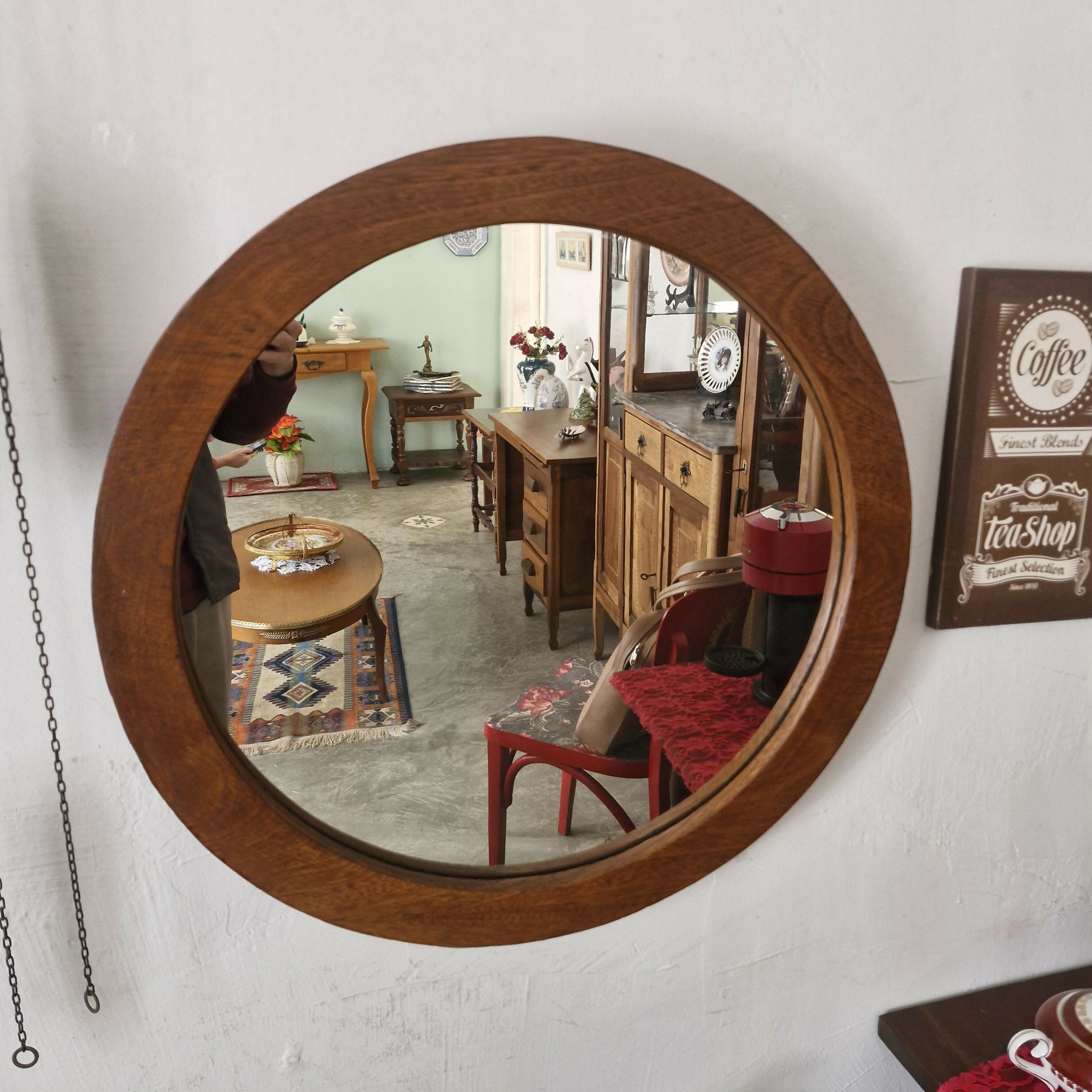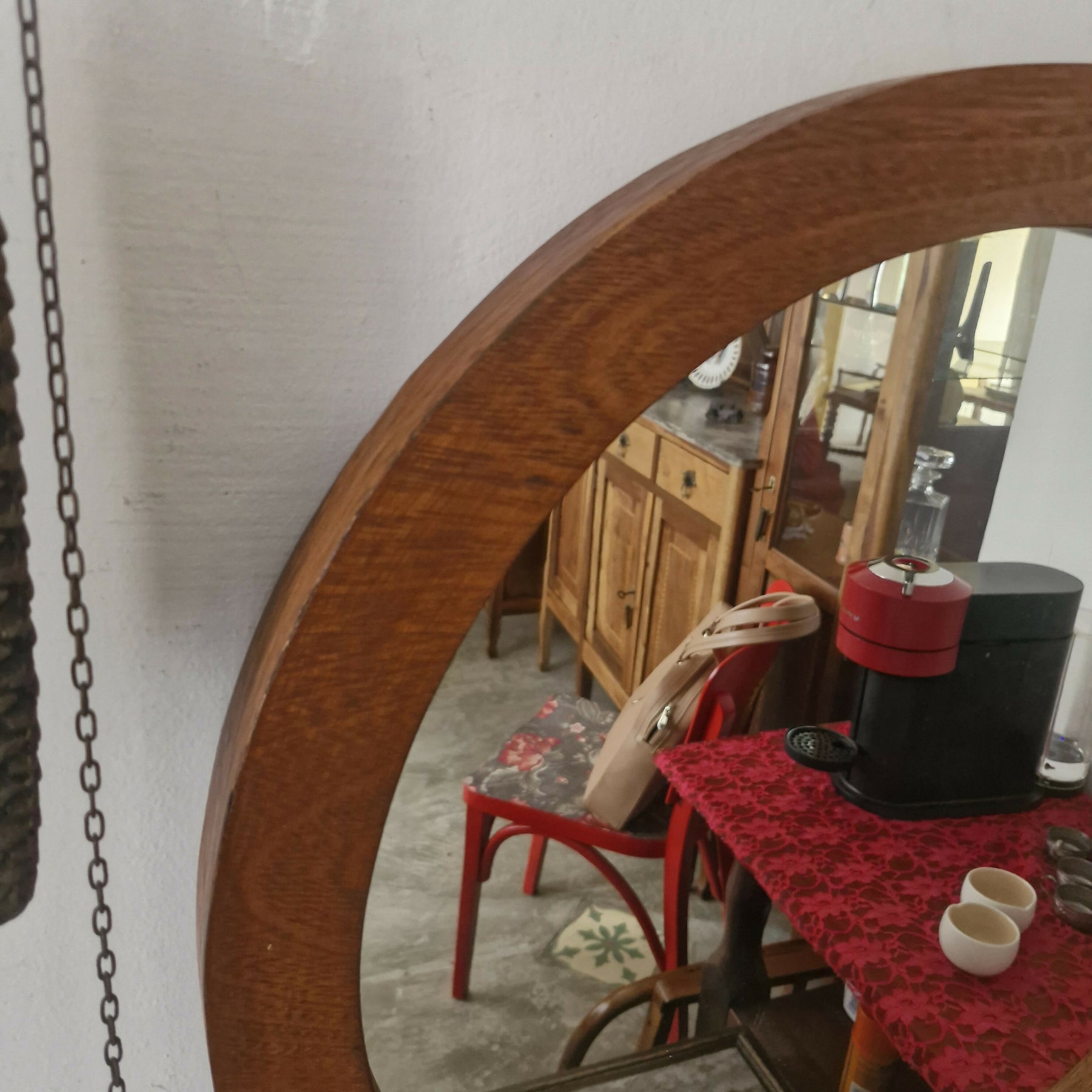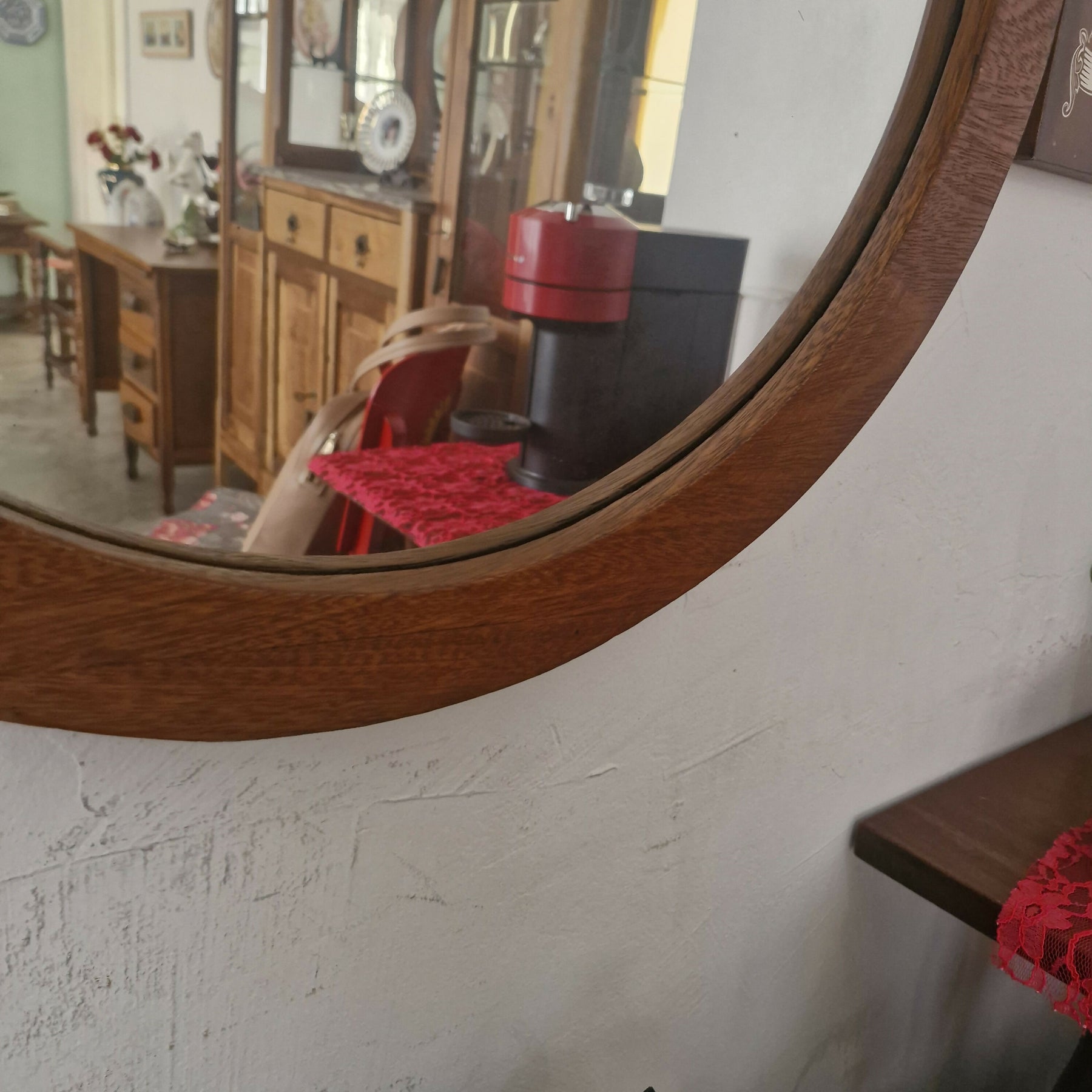 Belíssimo espelho com moldura redonda em madeira cerejeira, restaurado em perfeito estado, peça para compor ambientes.