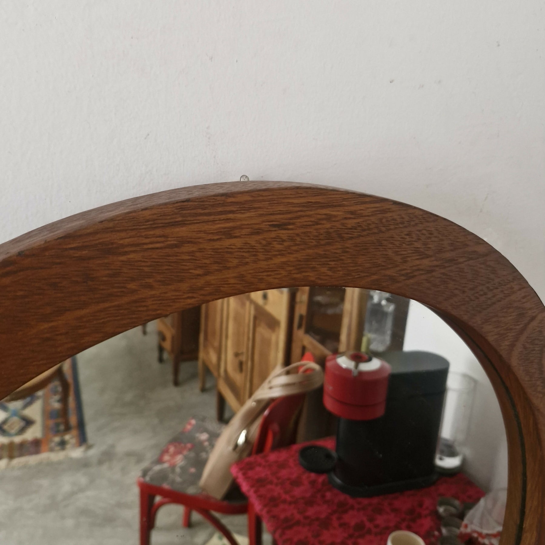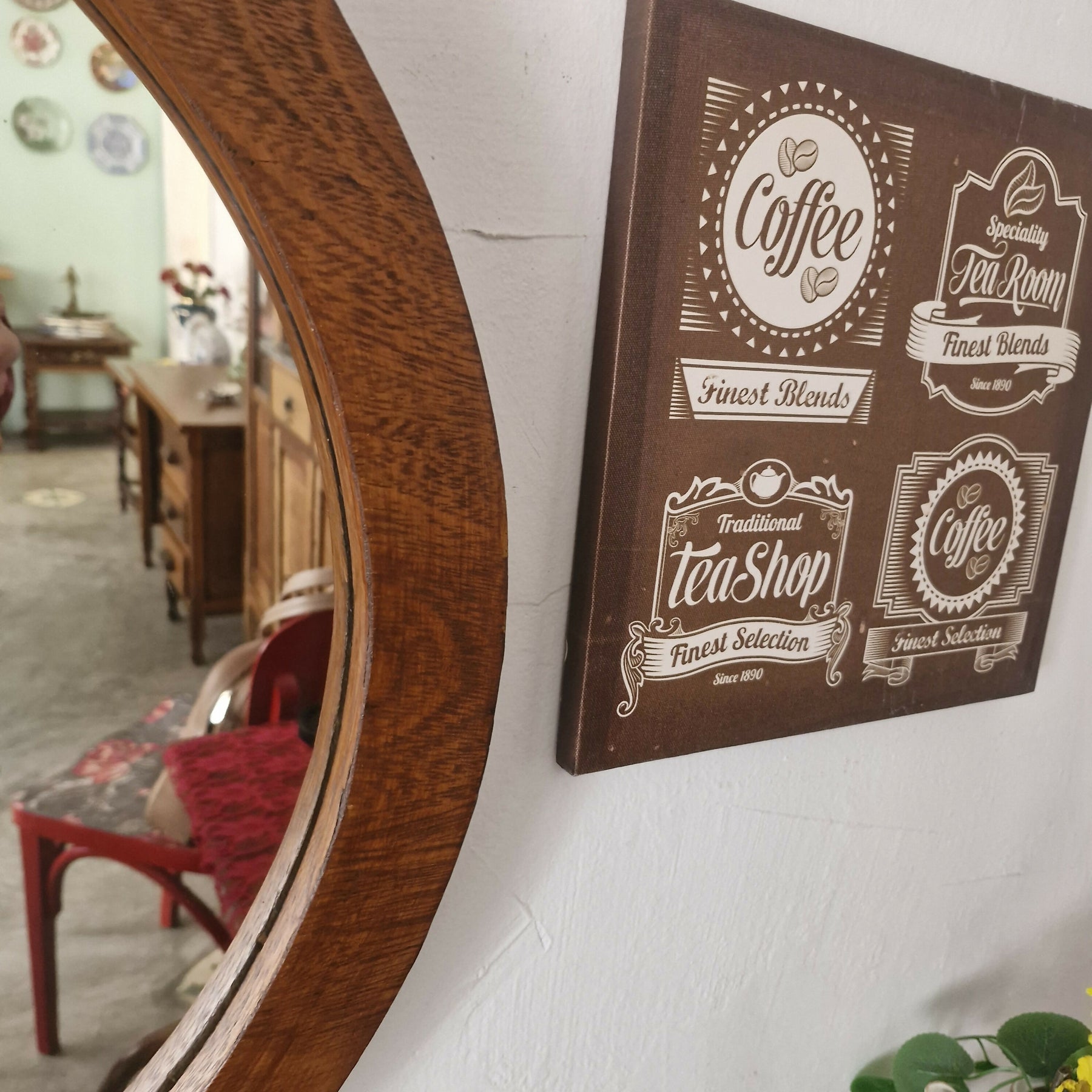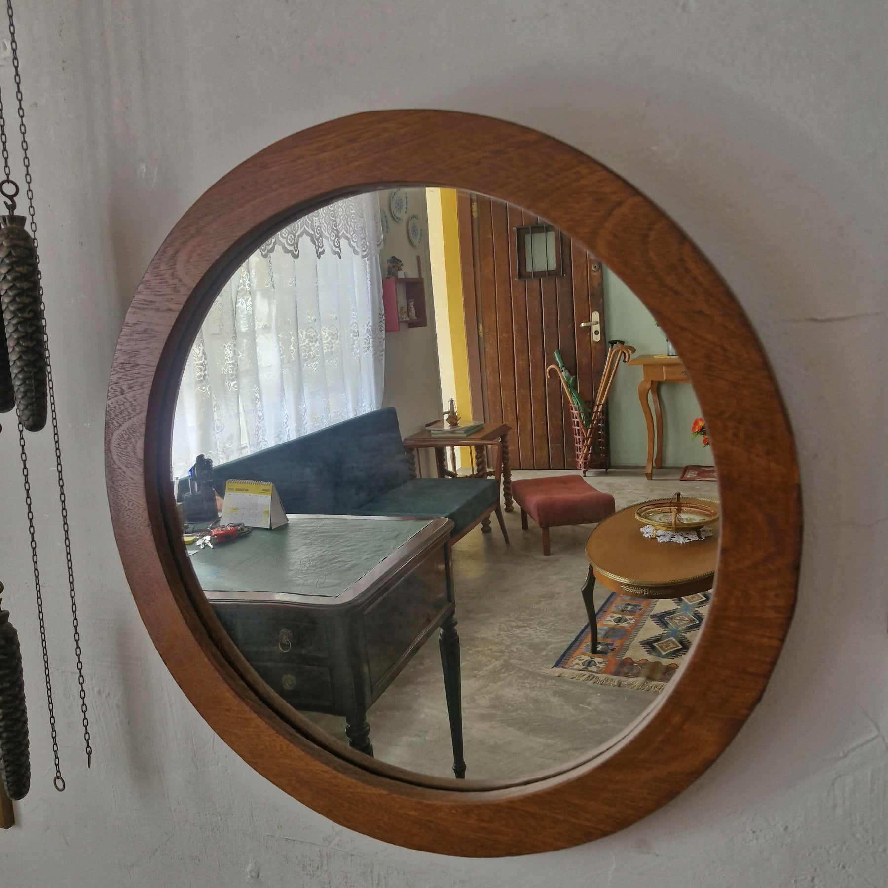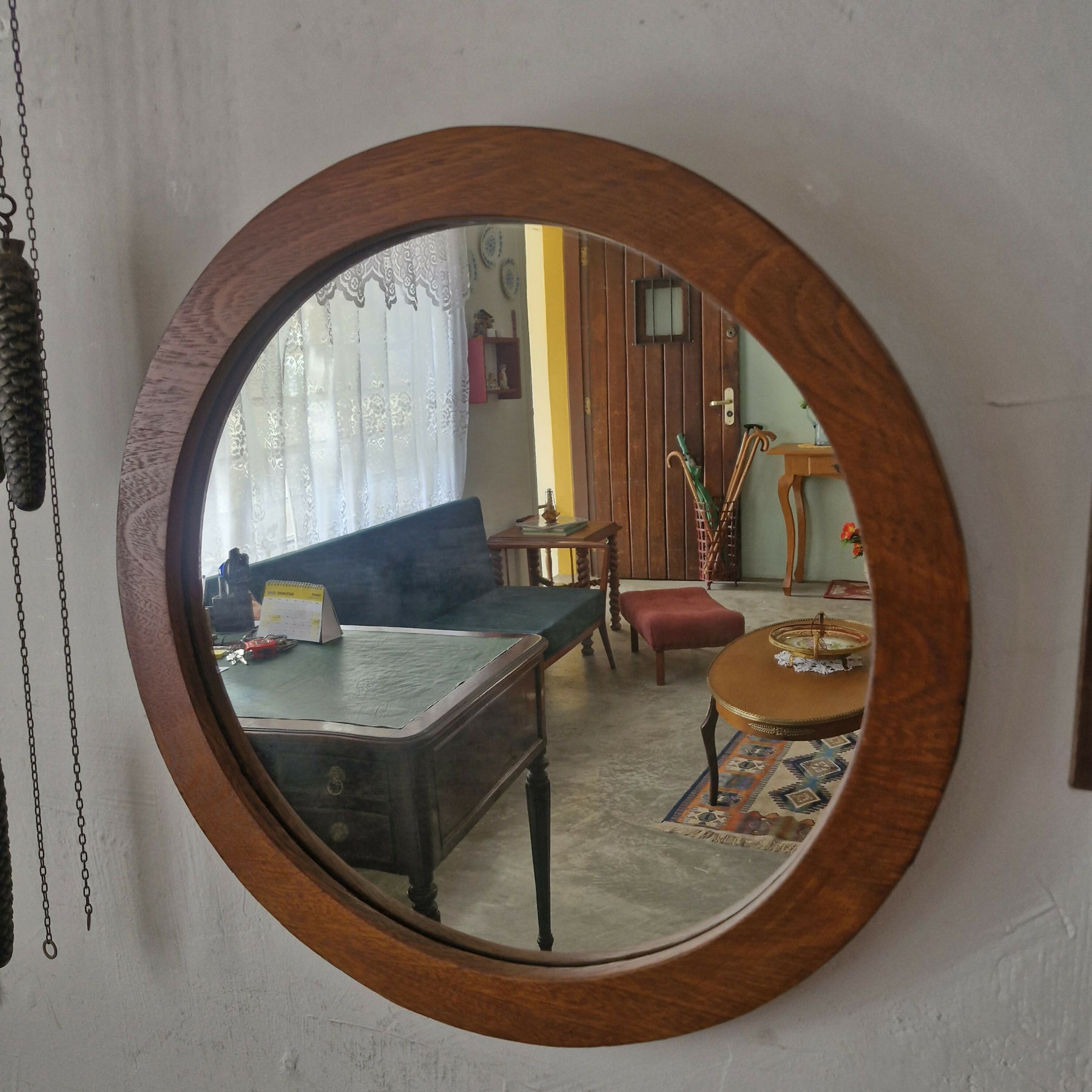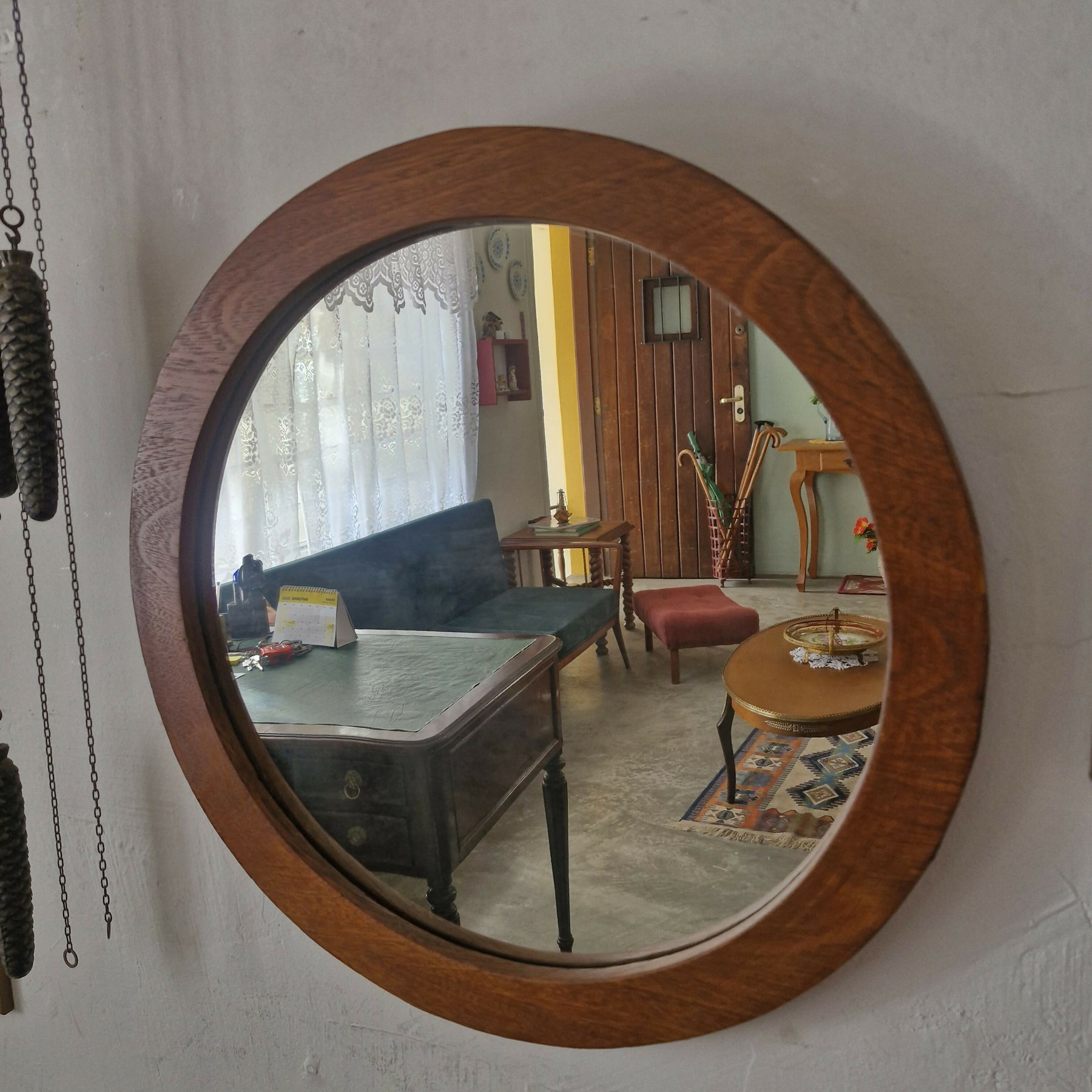 Belíssimo espelho com moldura redonda em madeira cerejeira, restaurado em perfeito estado, peça para compor ambientes.