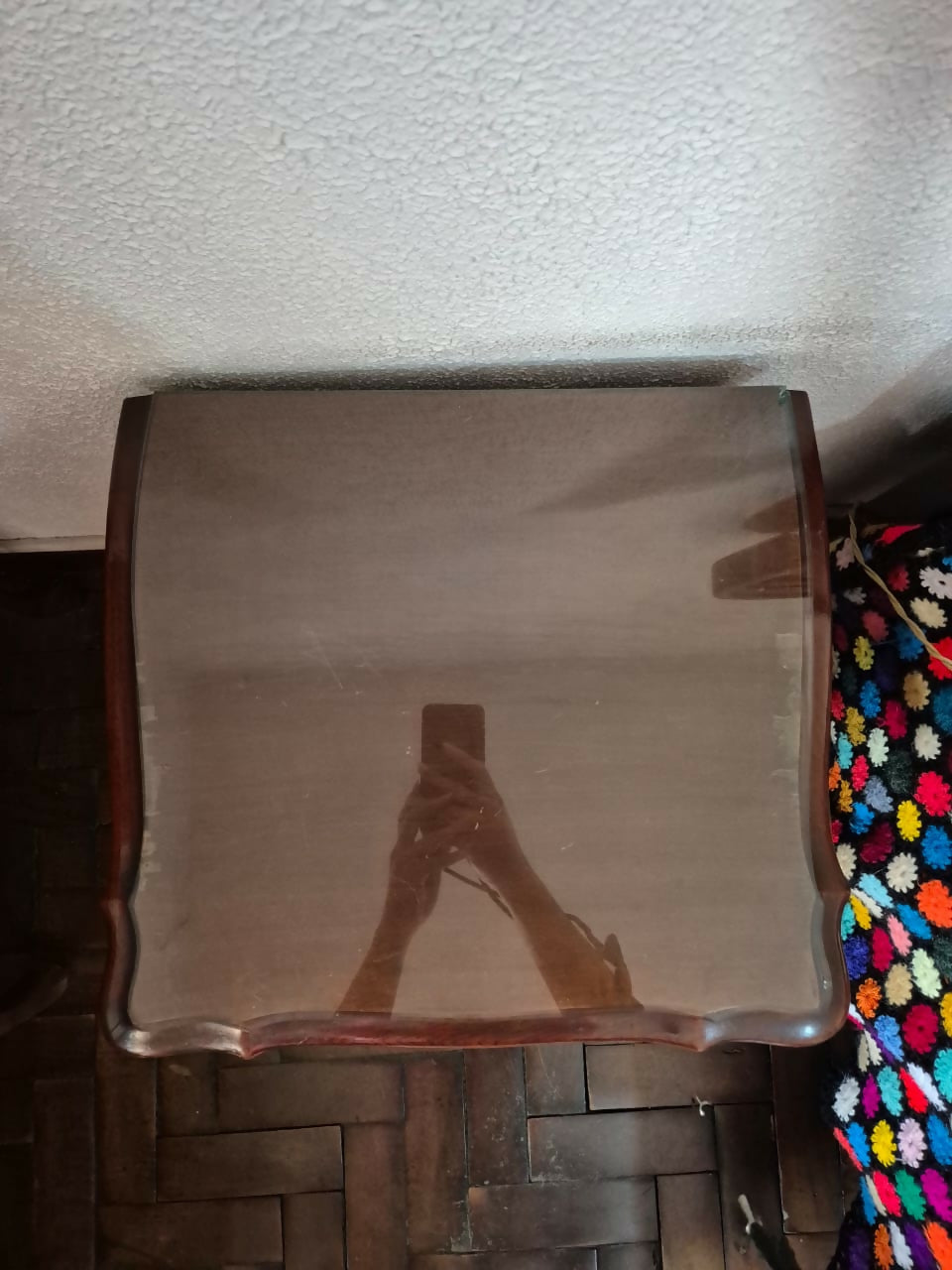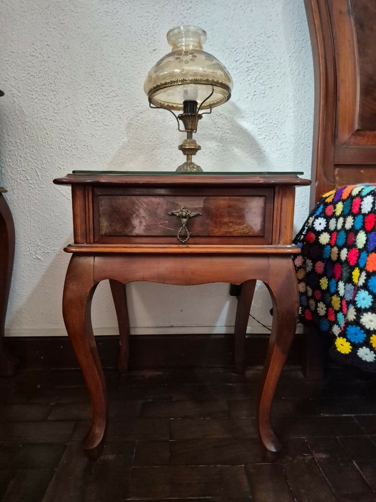 Par de mesa de cabeceira, estilo Luís XV, feita em madeira maciça, com entalhes artesanais nas molduras. Puxadores originais. Tampo protetor de vidro recortado.