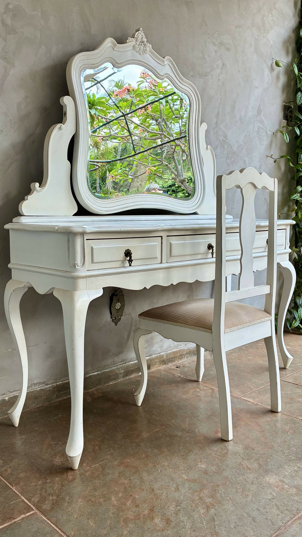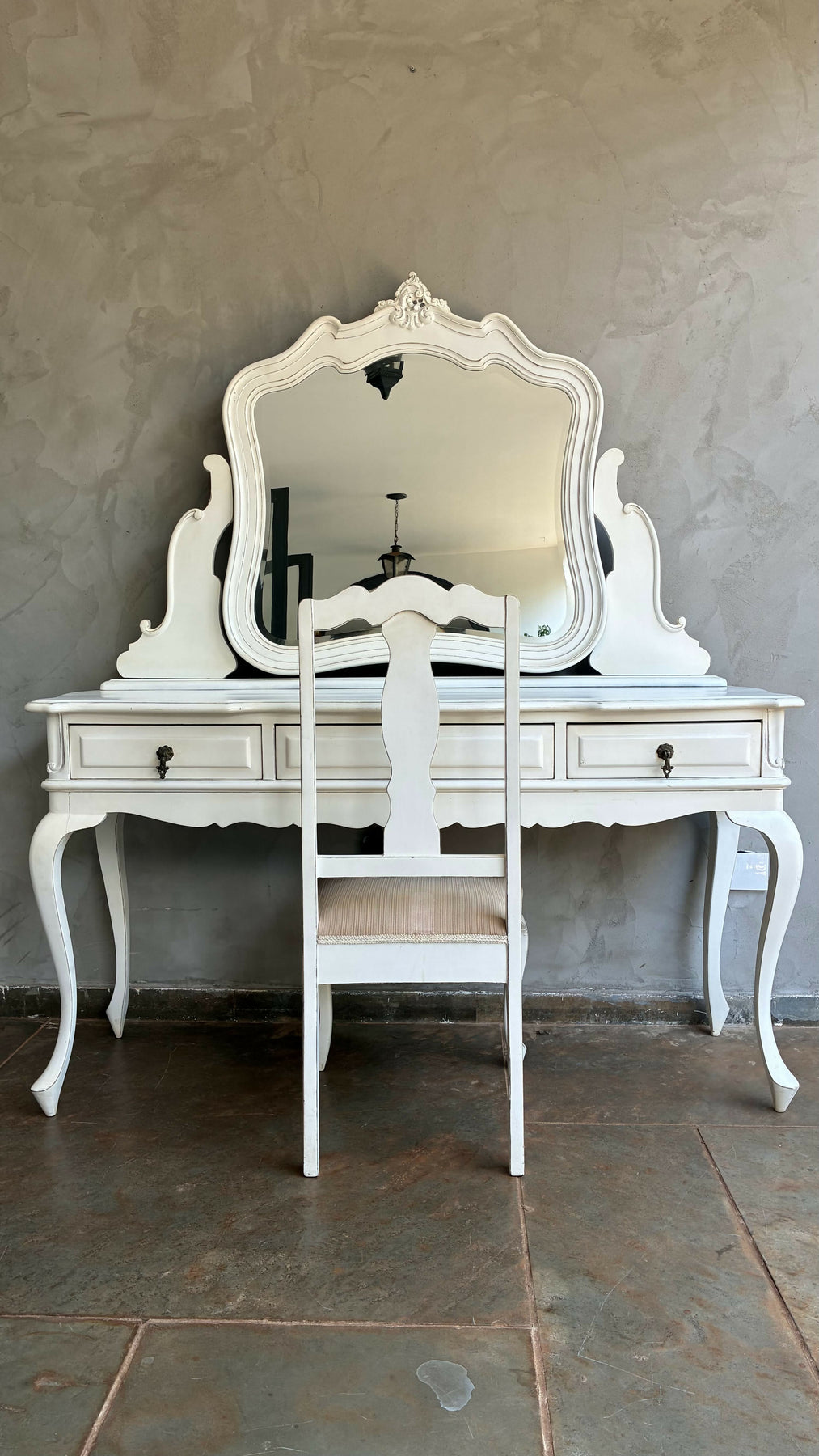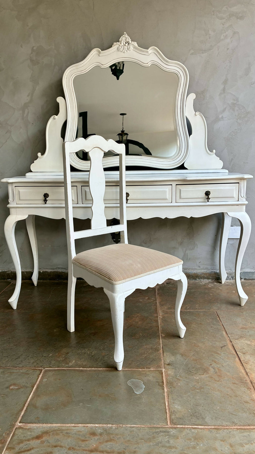 Linda penteadeira no estilo Luis XV, com espelho bisotê moldurado e cadeira original. Em tom branco patinado,