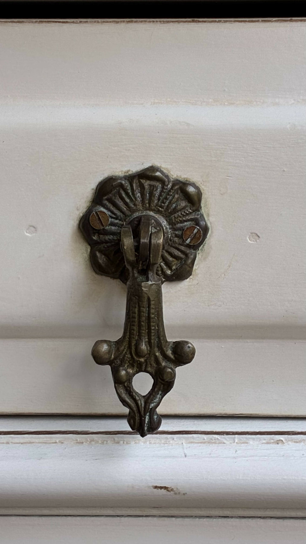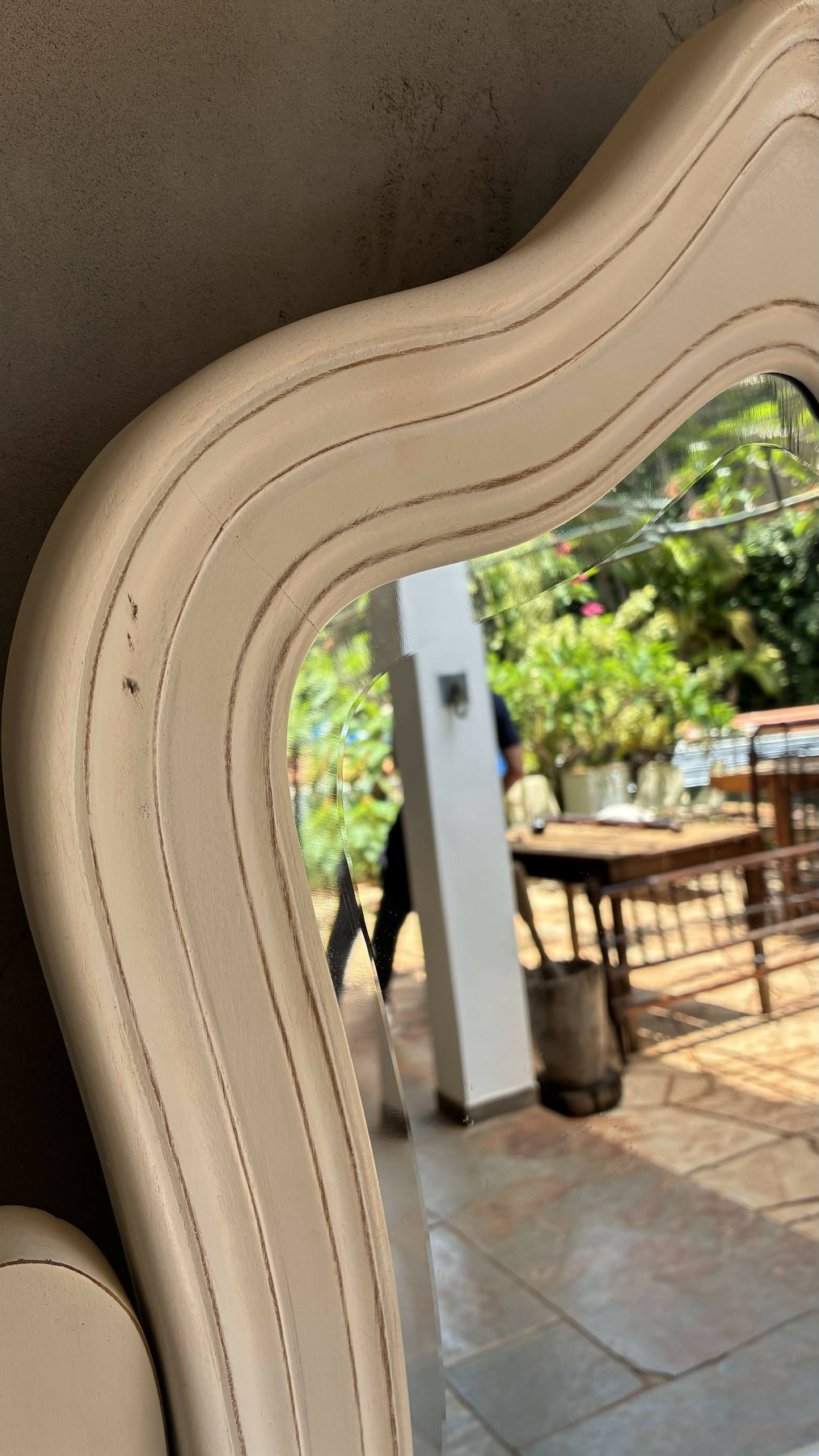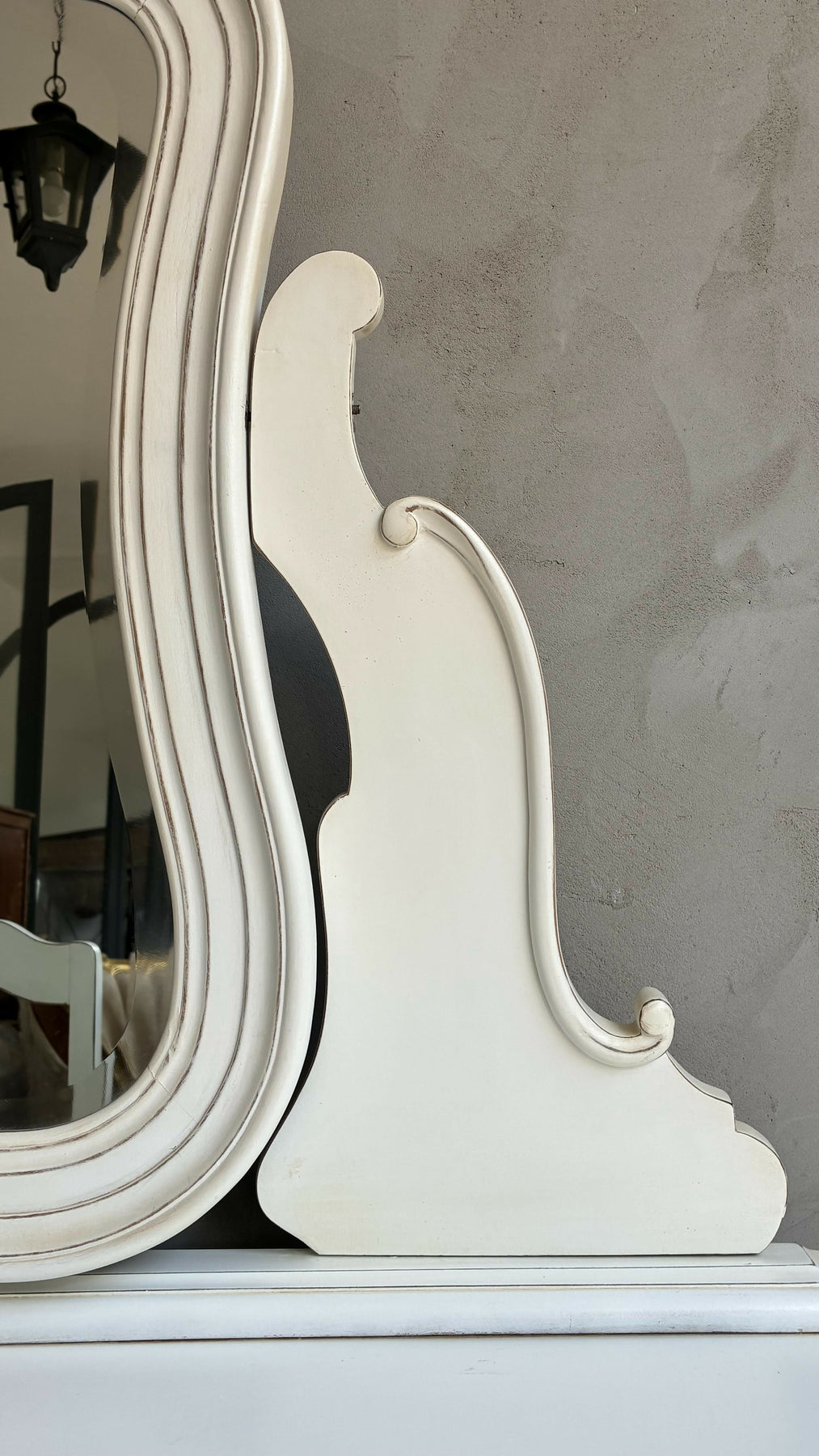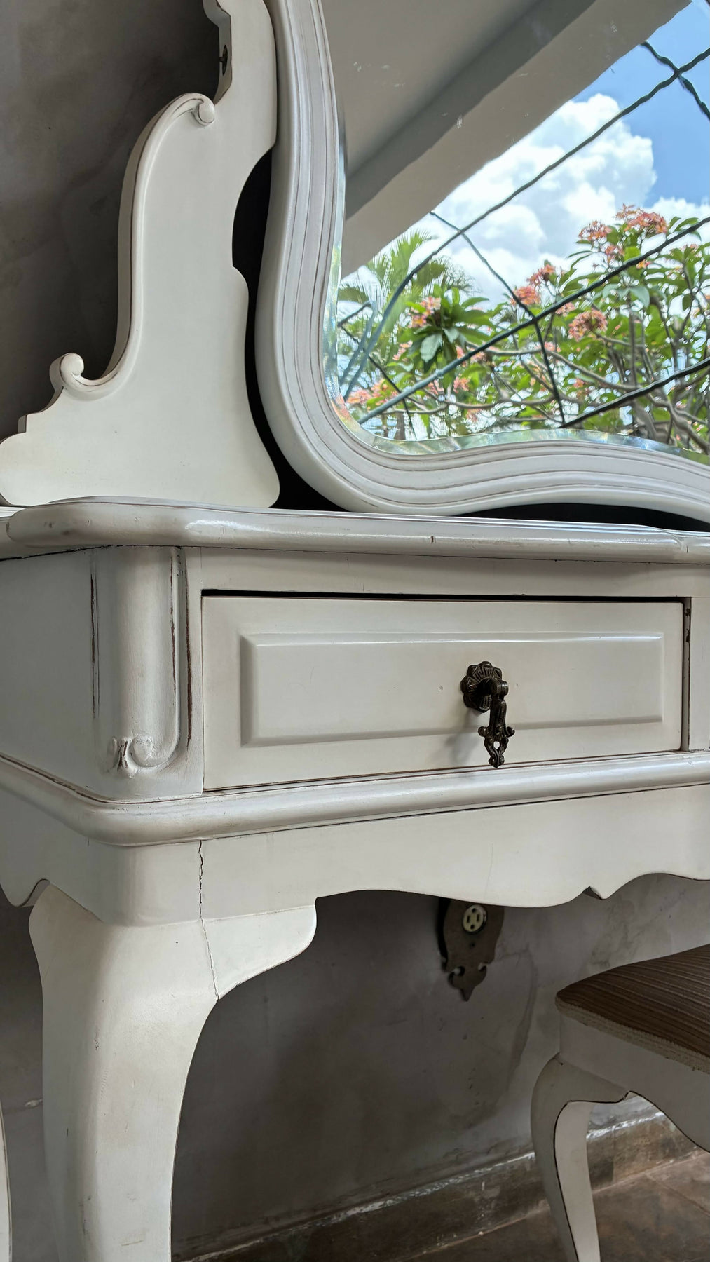 Linda penteadeira no estilo Luis XV, com espelho bisotê moldurado e cadeira original. Em tom branco patinado,
