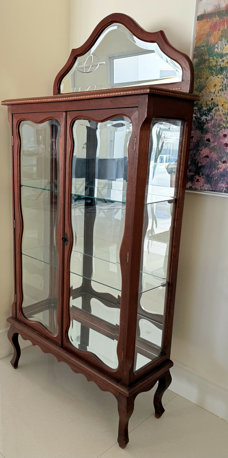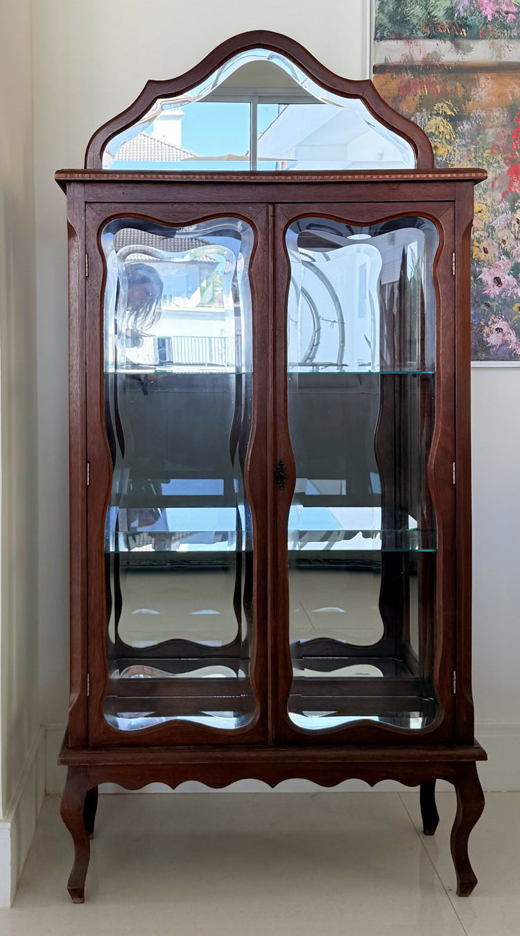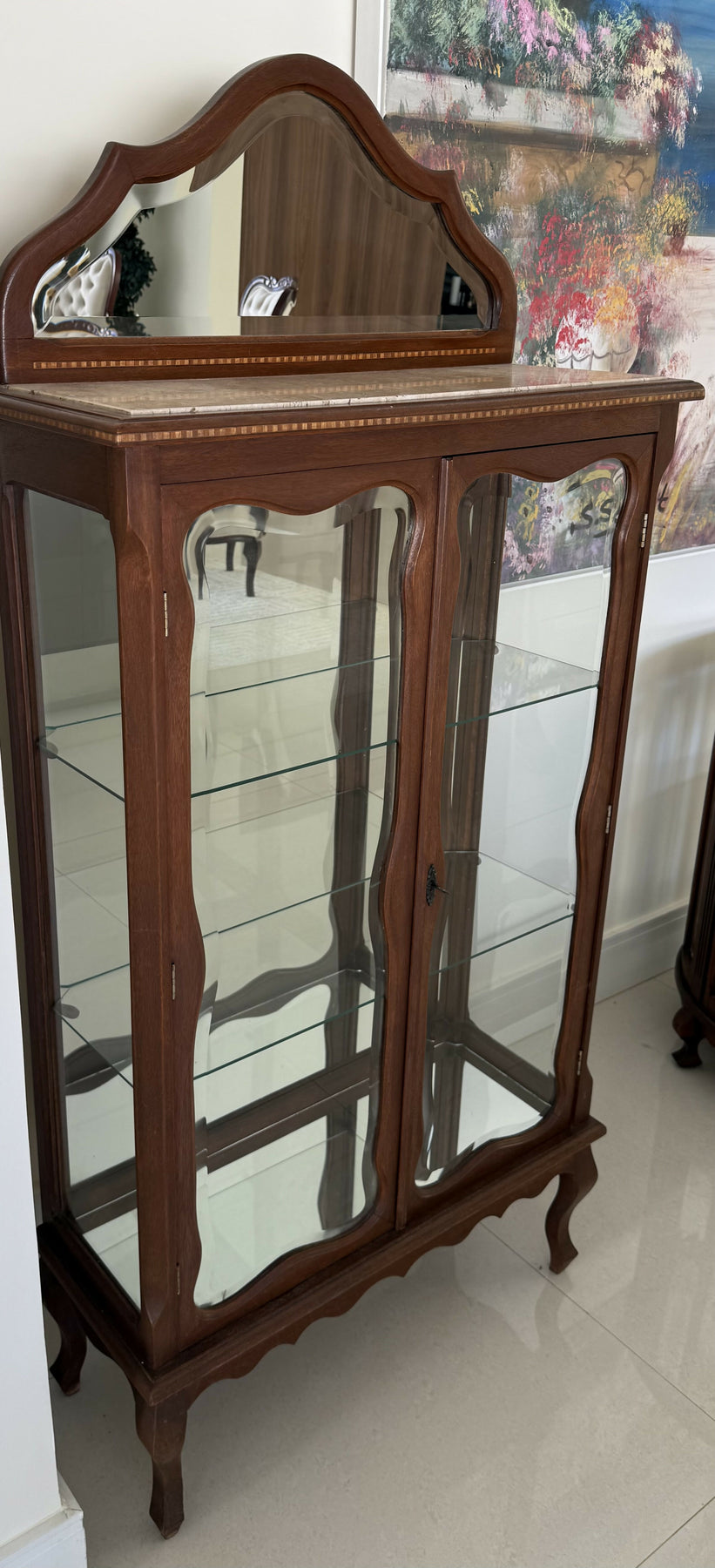 Pequena cristaleira de madeira nobre com lindos entalhes, marchetaria, vidros bisotados, espelho e tampo de mármore.