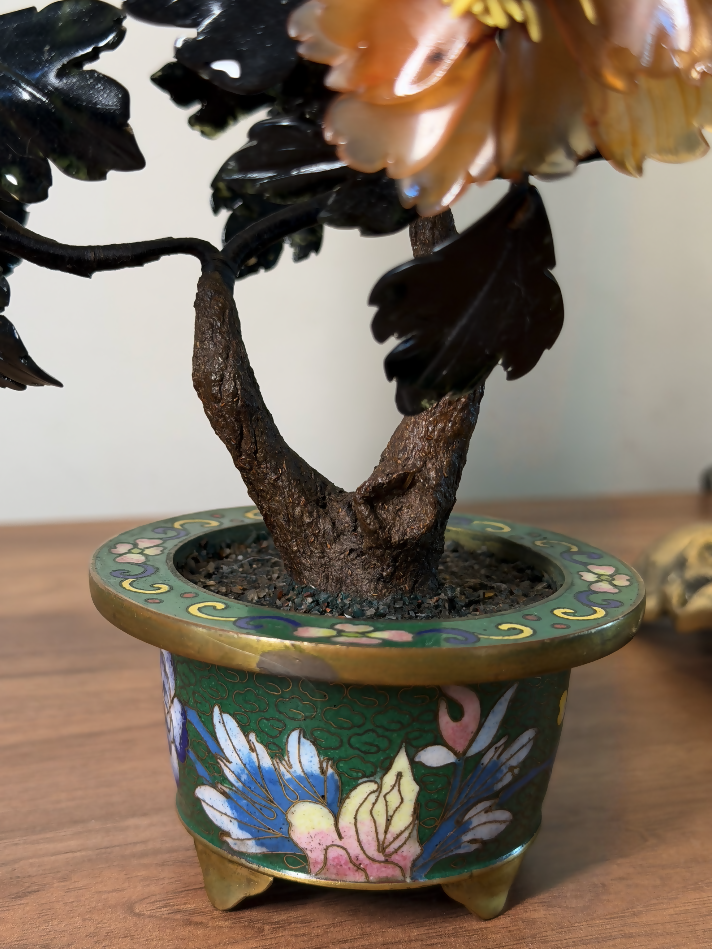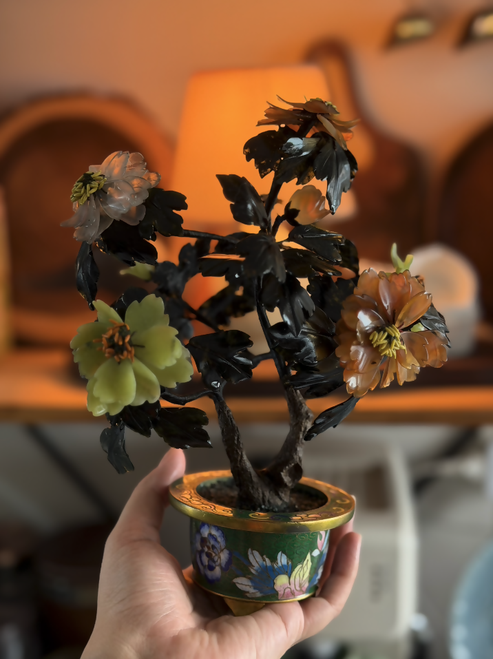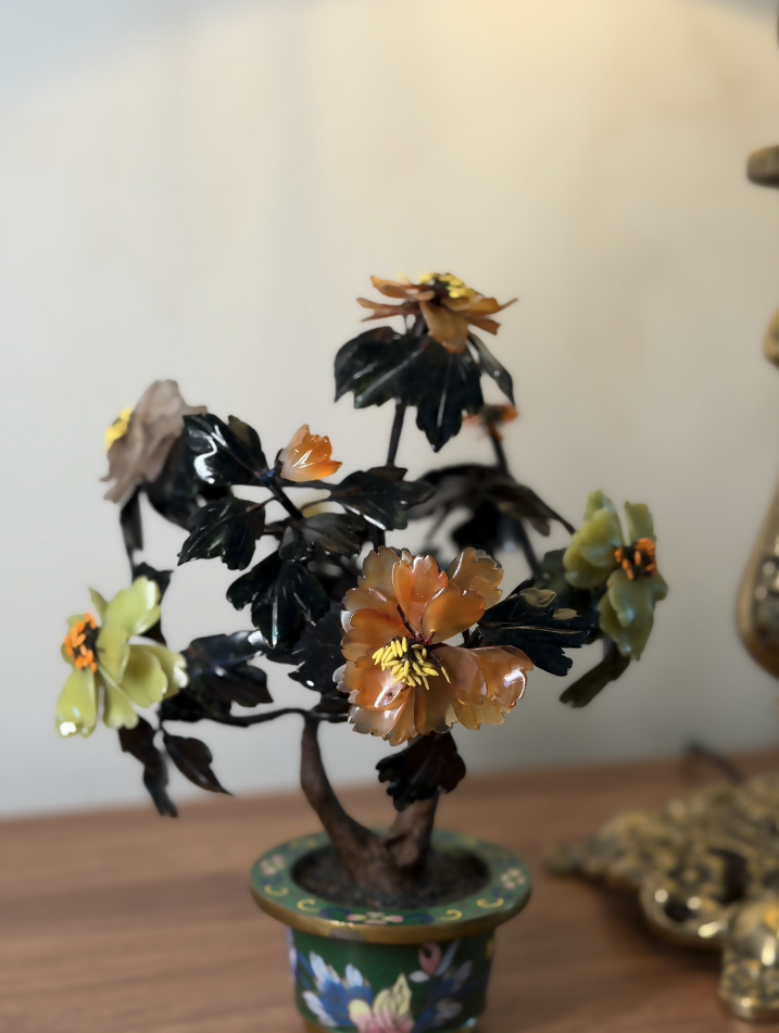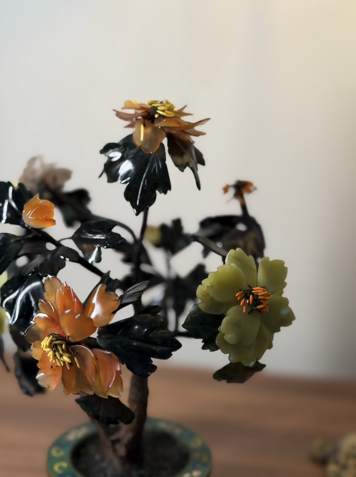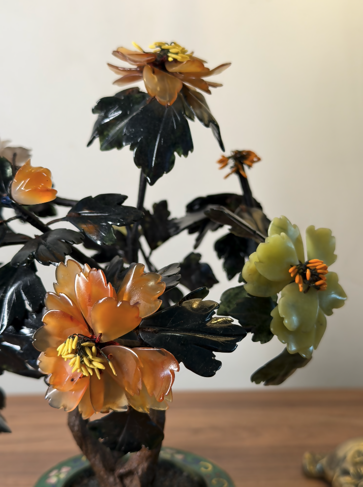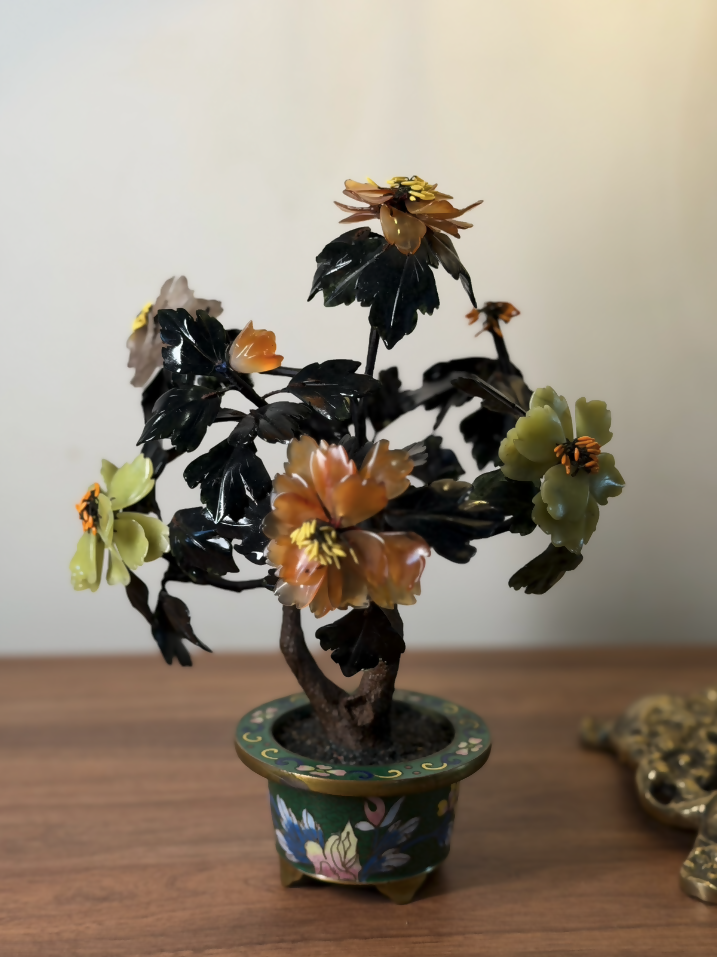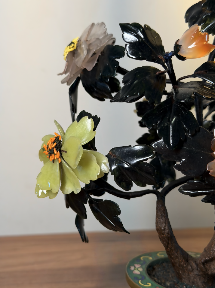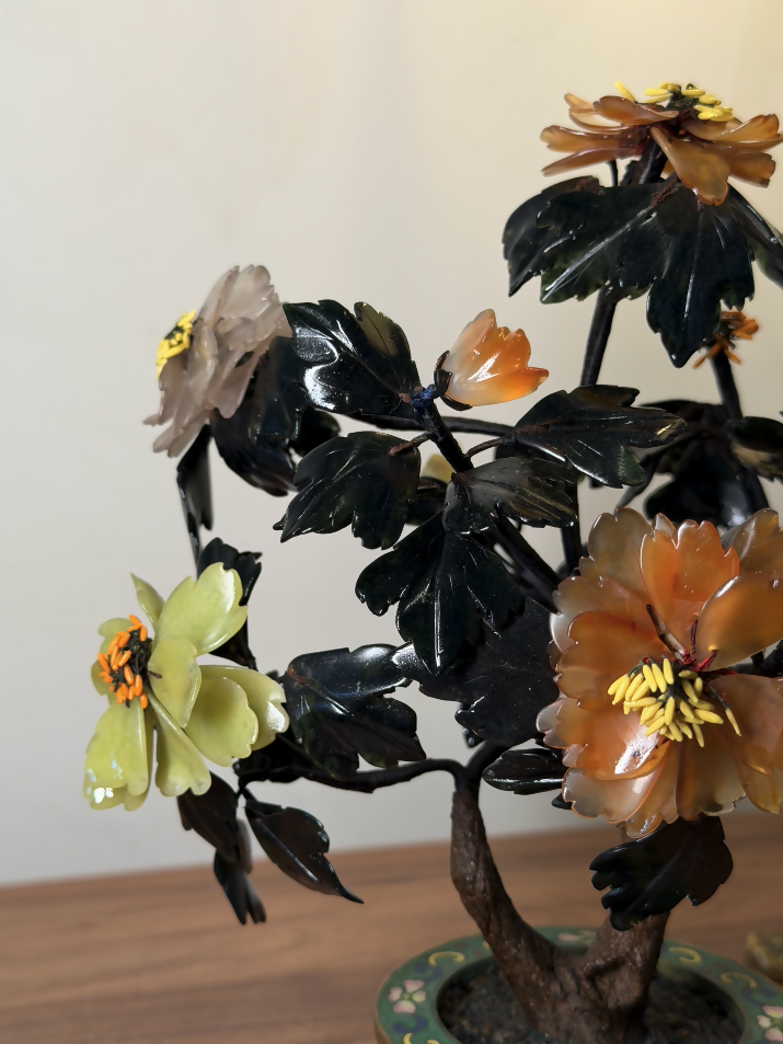 Esta árvore ornamental chinesa antiga, datada aproximadamente da década de 1920, é uma verdadeira joia da arte oriental artesanal. Produzida inteiramente à mão, apresenta galhos moldados manualmente e flores compostas por pedras naturais lapidadas uma a uma, tornando cada exemplar absolutamente único.