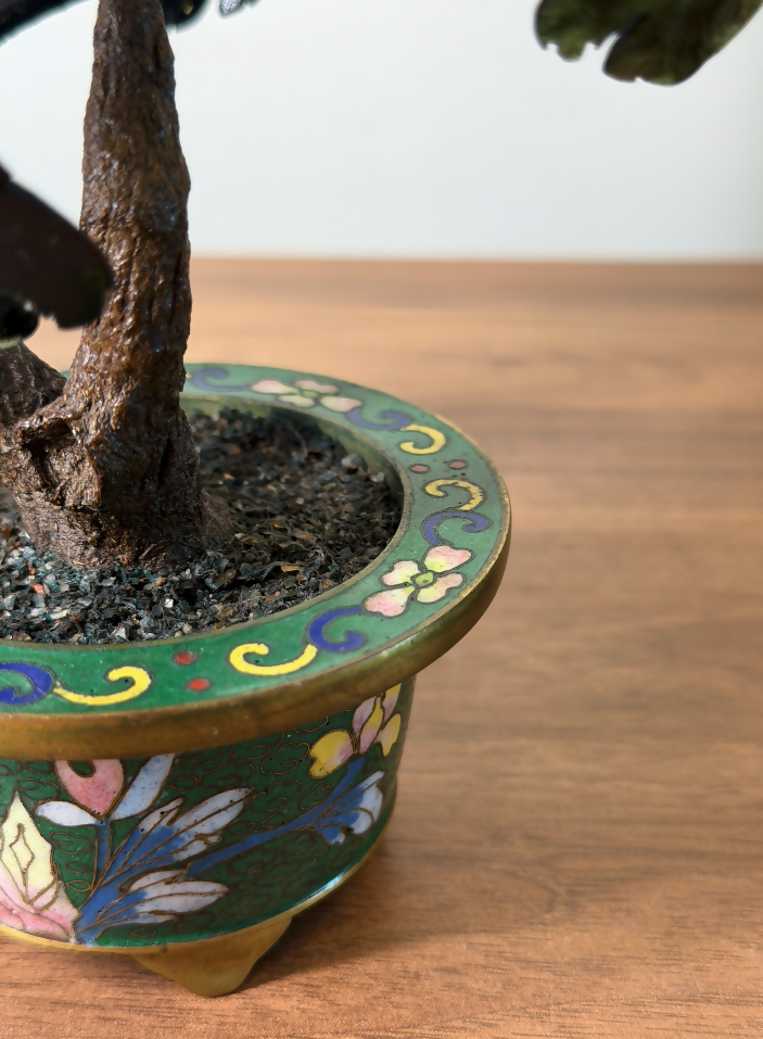 A base da peça é um elegante vaso em Cloisonné, técnica tradicional asiática altamente valorizada, que utiliza fios de metal para criar desenhos delicados, posteriormente preenchidos com esmaltes coloridos e levados à queima. O resultado são cores profundas, brilho refinado e riqueza de detalhes, características típicas de peças colecionáveis e de alto valor artístico.