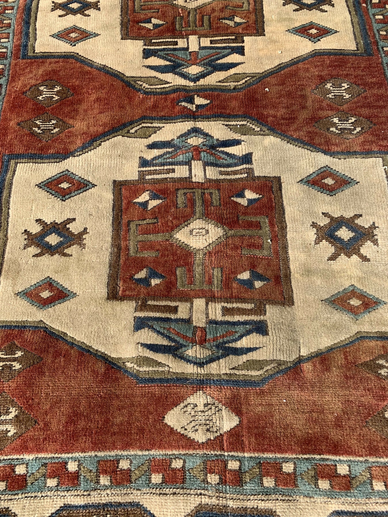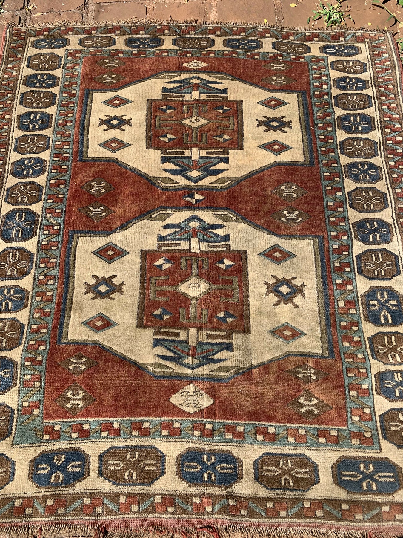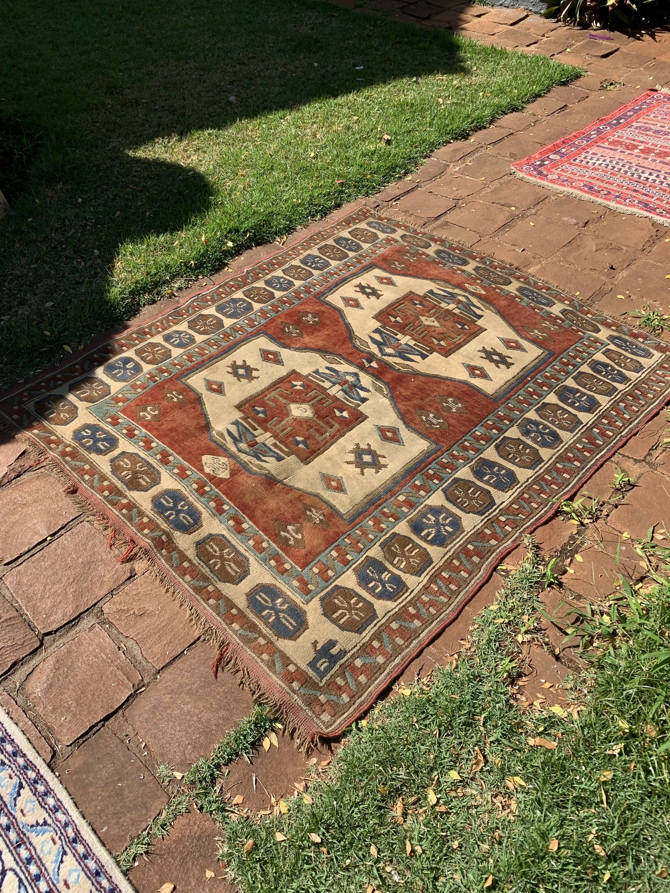 Tapete tons terrosos, com destaque para o vermelho queimado, bege e azul. O desenho geométrico central é cercado por uma borda rica em padrões simétricos, trazendo equilíbrio e força visual. Uma peça cheia de personalidade, ideal para valorizar ambientes com estilo autêntico e aconchegante.