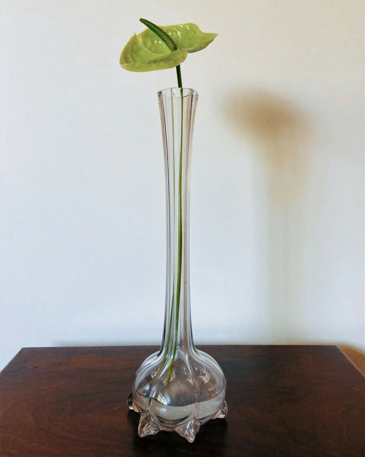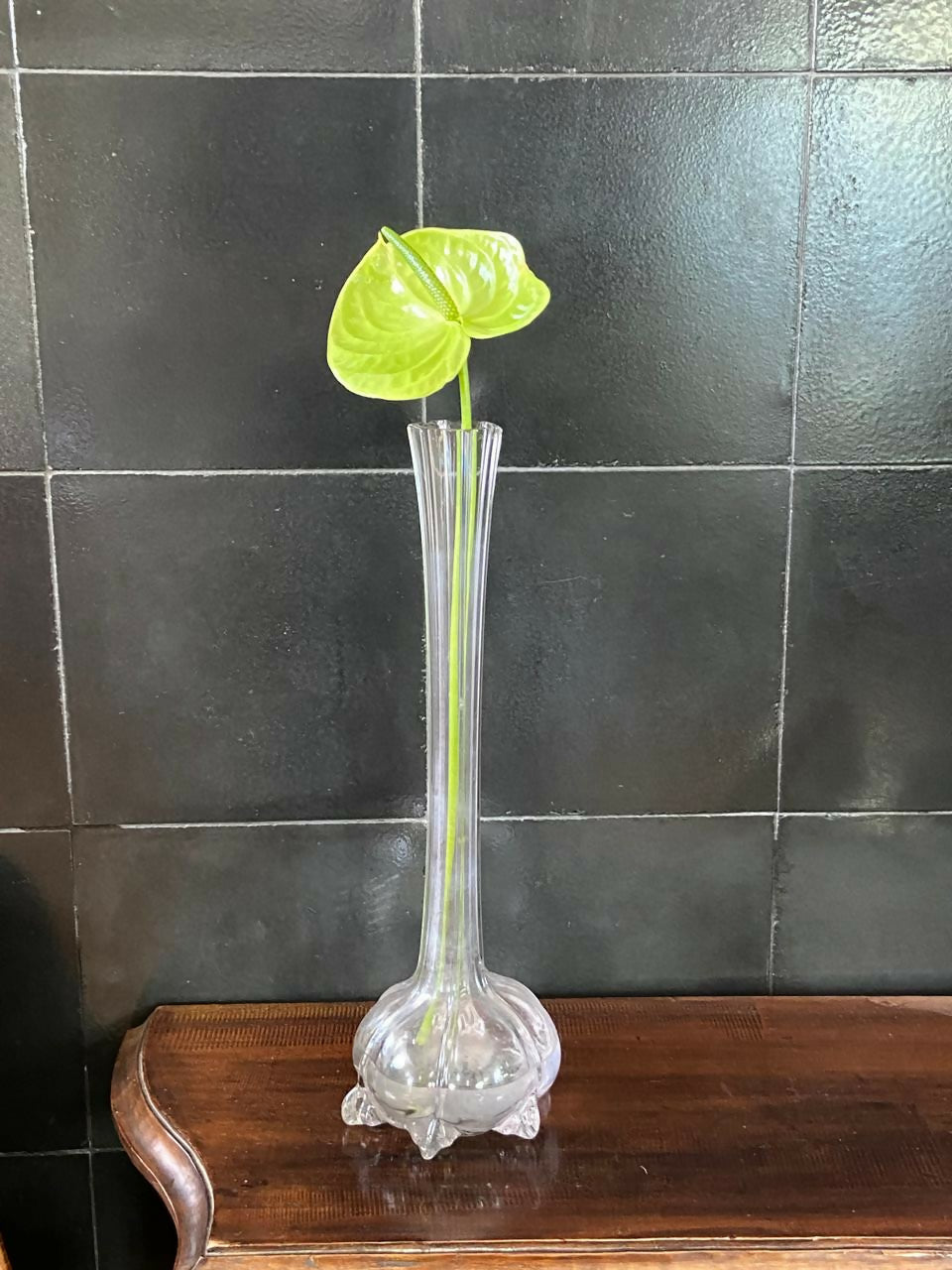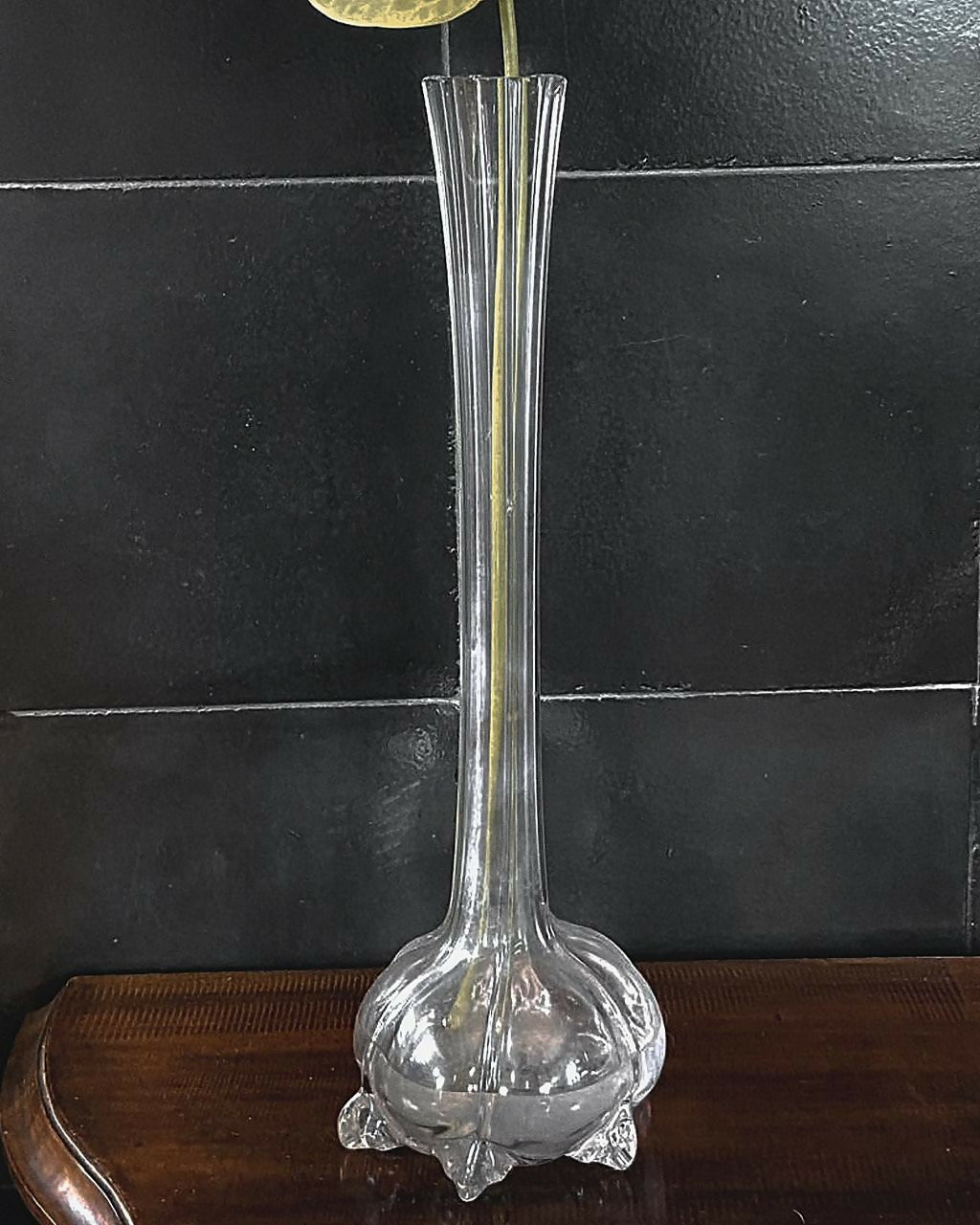 Um sopro de leveza em vidro. Sua base arredondada, delicadamente pinçada, parece conter a memória do gesto que o criou. A haste alongada e facetada, tão esguia, convida a olhar para cima, como se o vaso fosse feito para dar destaque a um único caule — simples e absoluto.
