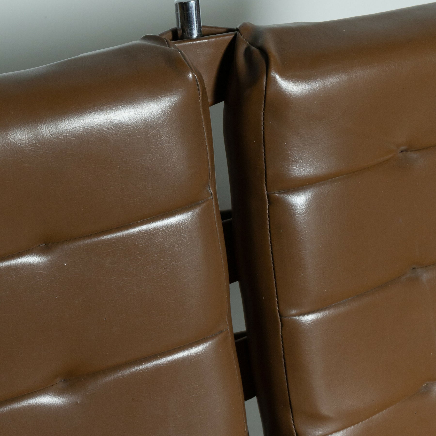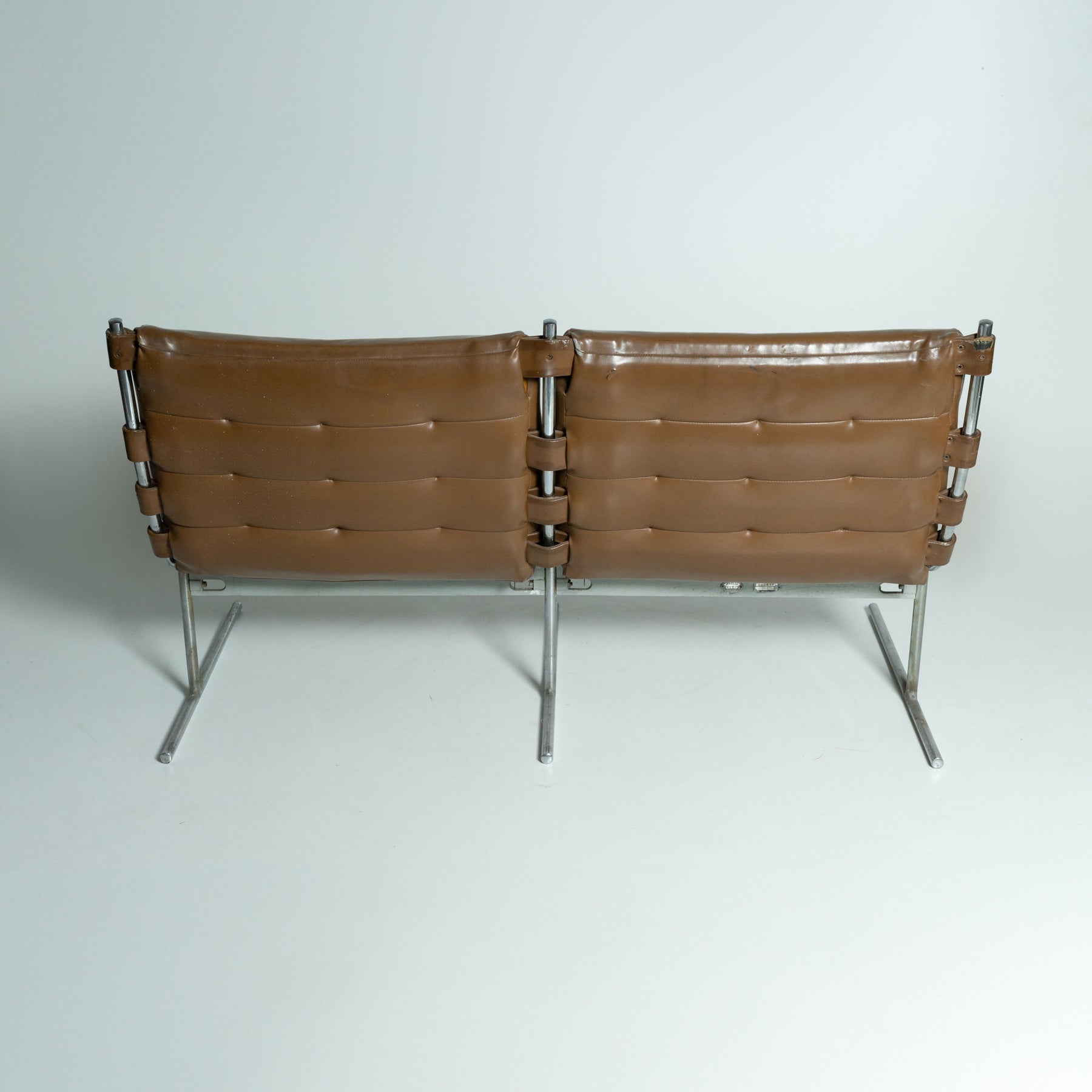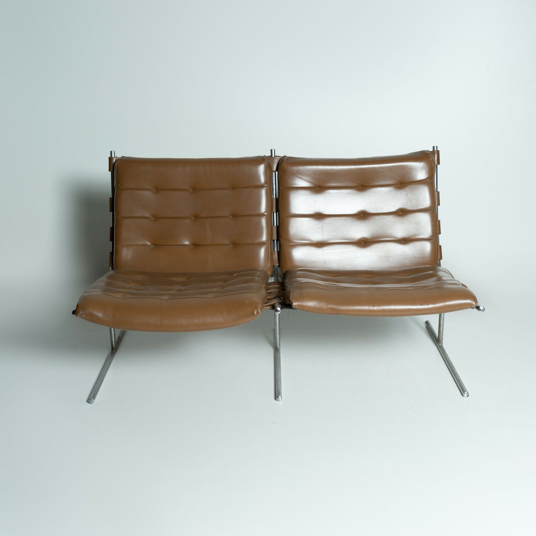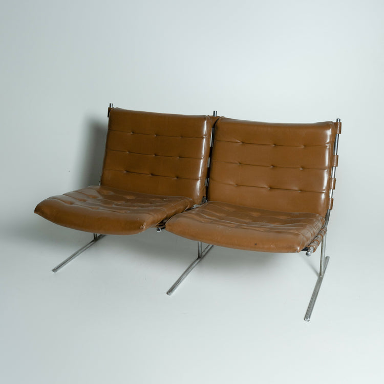 Jorge Zalszupin - Longarina Oxford com estrutura em metal cromado e assentos e encostos revestidos em couro caramelo. Brasil, c.