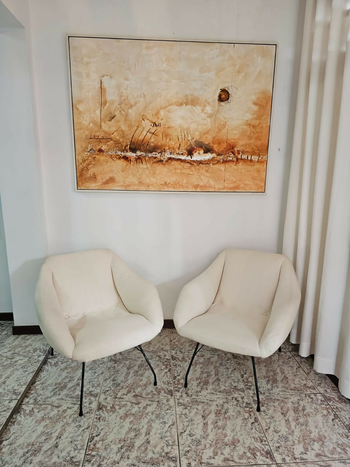 Martin Eisler & Carlo hauner ( Forma S.A)- 1954- Par de poltronas "Concha" executada em ferro sólido com assento e encosto num só corpo revestindo em linho cem porcento algodão.