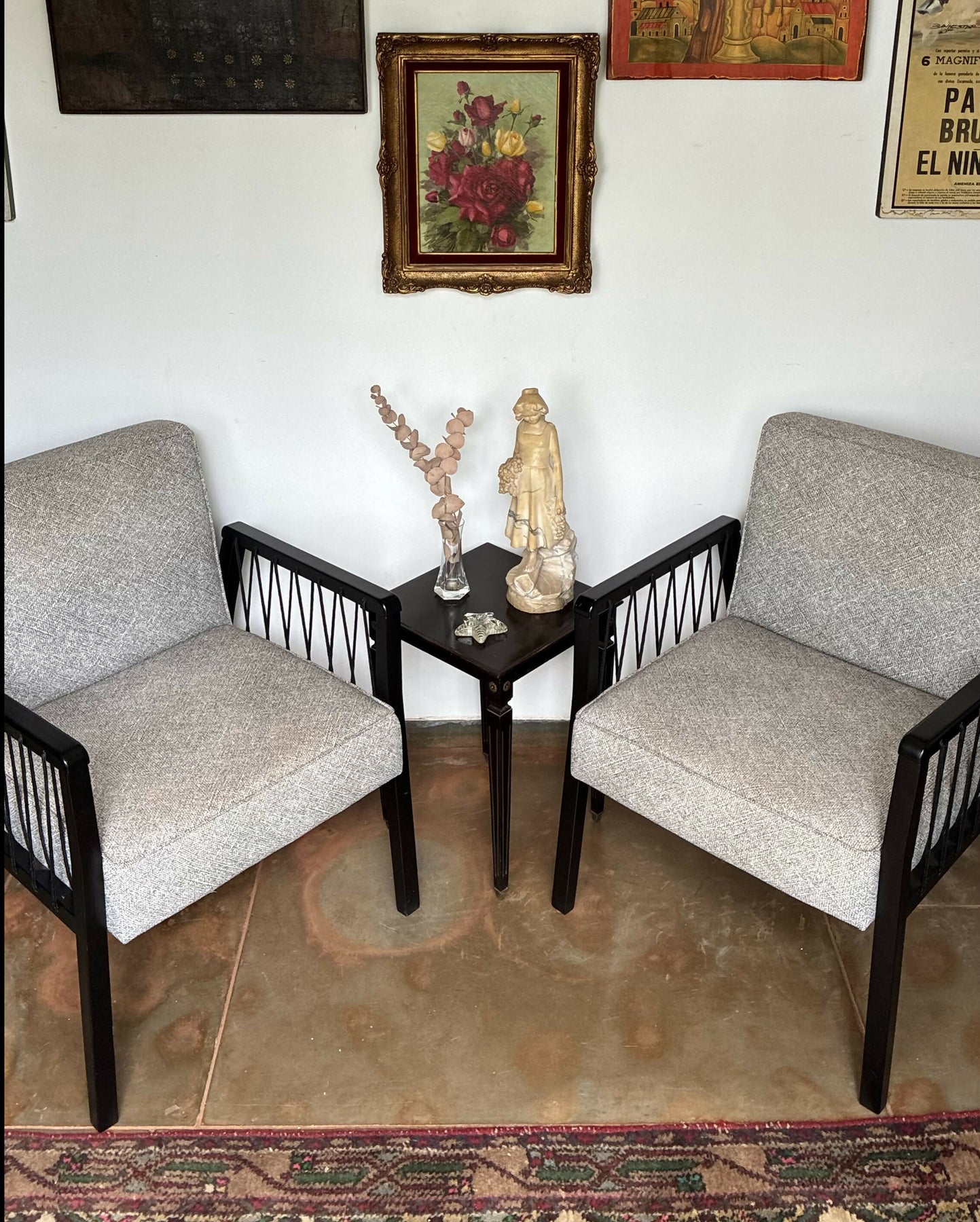 Par de  poltronas de linhas retas e elegantes, com estrutura em madeira de acabamento escuro e braços vazados que conferem leveza visual e sofisticação ao desenho. Os assentos e encostos são estofados em tecido , oferecendo conforto e versatilidade para diferentes estilos de decoração.