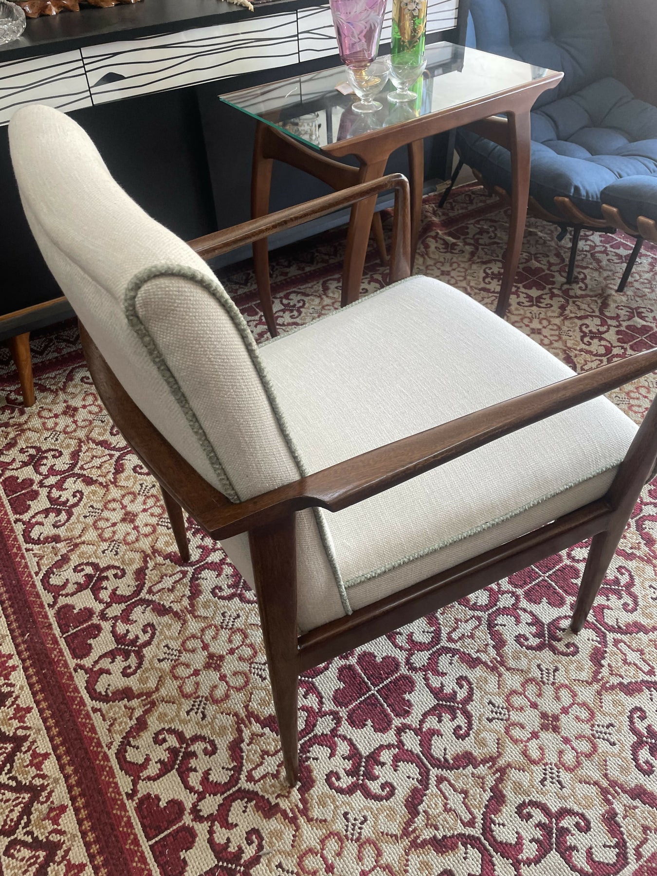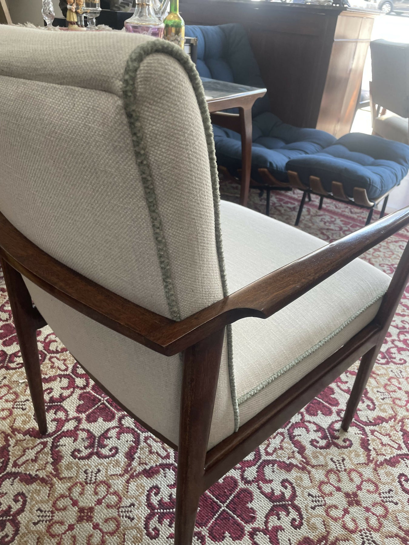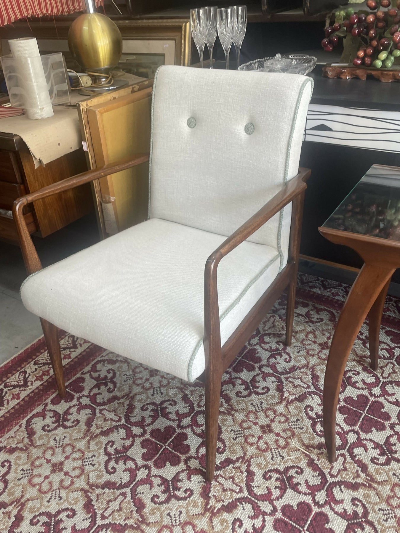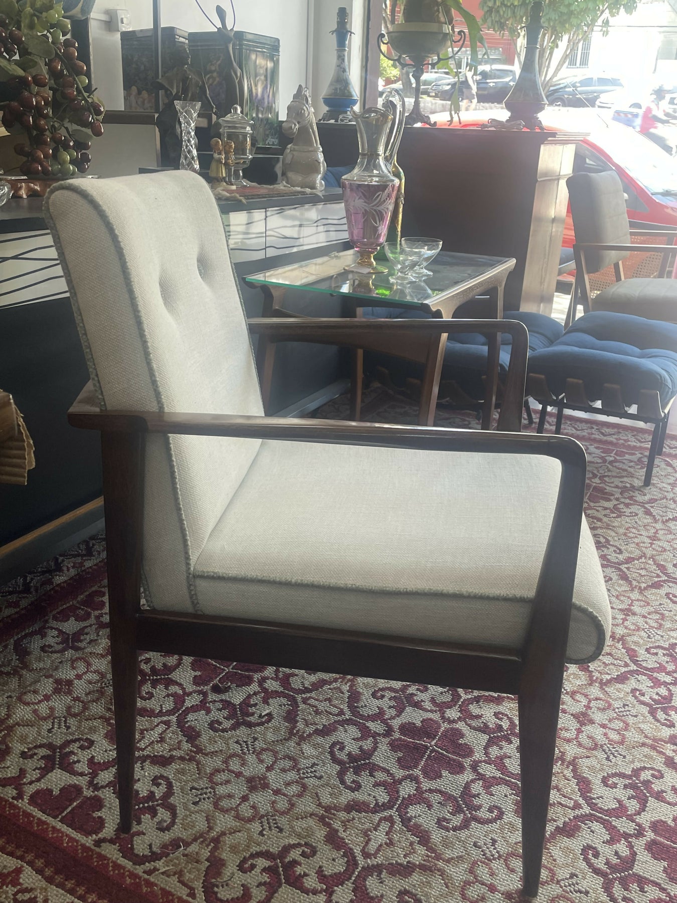 Produzida em madeira nobre, esta poltrona foi totalmente restaurada, com novo estofado que mantém a elegância e o conforto originais.