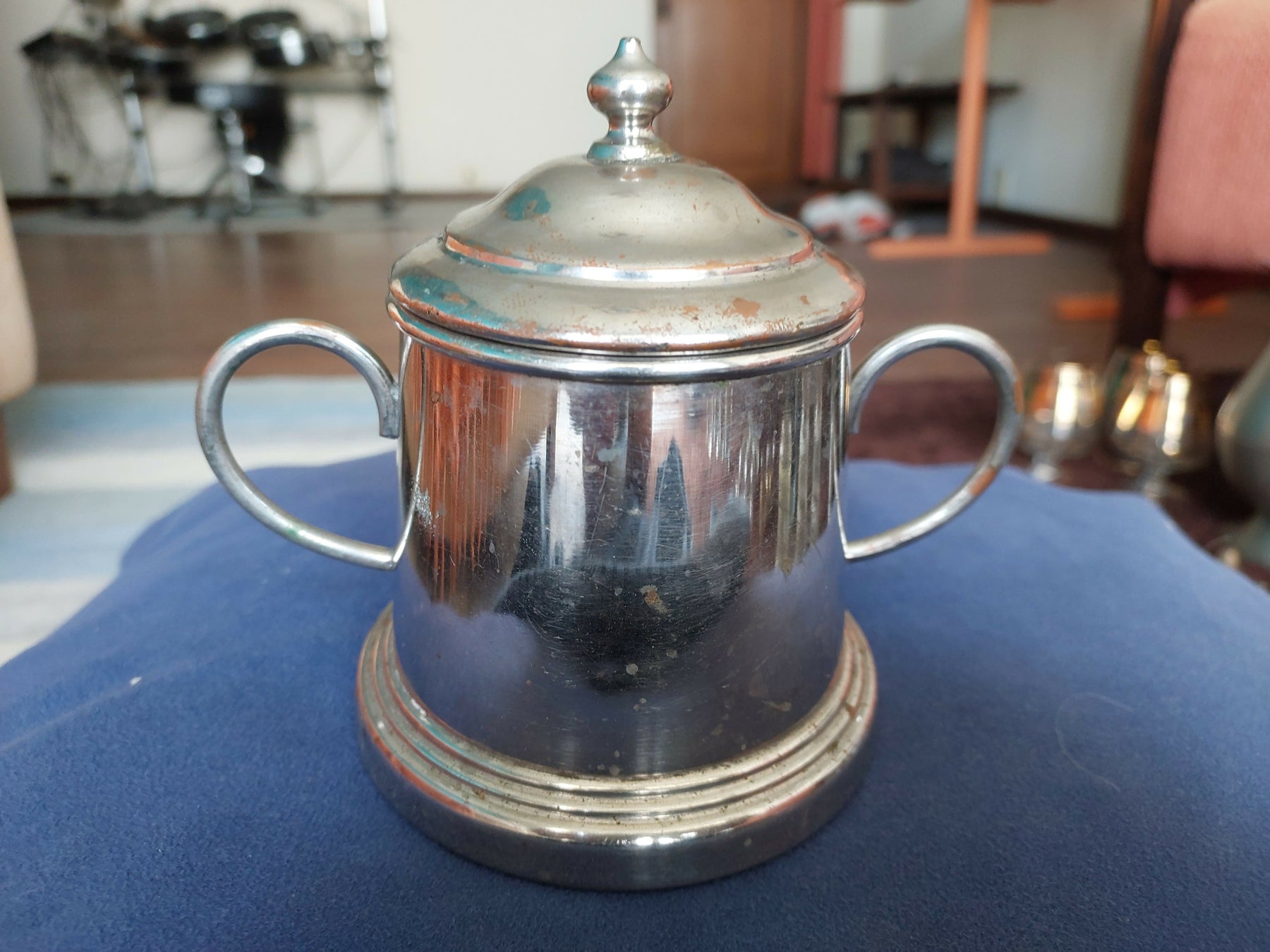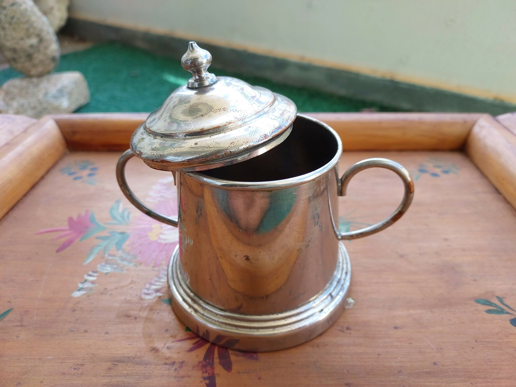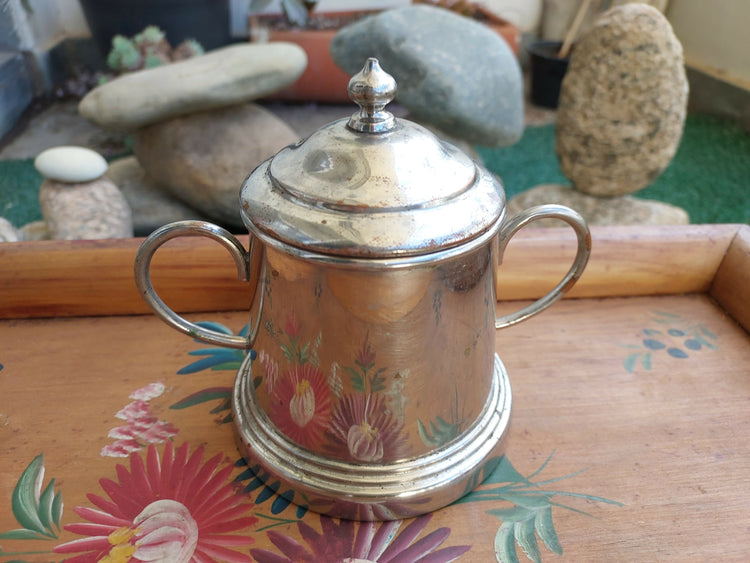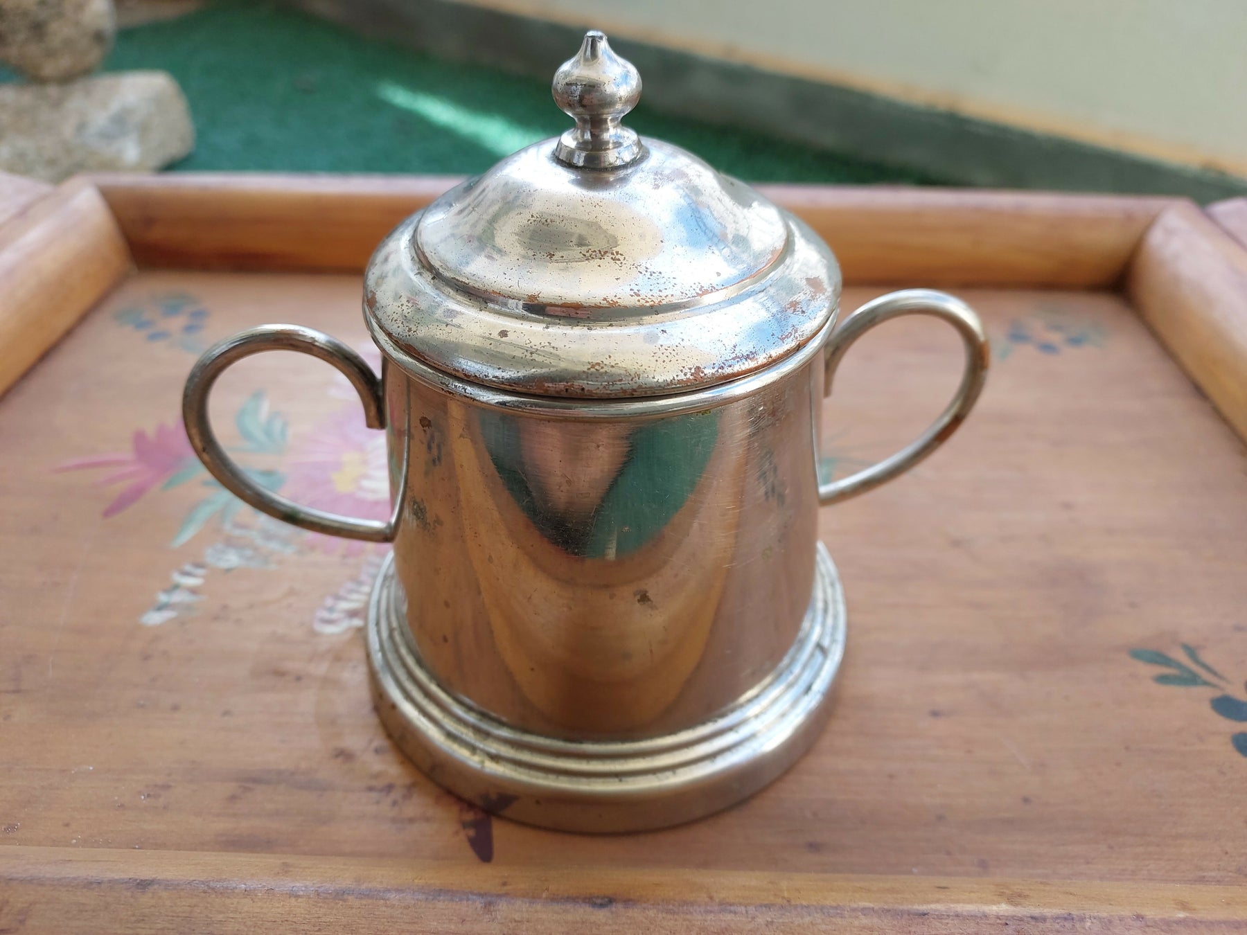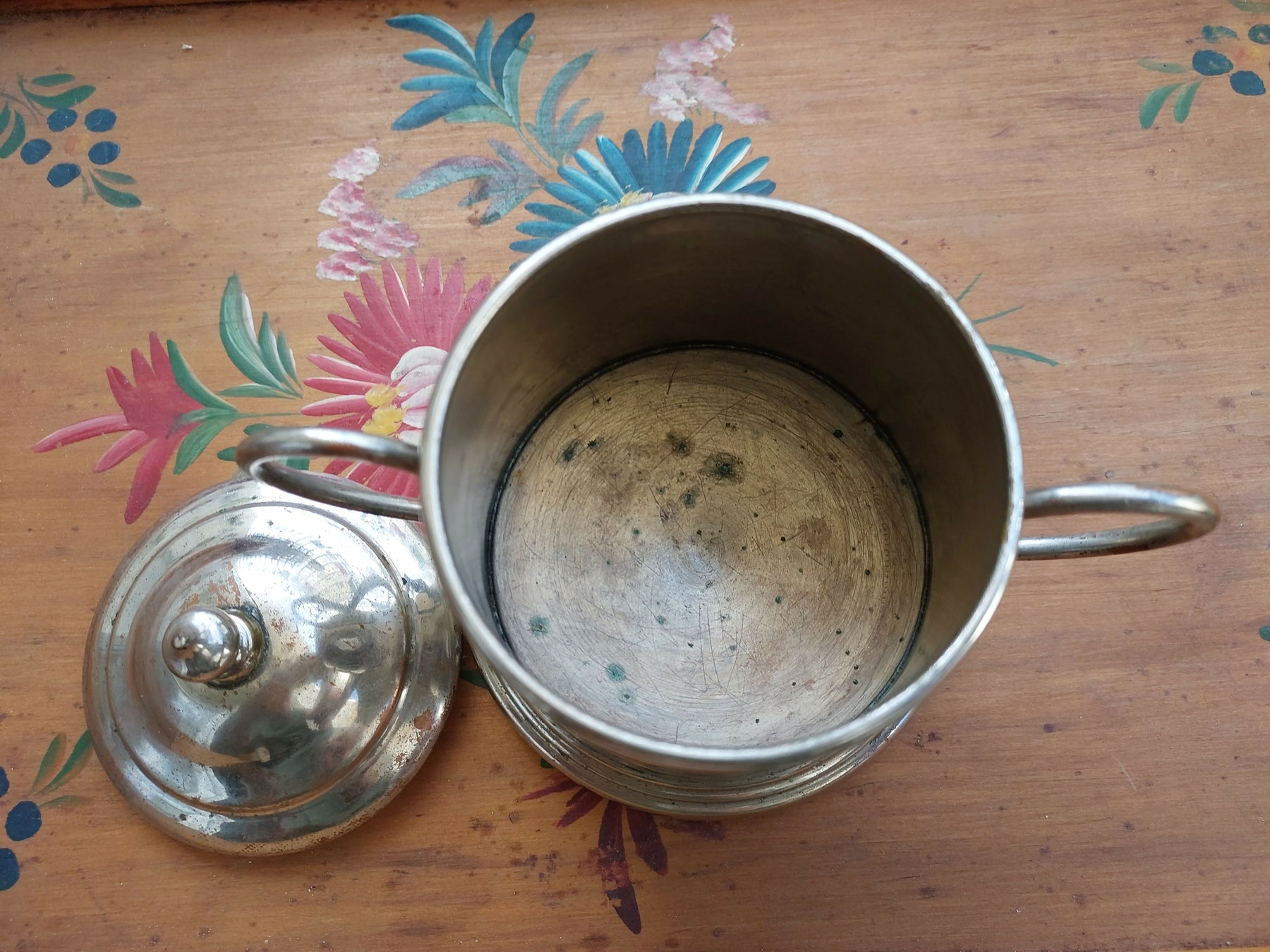Açucareiro Art Dèco com duas alças que lembra os açucareiros como nós o concebemos. Esteve à mesa de muitos cafés da manhã e chás da tarde desde o início da década de 60. Conta toda essa história em seu corpo. Amassados, arranhões, oxidação e o desgaste natural retiraram boa parte do banho de prata.