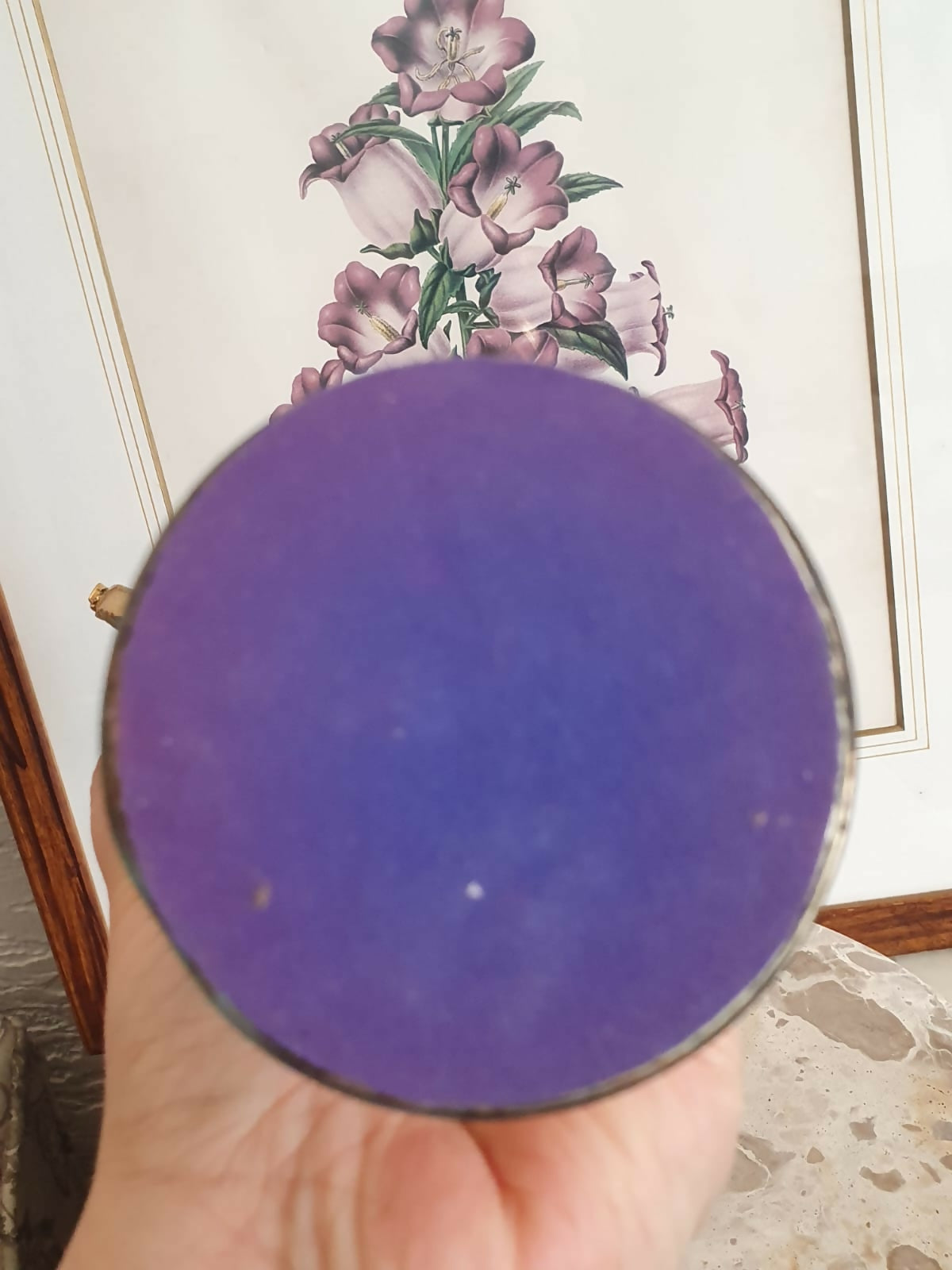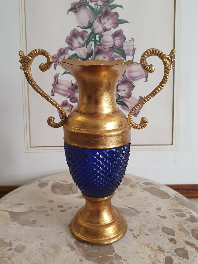 Ânfora de metal dourado com vidro bico de jaca azul cobalto. Linda!