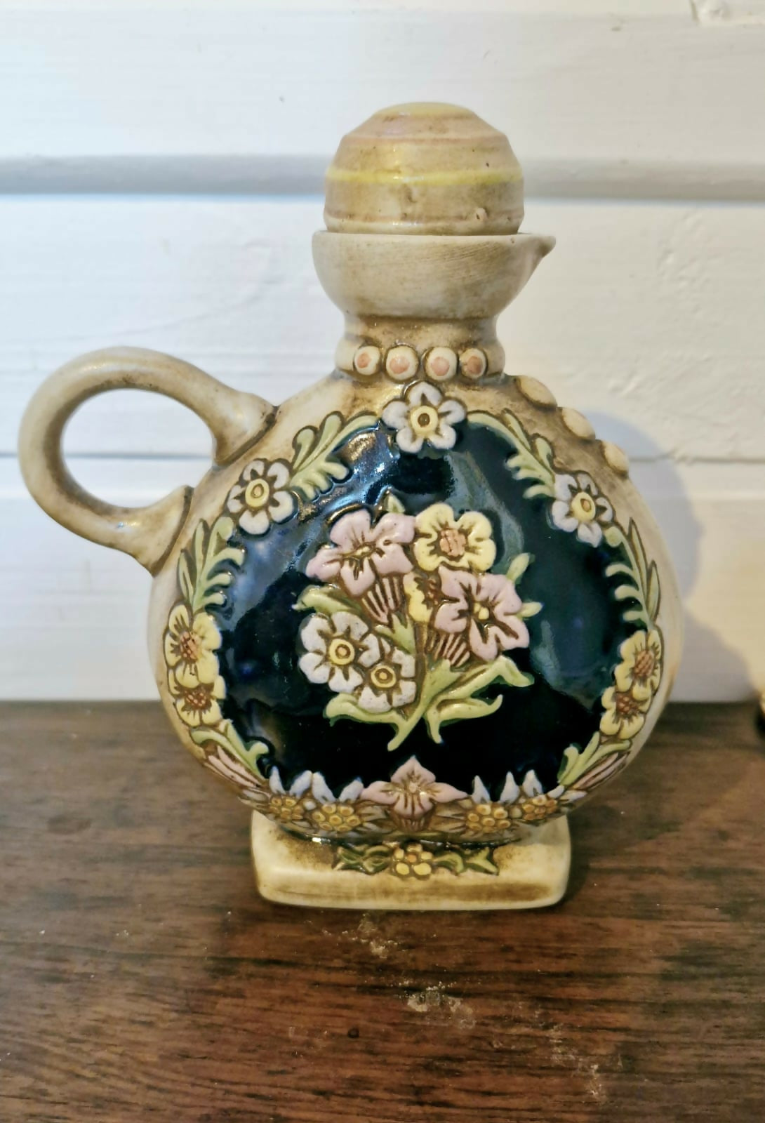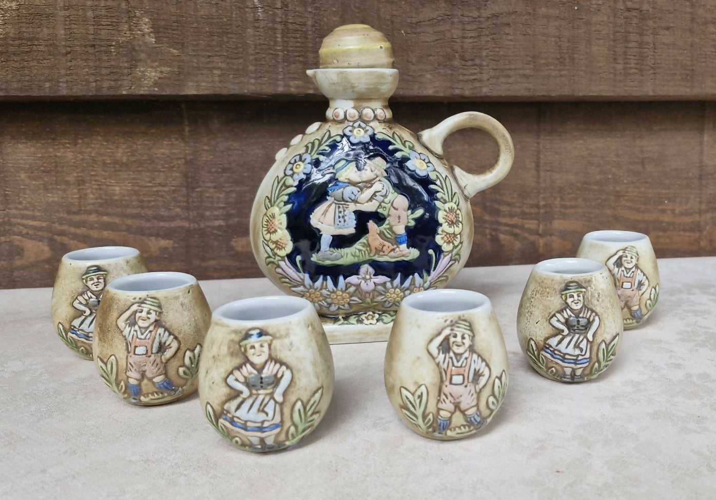 Raro e antigo conjunto de licoreira com 6 copinhos da marca Ceramarte, com trabalho em relevo em policromia, representando figuras em trajes típicos germânicos.