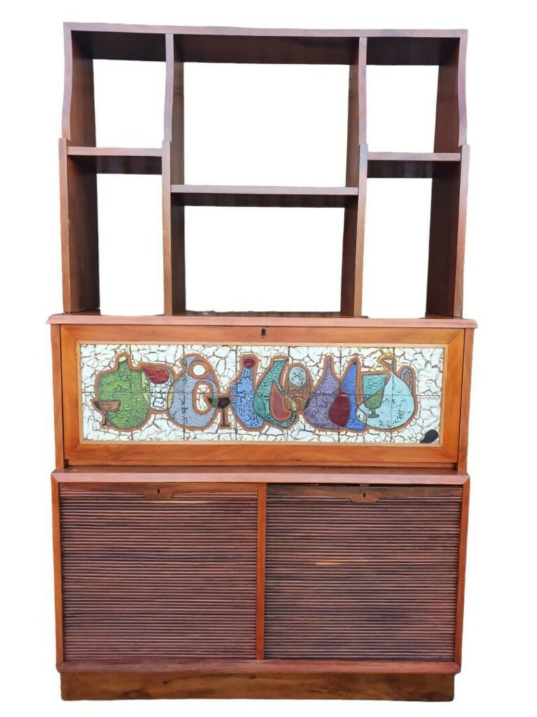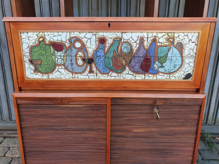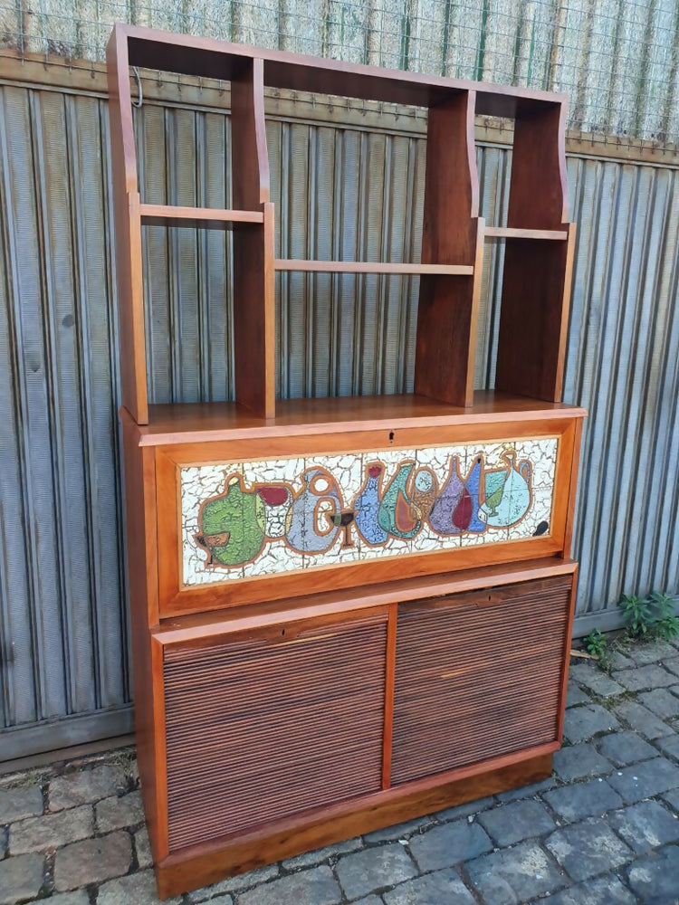 Belo armário/ estante anos 60, estrutura em madeira cabreúva, portas com sistema de correr em esteira interna, porta basculante central revestida com cerâmica do artista Zoltan Vertes.