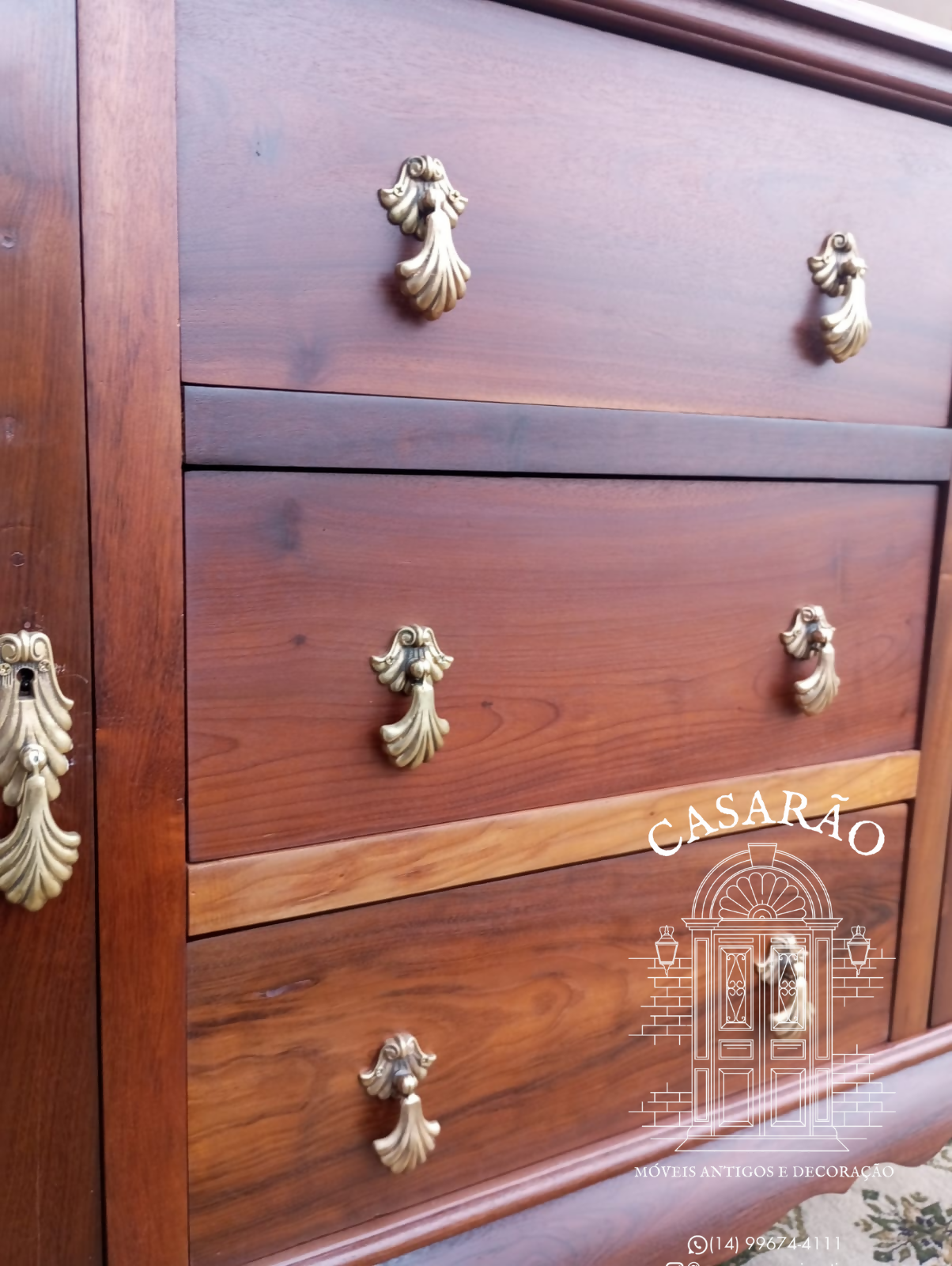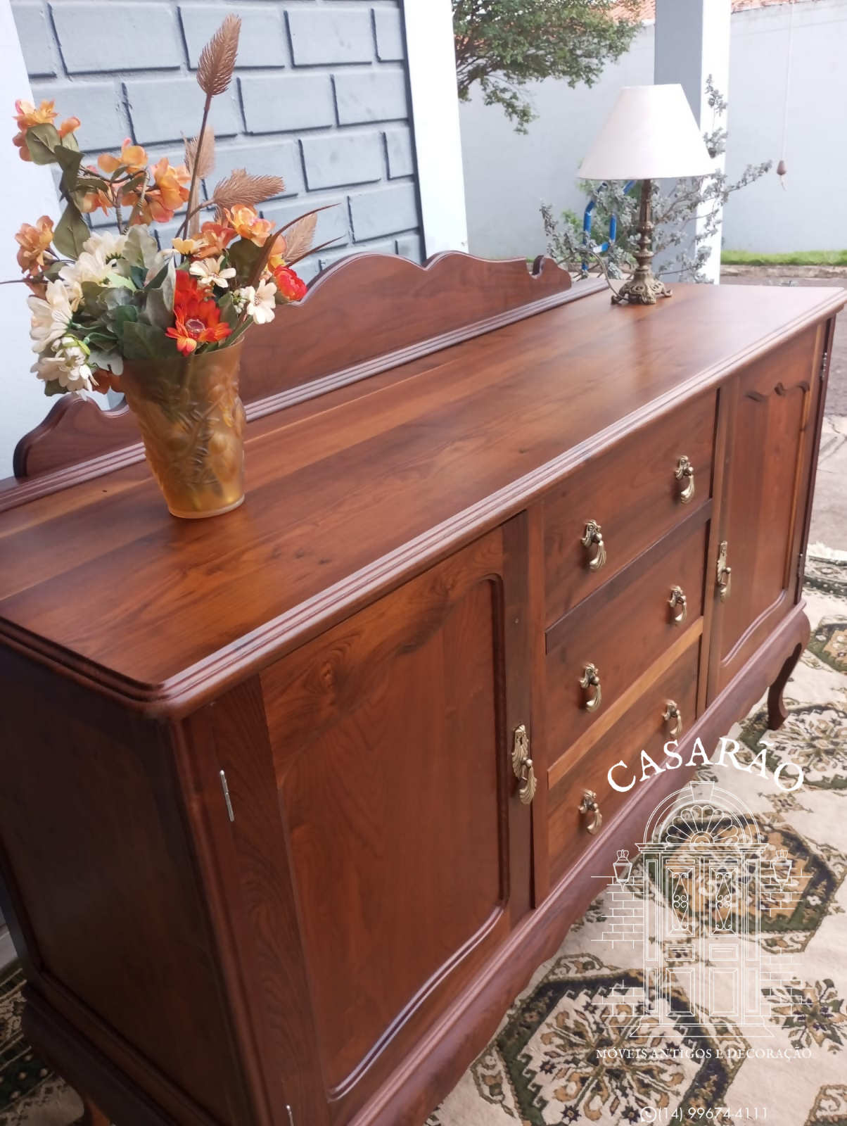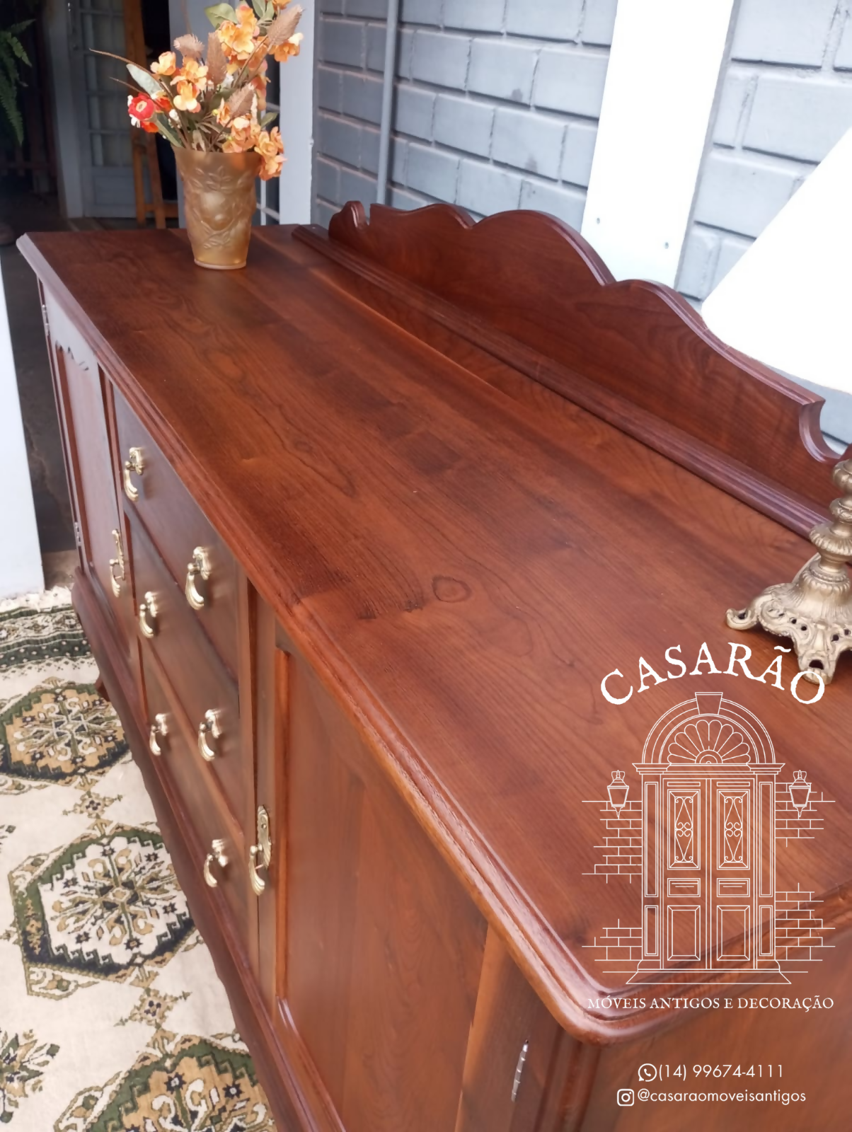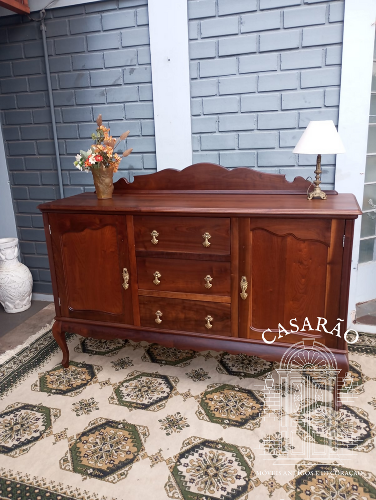 Buffet provençal em madeira maciça com puxadores ornamentados em forma de concha, portas almofadadas nas extremidades e gavetas centralizadas.