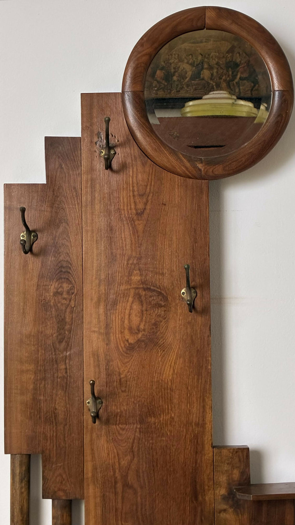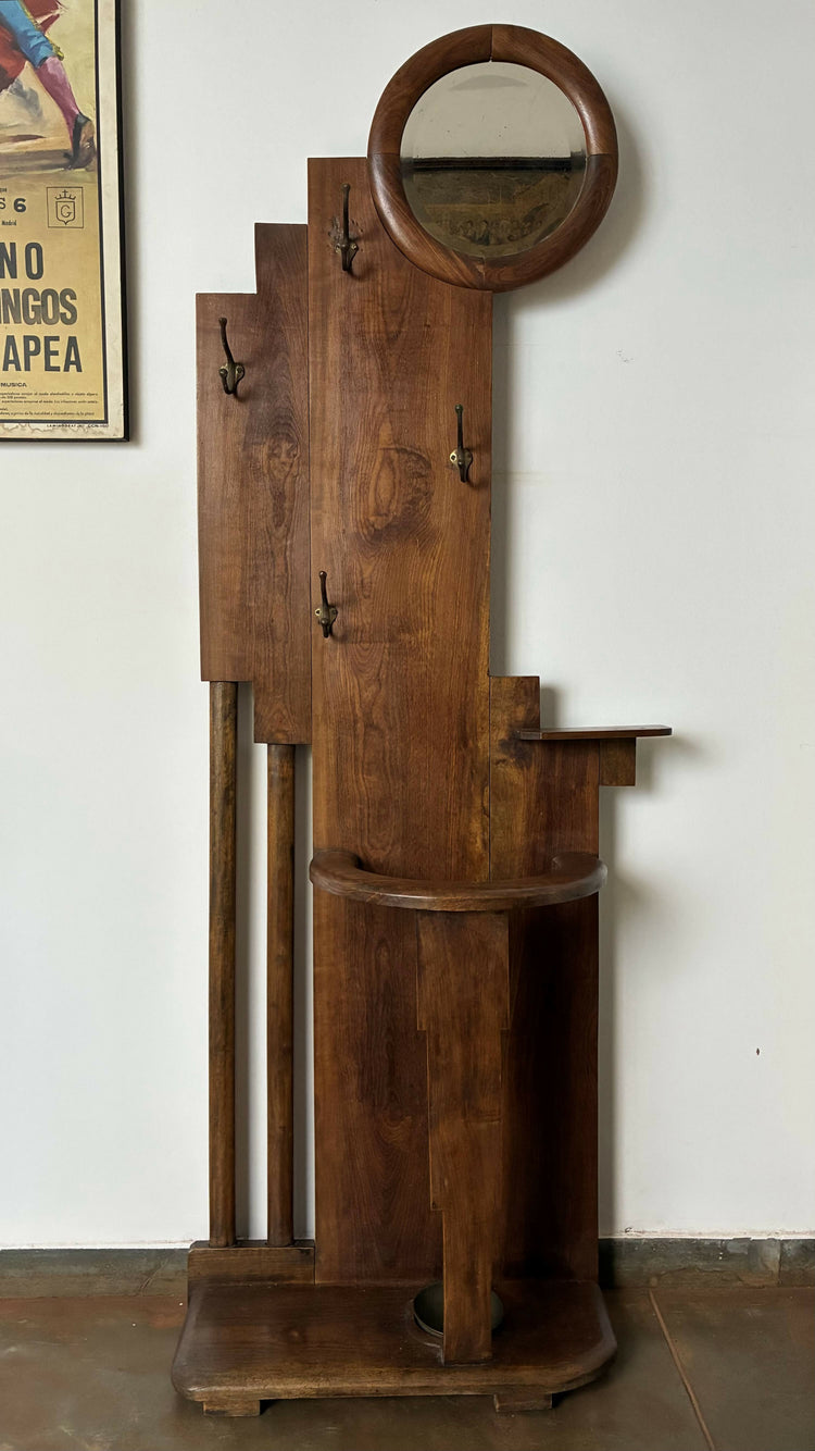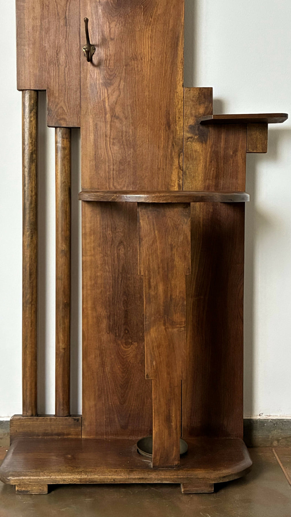 Chapeleira Art Déco em madeira, com design geométrico. A peça conta com ganchos metálicos originais para casacos e chapéus, além de suporte inferior para guarda-chuvas e pequeno aparador lateral.