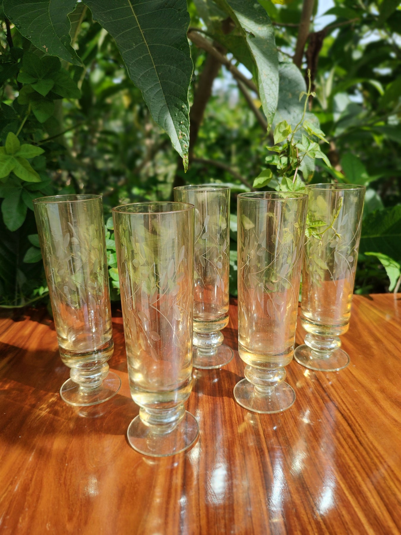 Conjunto de 5 Antigas Taças de Champagne Lapidadas em vidro levemente âmbar