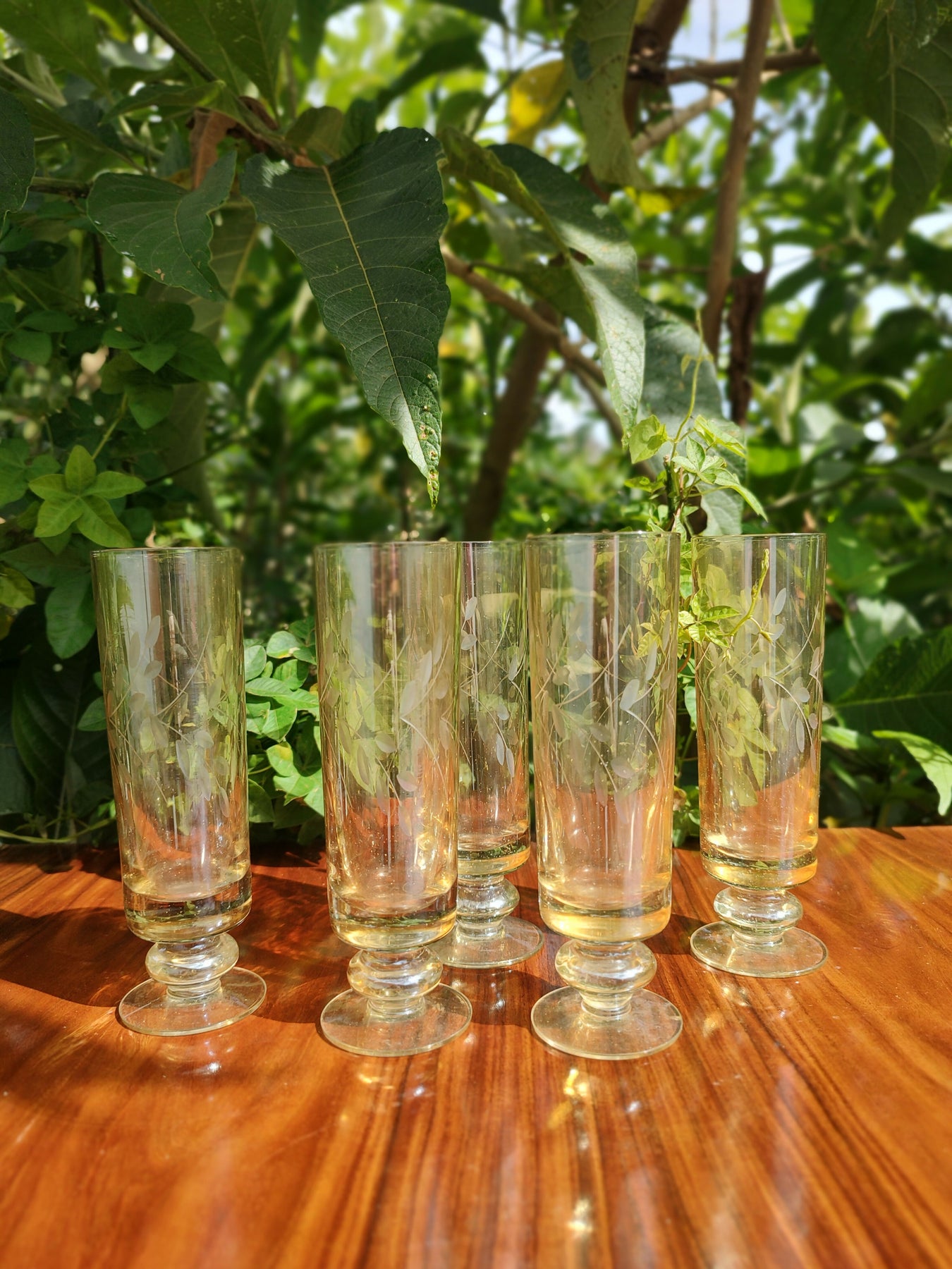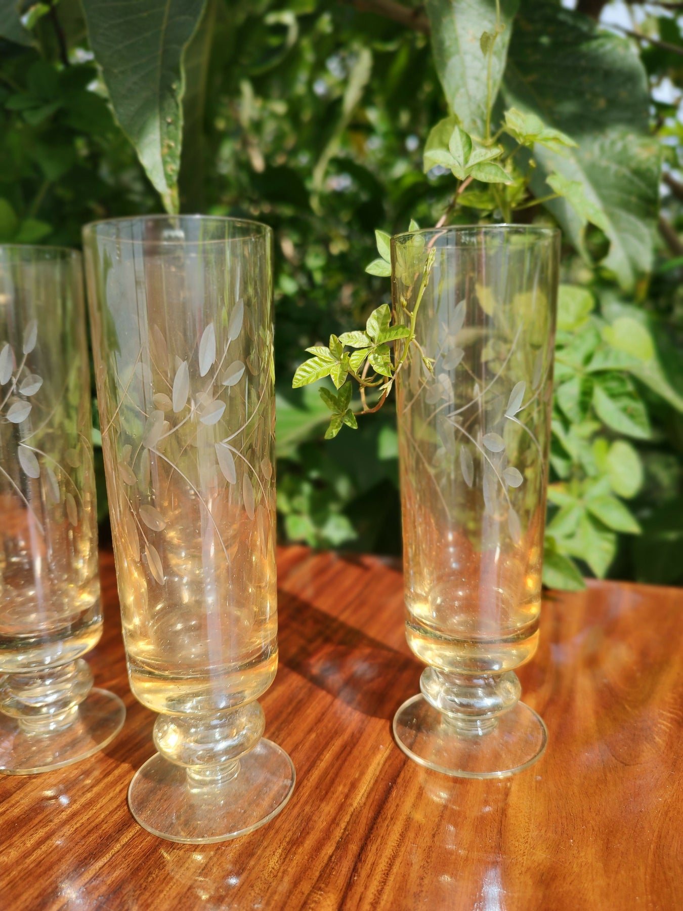 tim tim! ✨ 🥂  lindas taças antigas pra fazer um brinde cheio de nostalgia! conjunto lindão, de vidro levemente âmbar com detalhes de folhagem lapidada