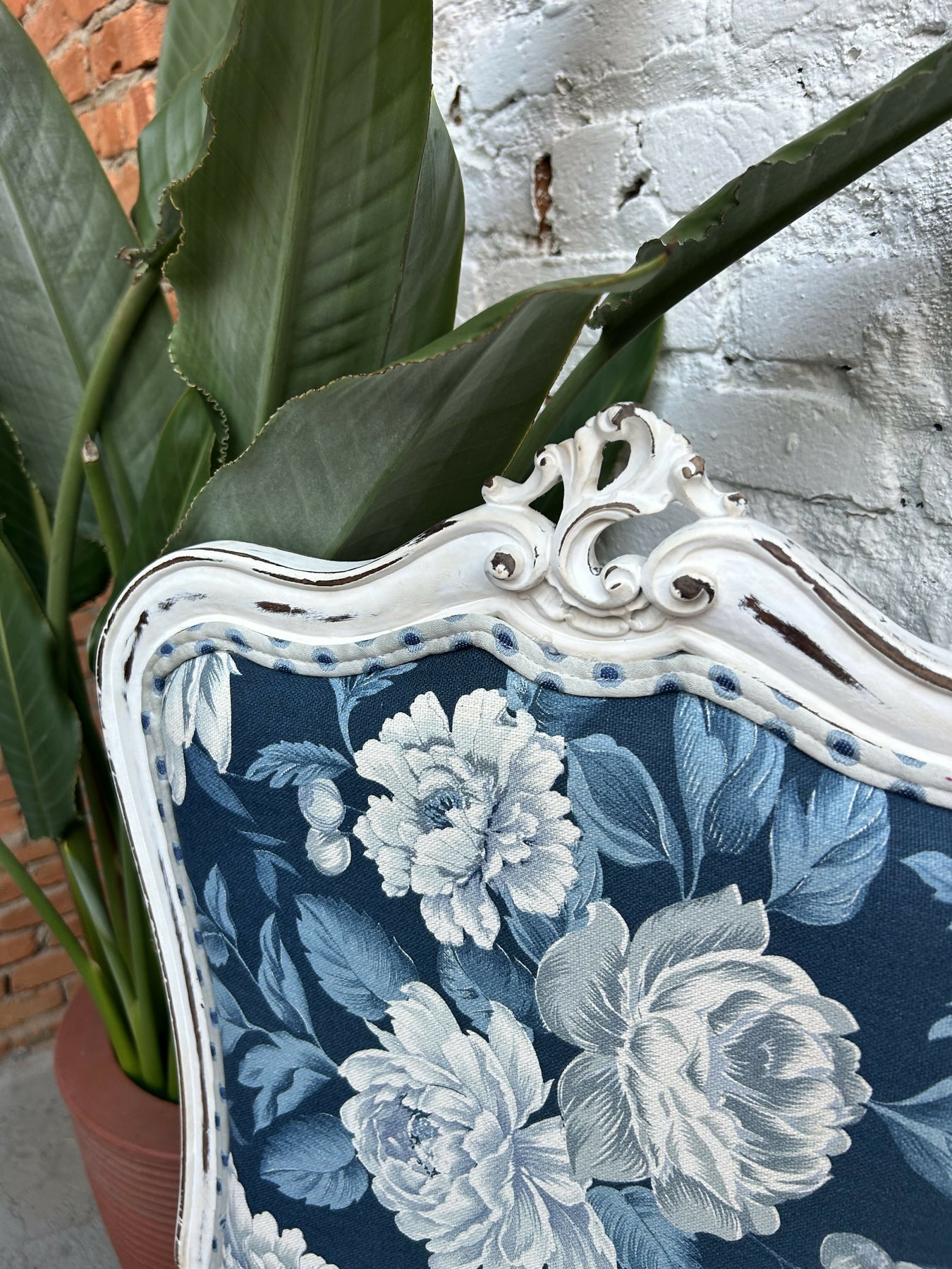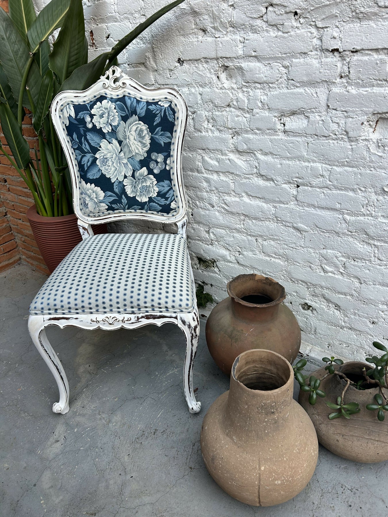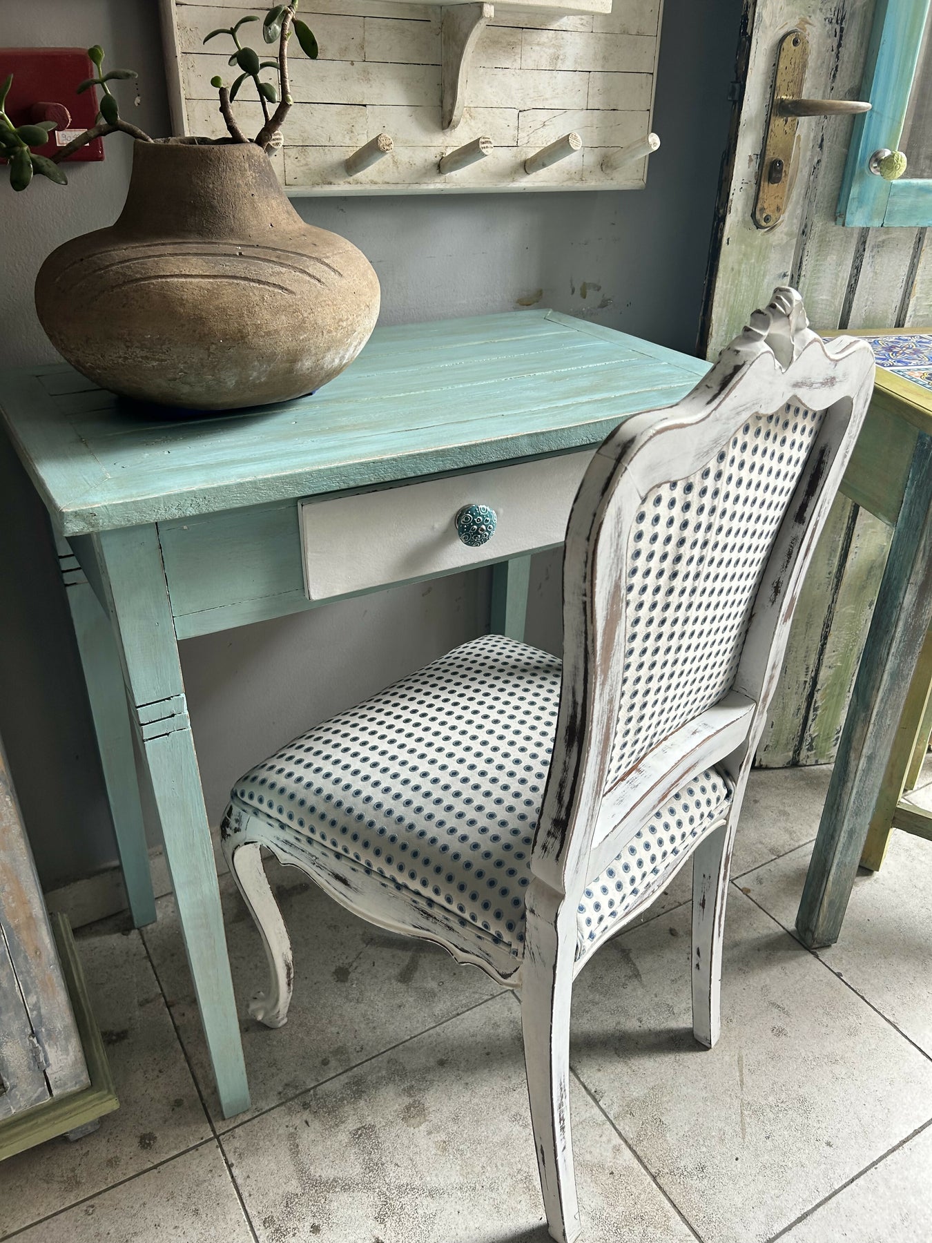 Escrivaninha com cadeira antiga, restaurada, patina e tapeçaria.