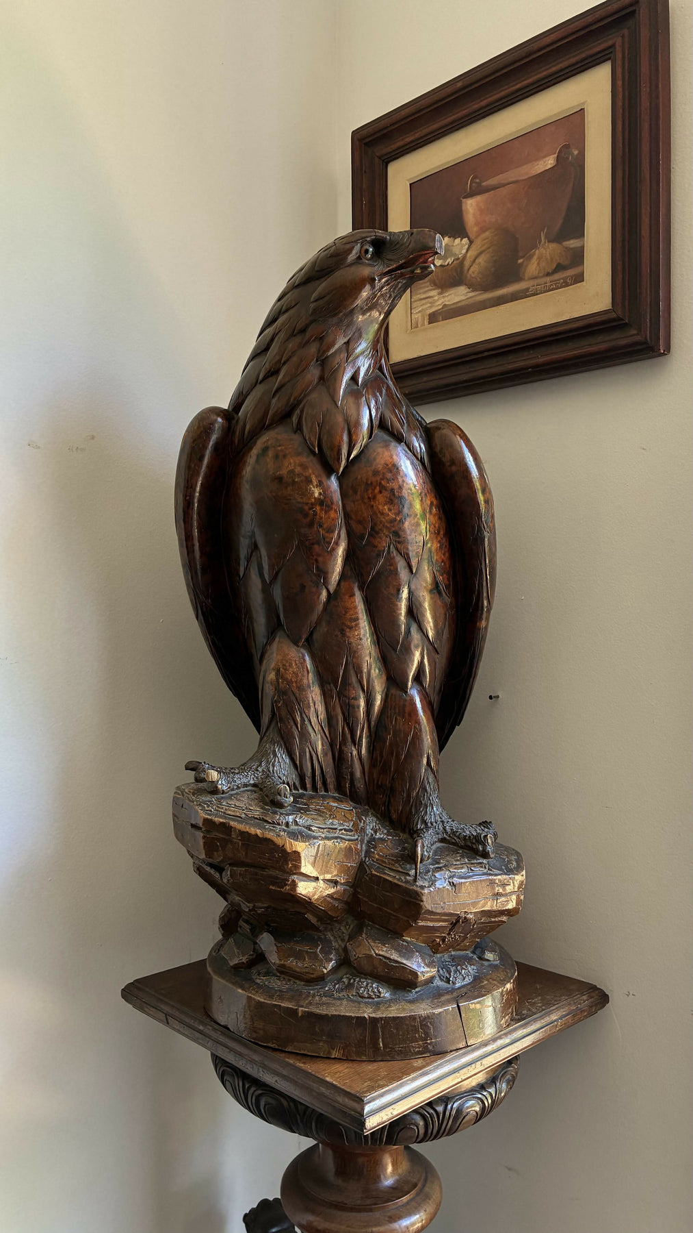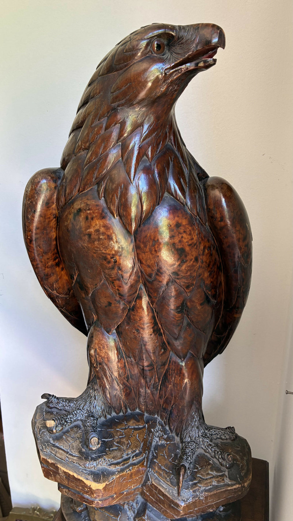 Imponente escultura de águia entalhada em madeira , com acabamento rico em detalhes que evidenciam o trabalho manual. As penas são cuidadosamente esculpidas, criando textura e movimento, enquanto o olhar expressivo e as garras apoiadas sobre base rochosa trazem força e realismo à peça.