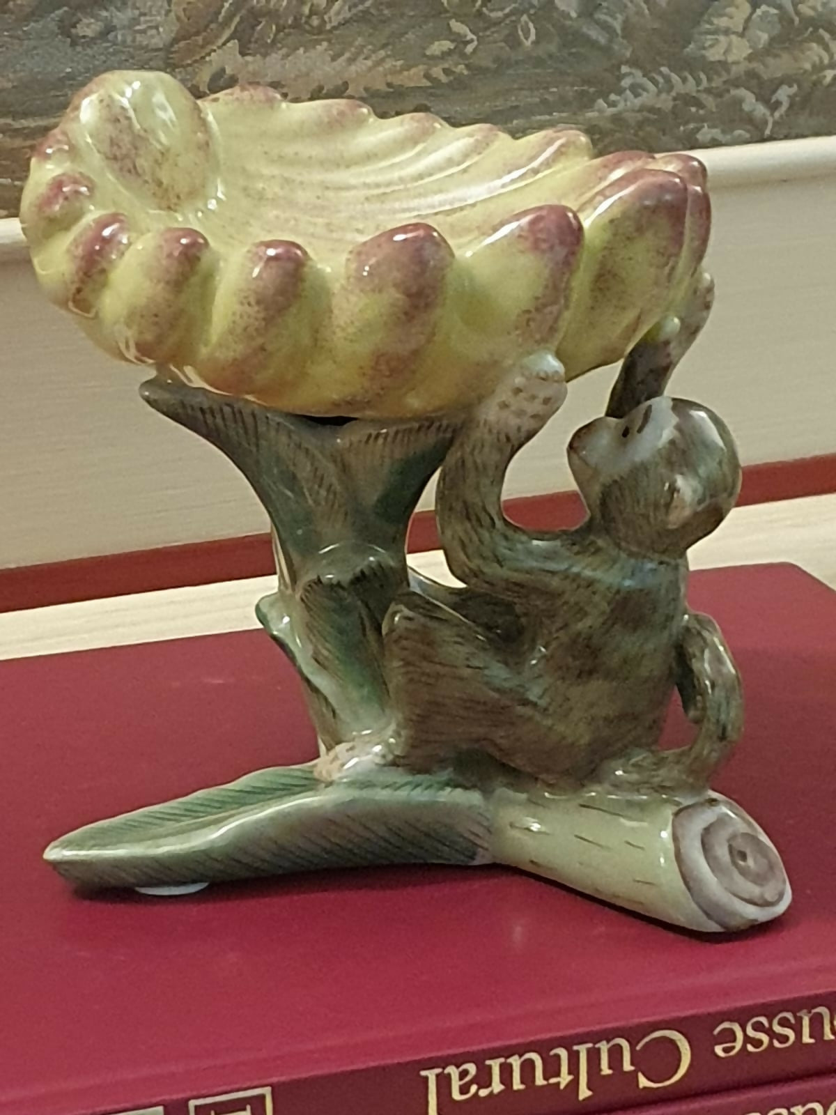 Escultura em cerâmica chinesa vintage, em formato de macaco segurando uma folha / concha.