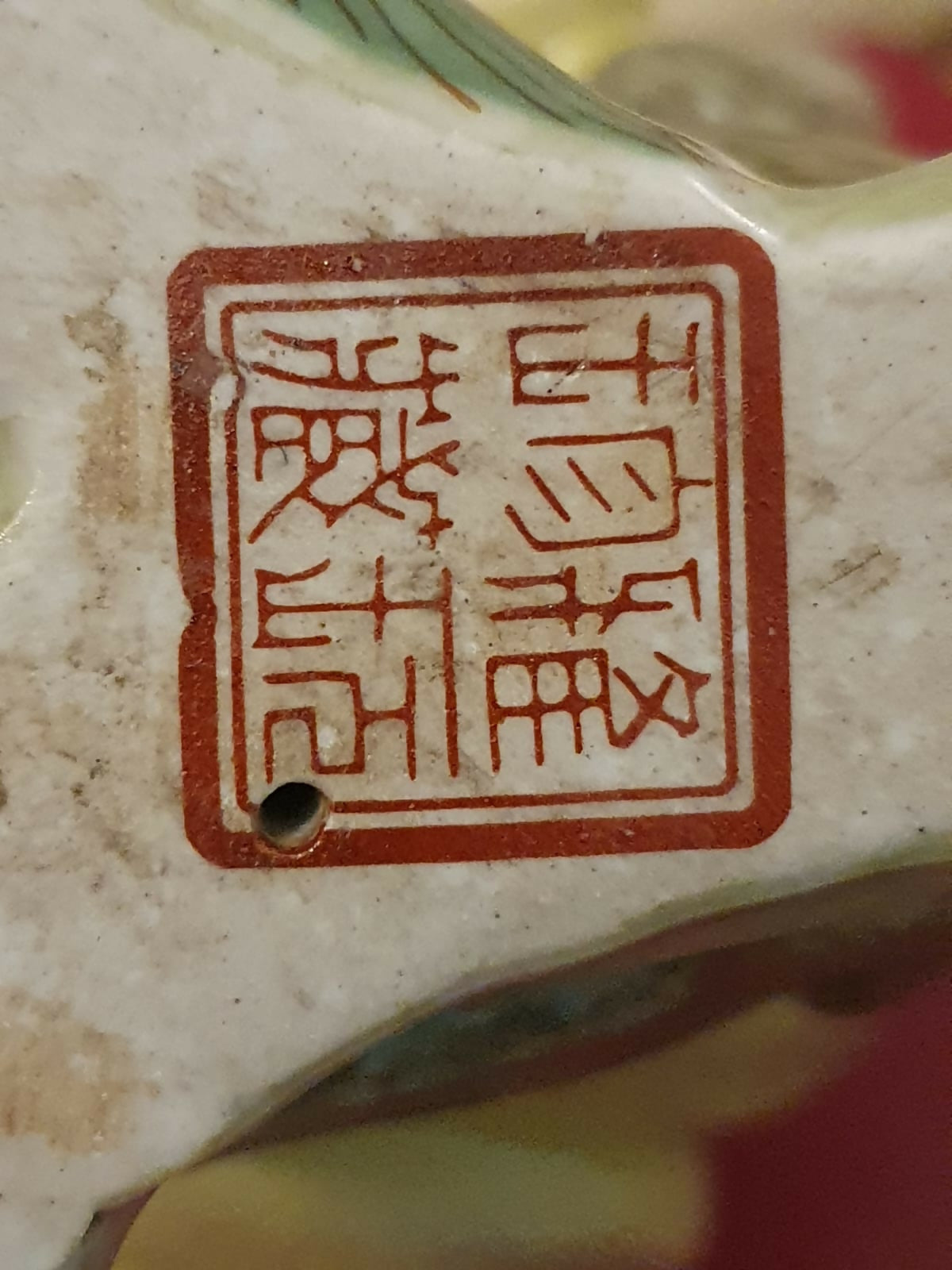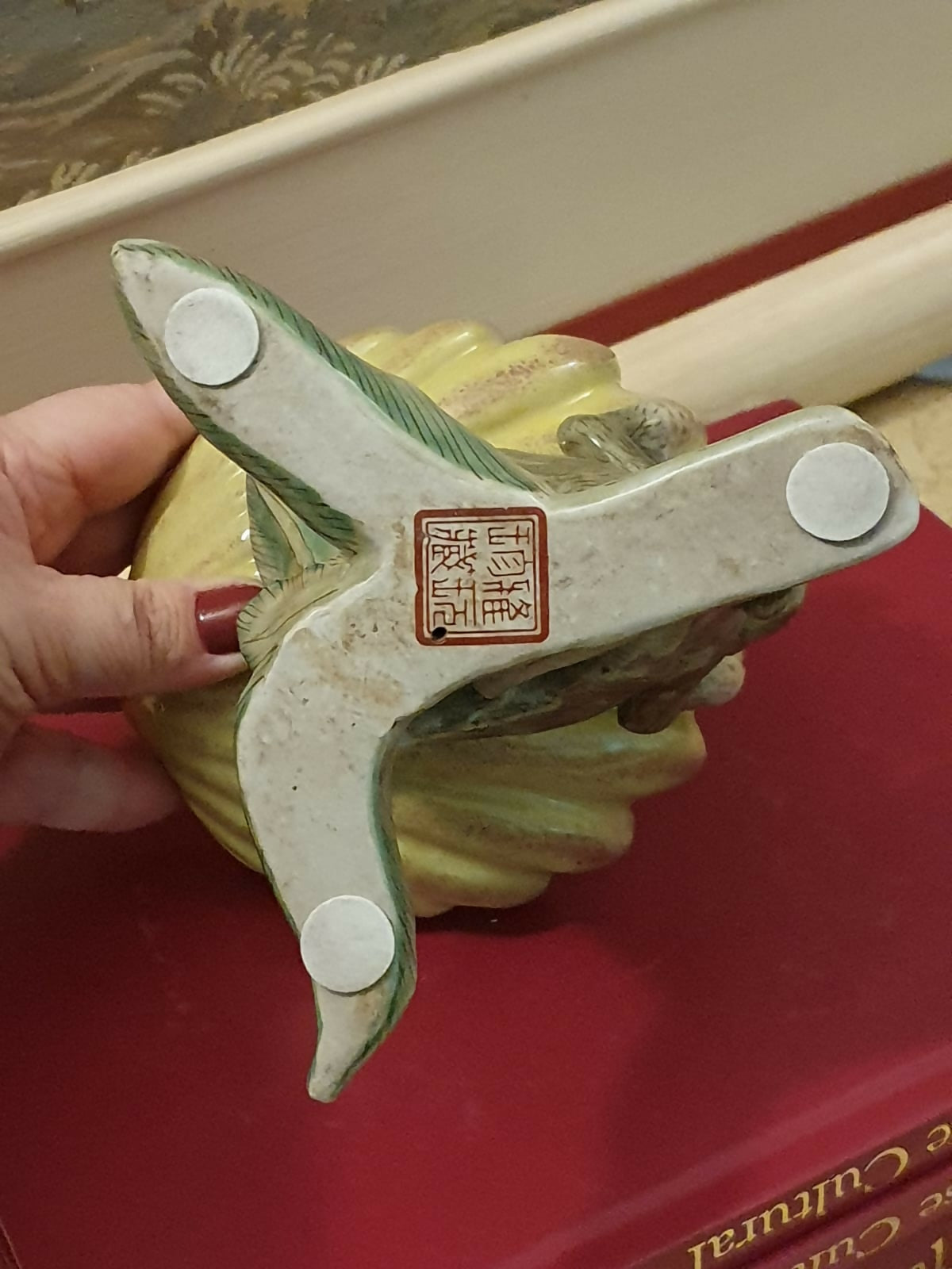 Escultura em cerâmica chinesa vintage, em formato de macaco segurando uma folha / concha. Perfeito estado!