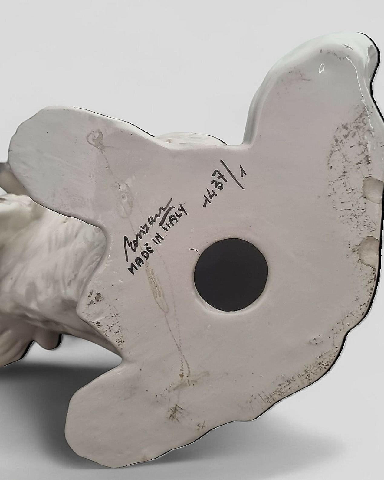 Escultura italiana em cerâmica do artista Giovanni Ronzan, representando um elegante cachorro da raça Cocker. Peça assinada e numerada, produzida na Itália por volta de 1950. Trabalho de excelente qualidade, típico do refinamento artístico de Ronzan, um dos grandes nomes da cerâmica italiana do século XX.